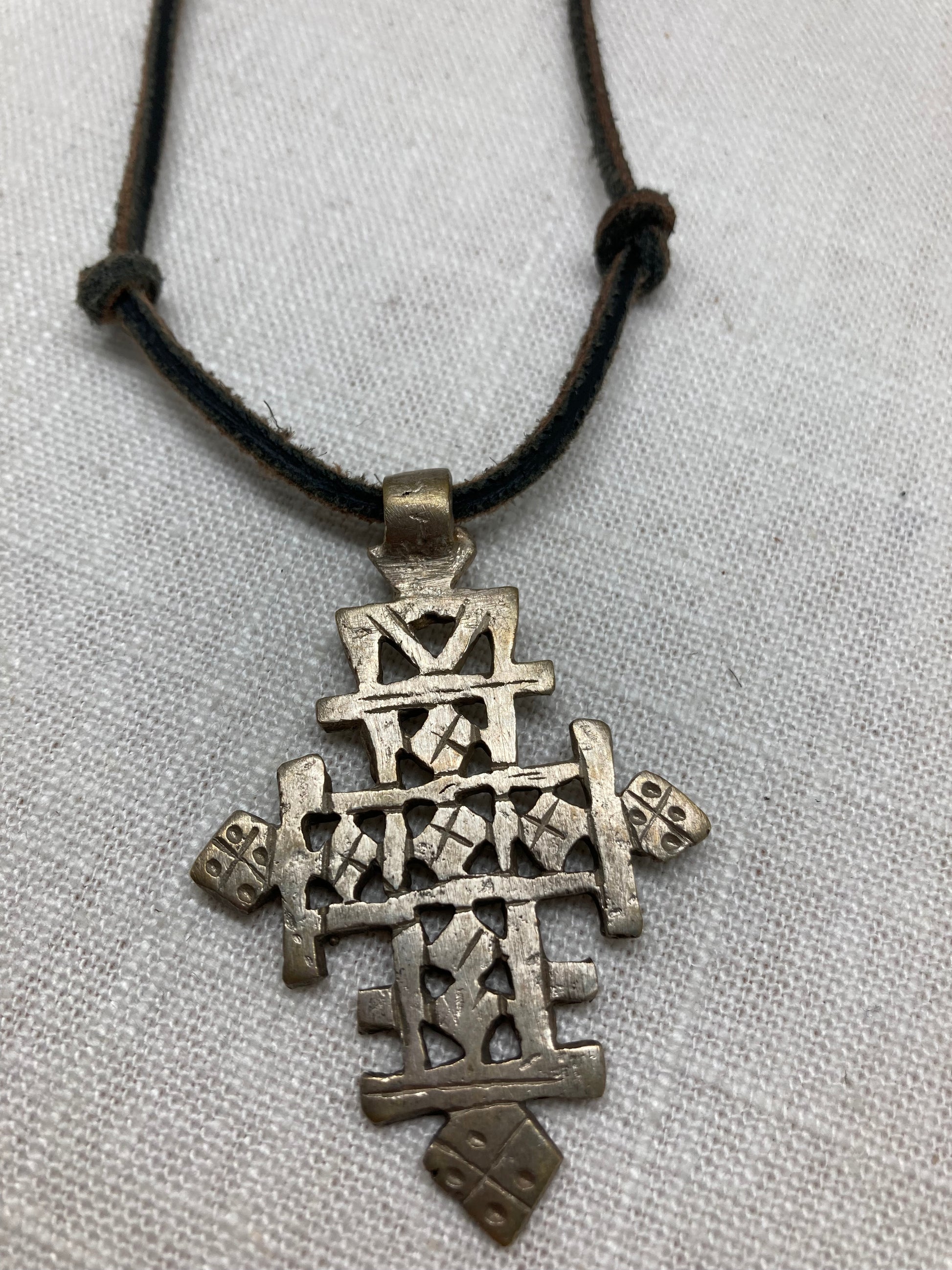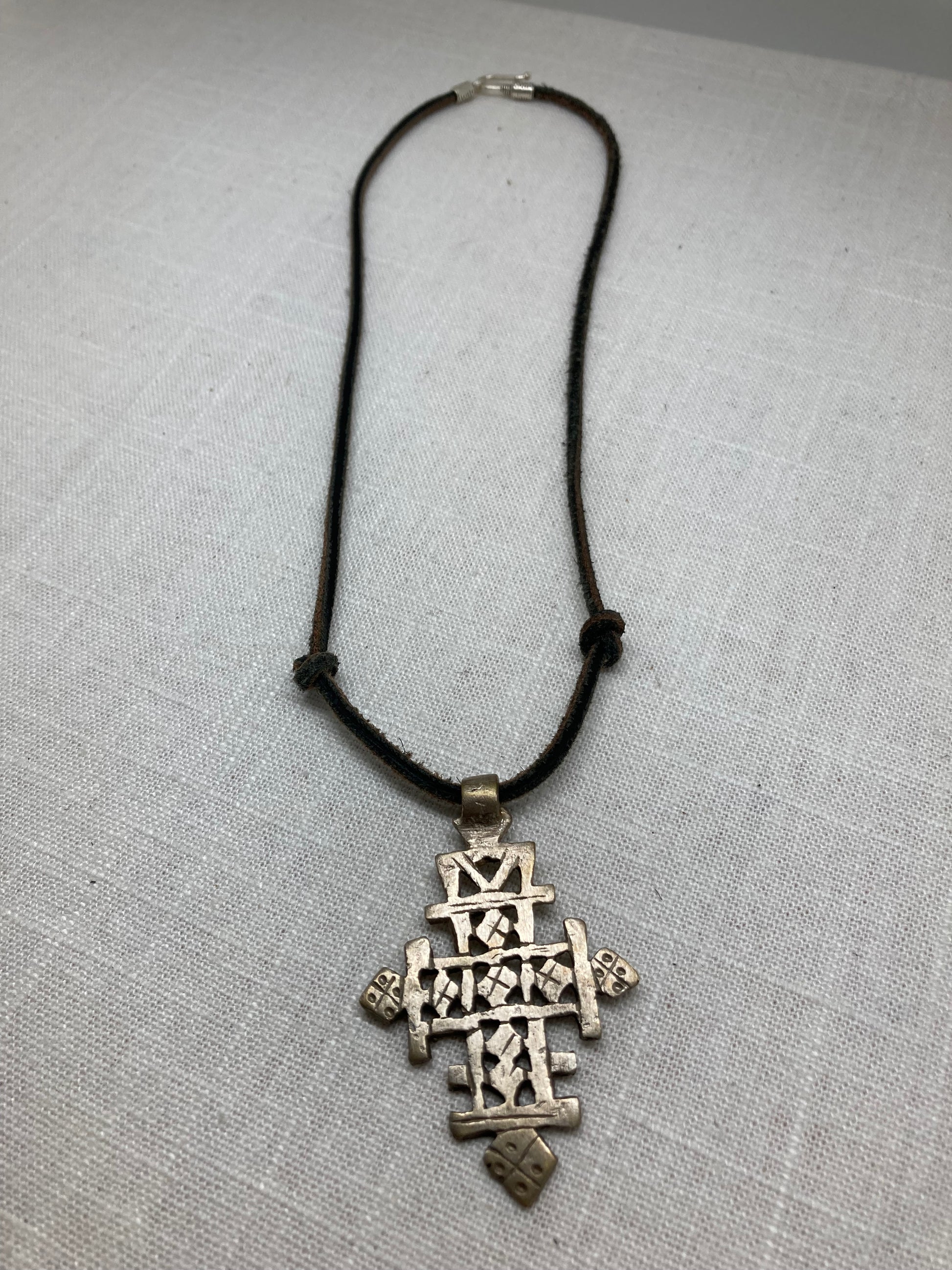 A gorgeous African pewter cross is shown off on the faded black leather cord.