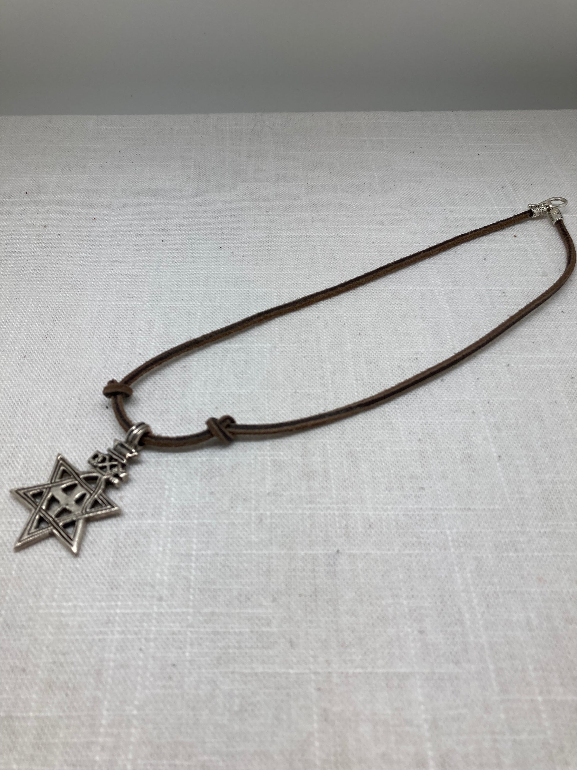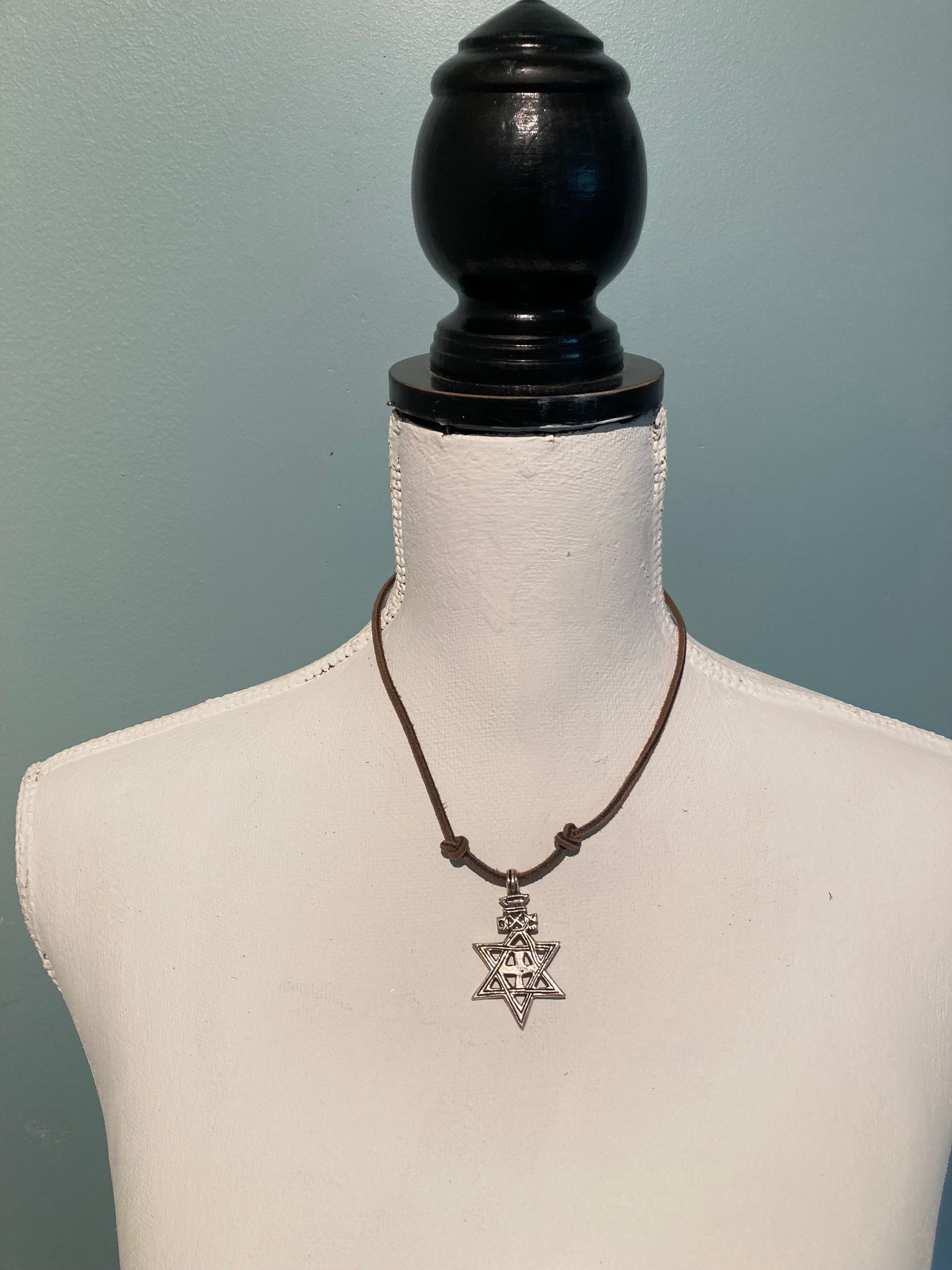 Gorgeous pewter six point star on a choker length rustic brown leather cord.