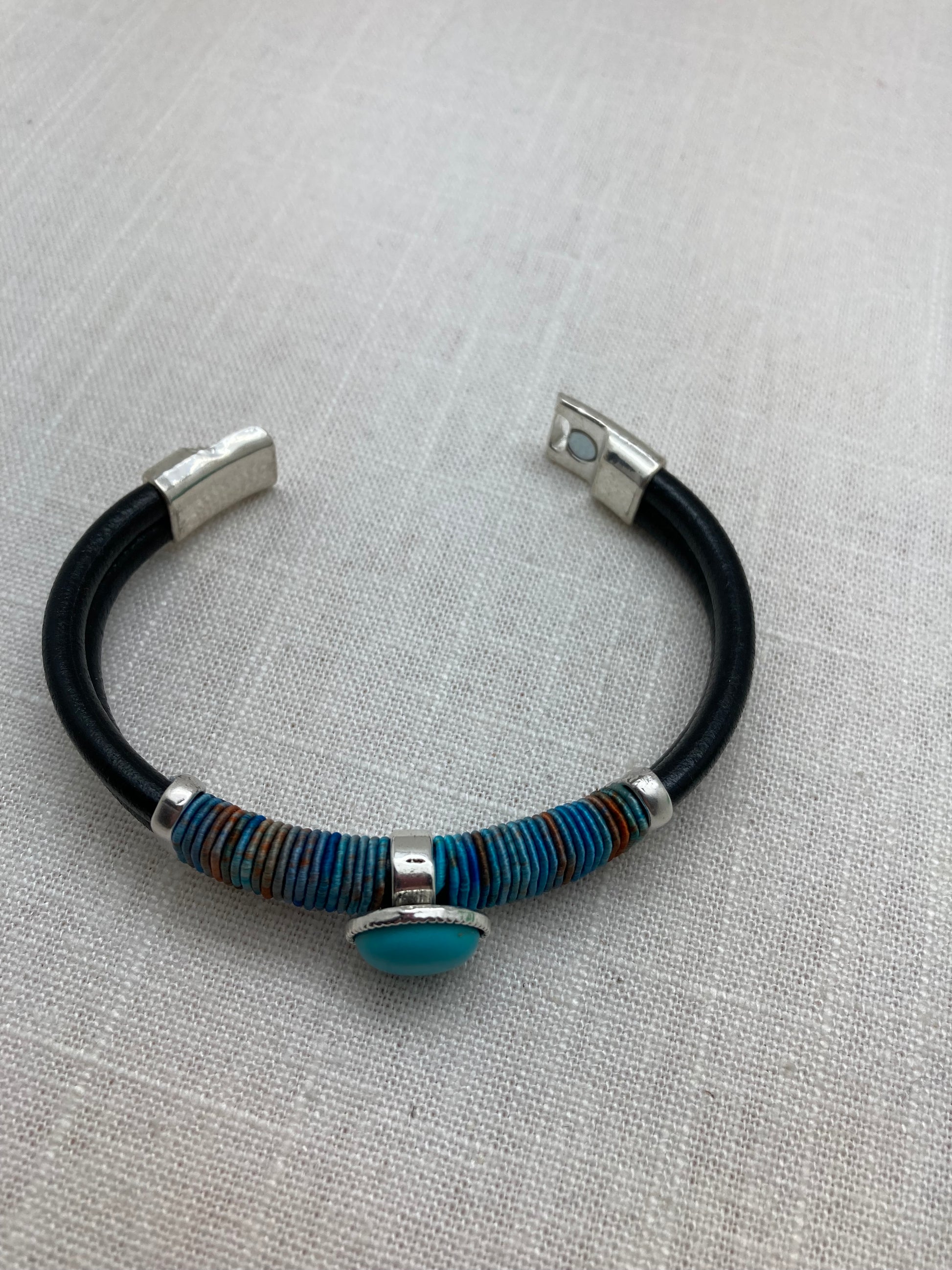 Two strands of thick rustic black leather cord are wrapped in shades of blue and rust and completed with a strong magnetic clasp.
