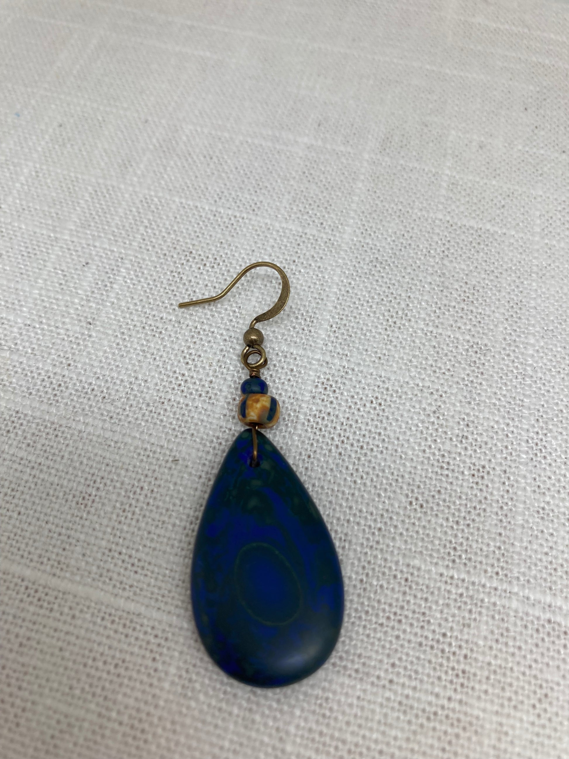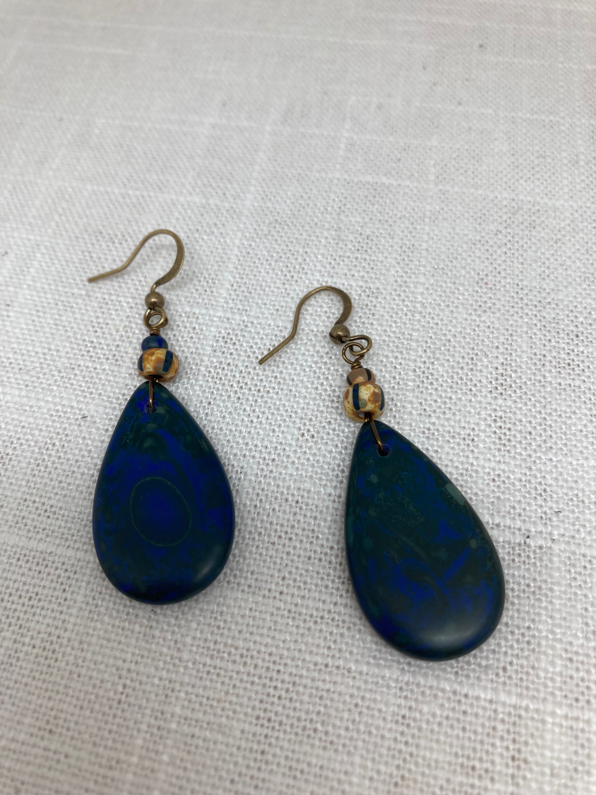 These are blue and green pressed glass teardrops with rustic matte glass accent beads.