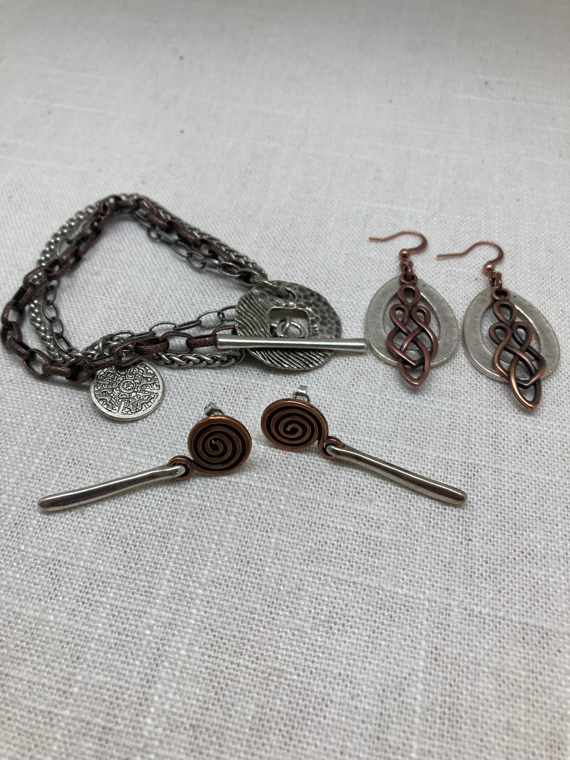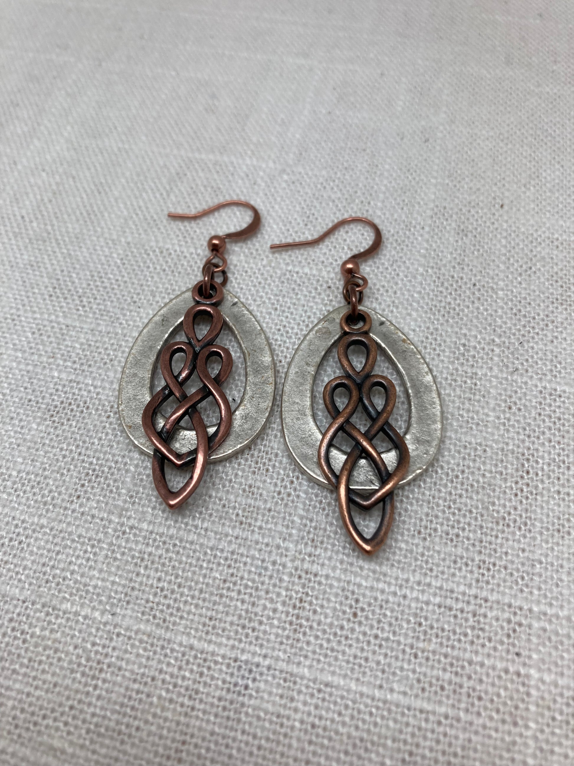This combination of a hammered antique silver Turkish teardrop charm and an antique copper knot make the perfect everyday earring. They pair great with other silver pieces and the copper makes them autumn ready. Check them out with the Destash bracelet.
