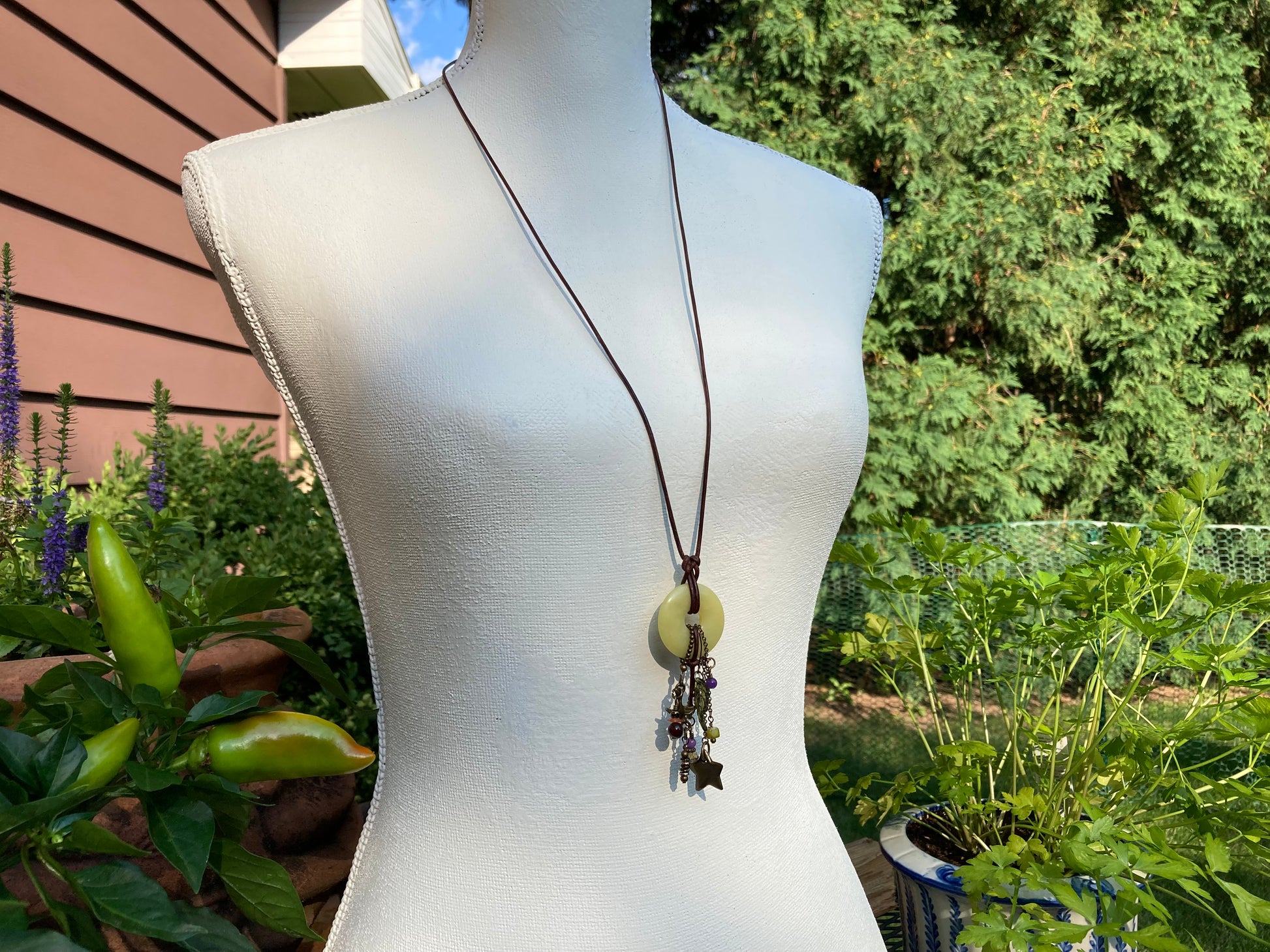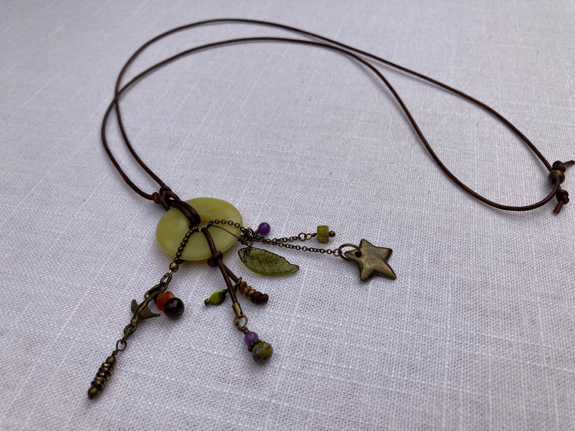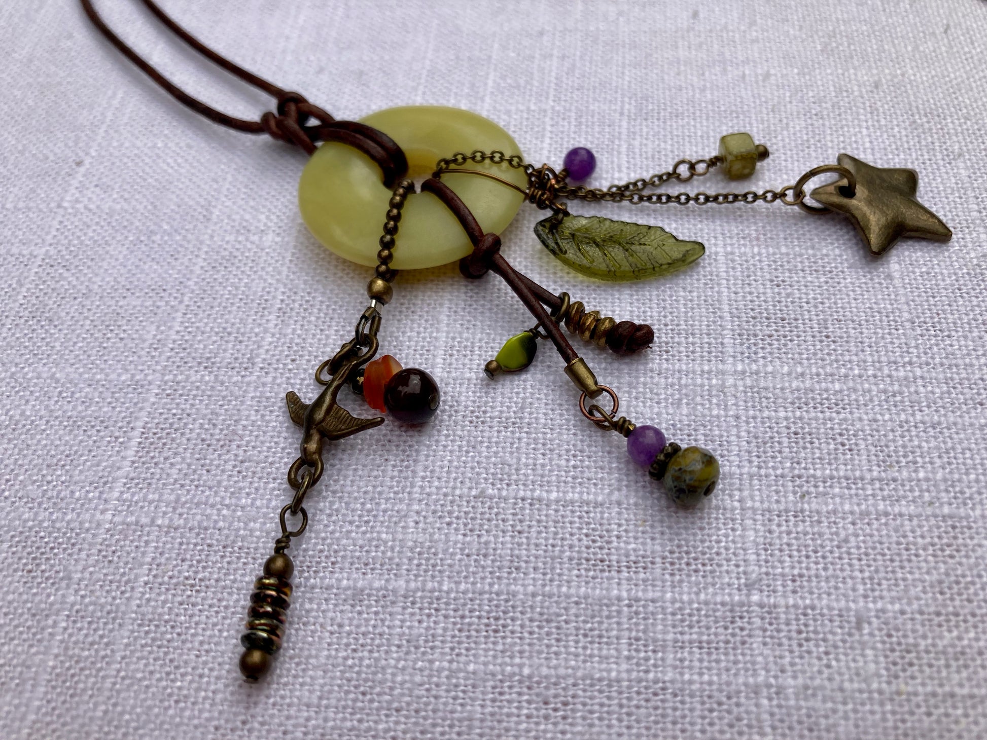 I used a yellow green donut to hang a variety of fun, coordinating charms. The donut is suspended from a deep brown length of supple leather.