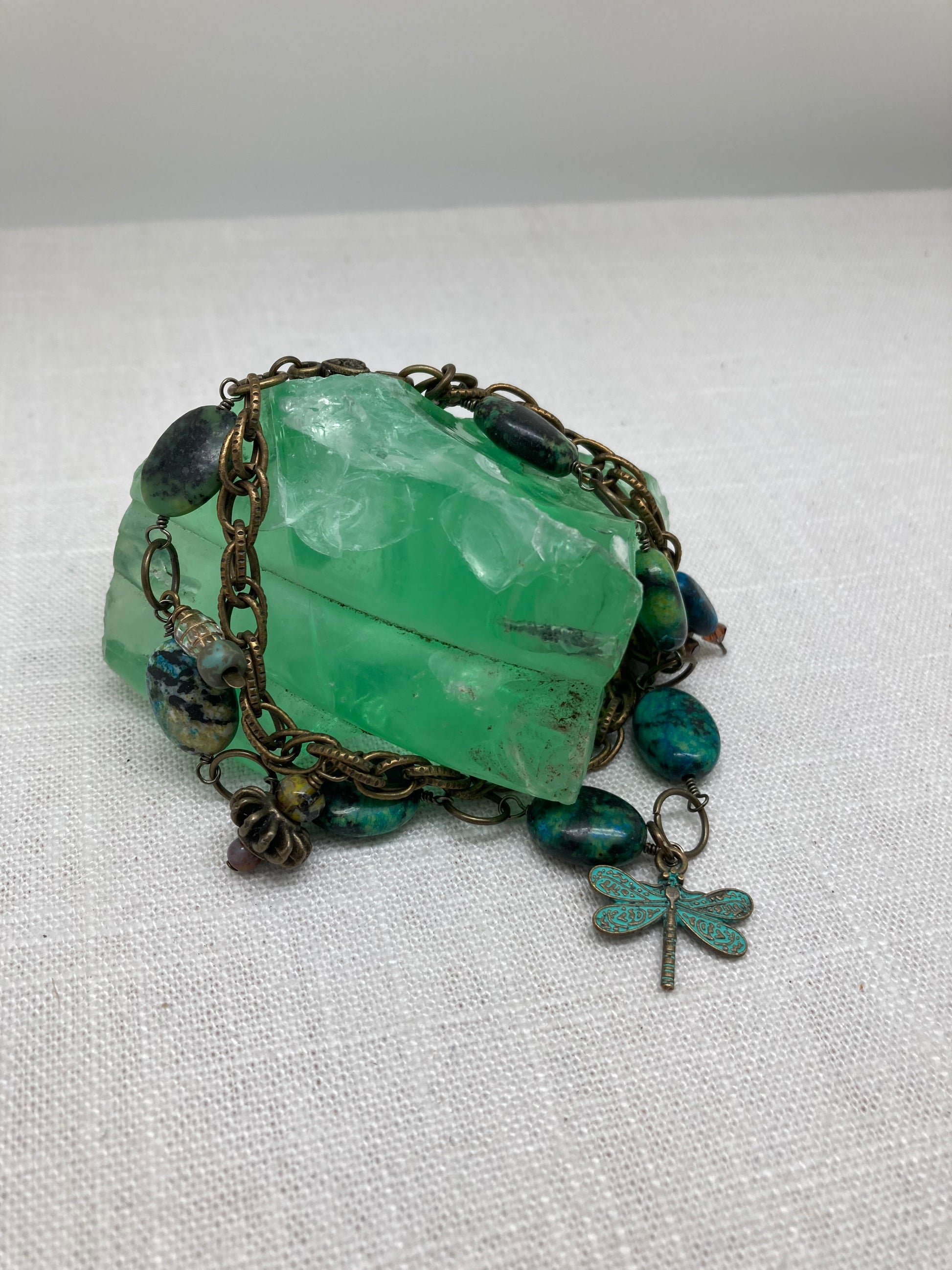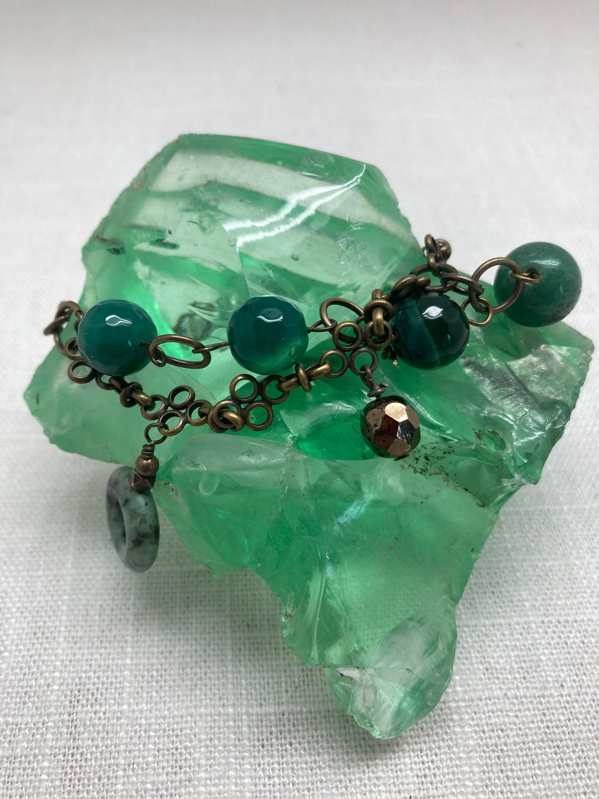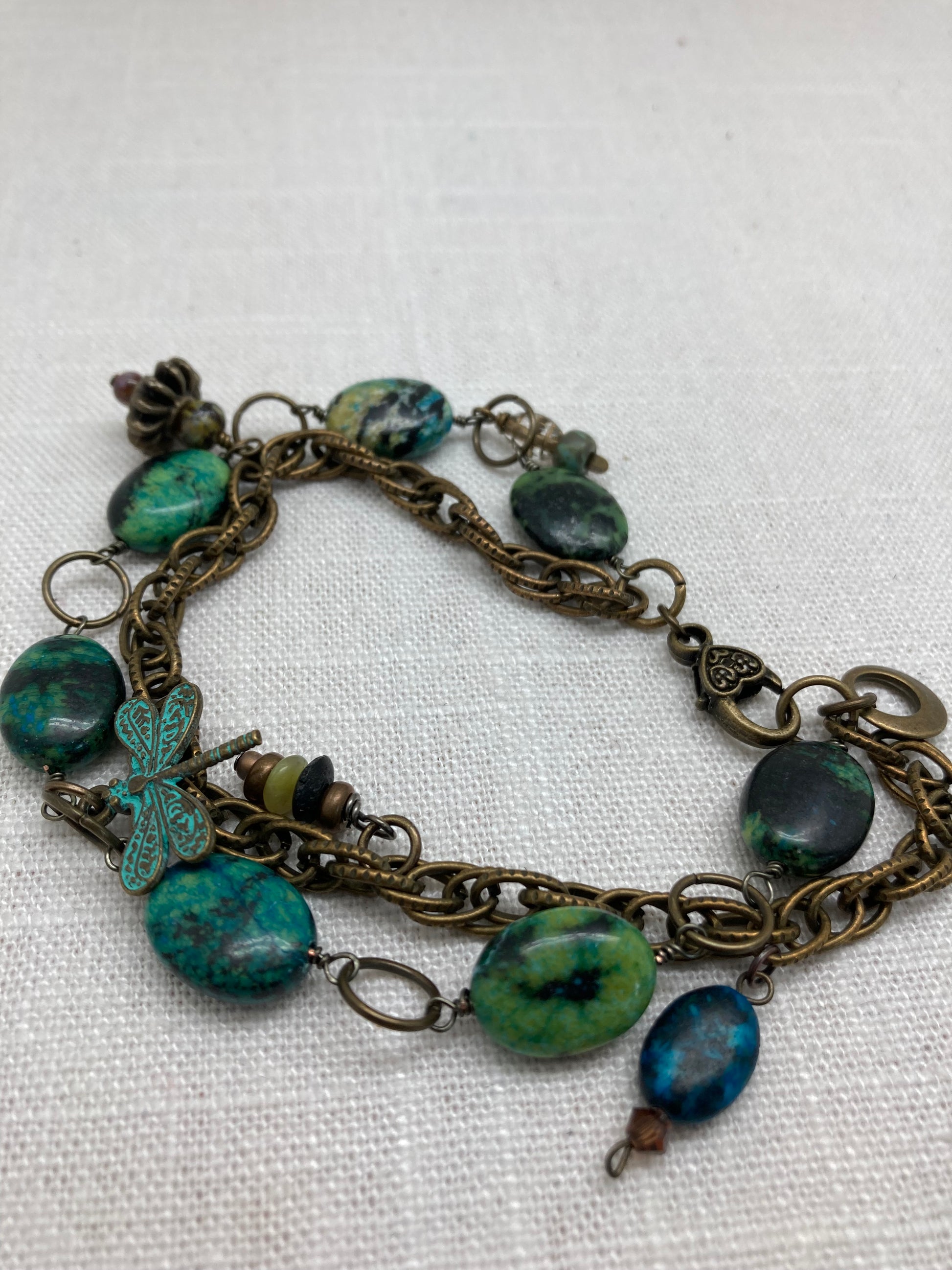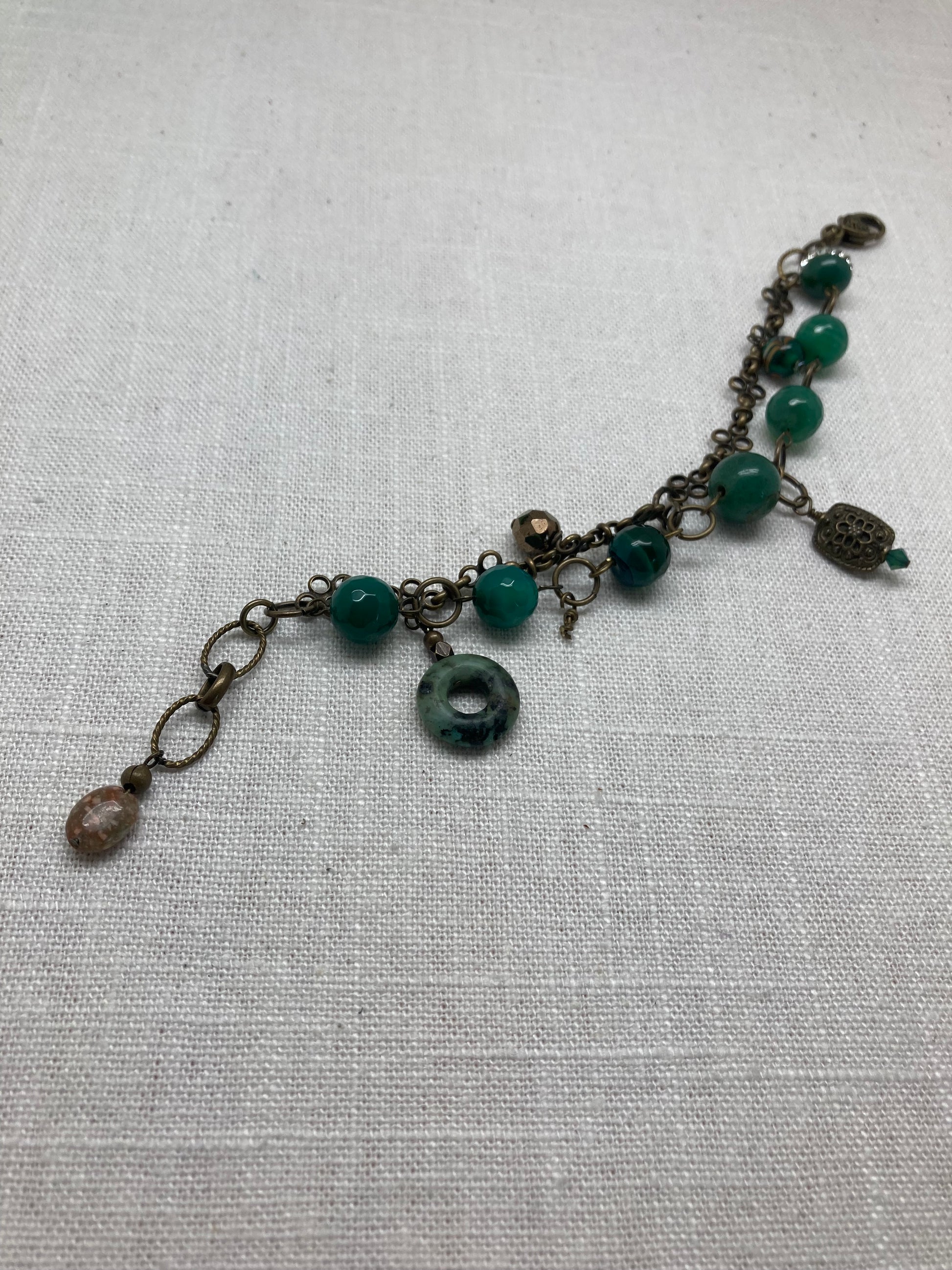 Dyed agate round gemstones combined with a vintage brass chain and various charms.