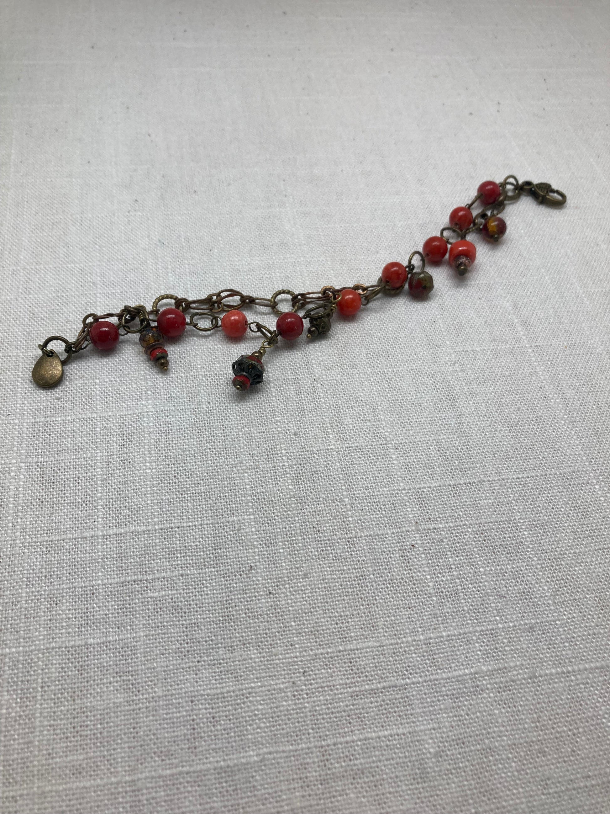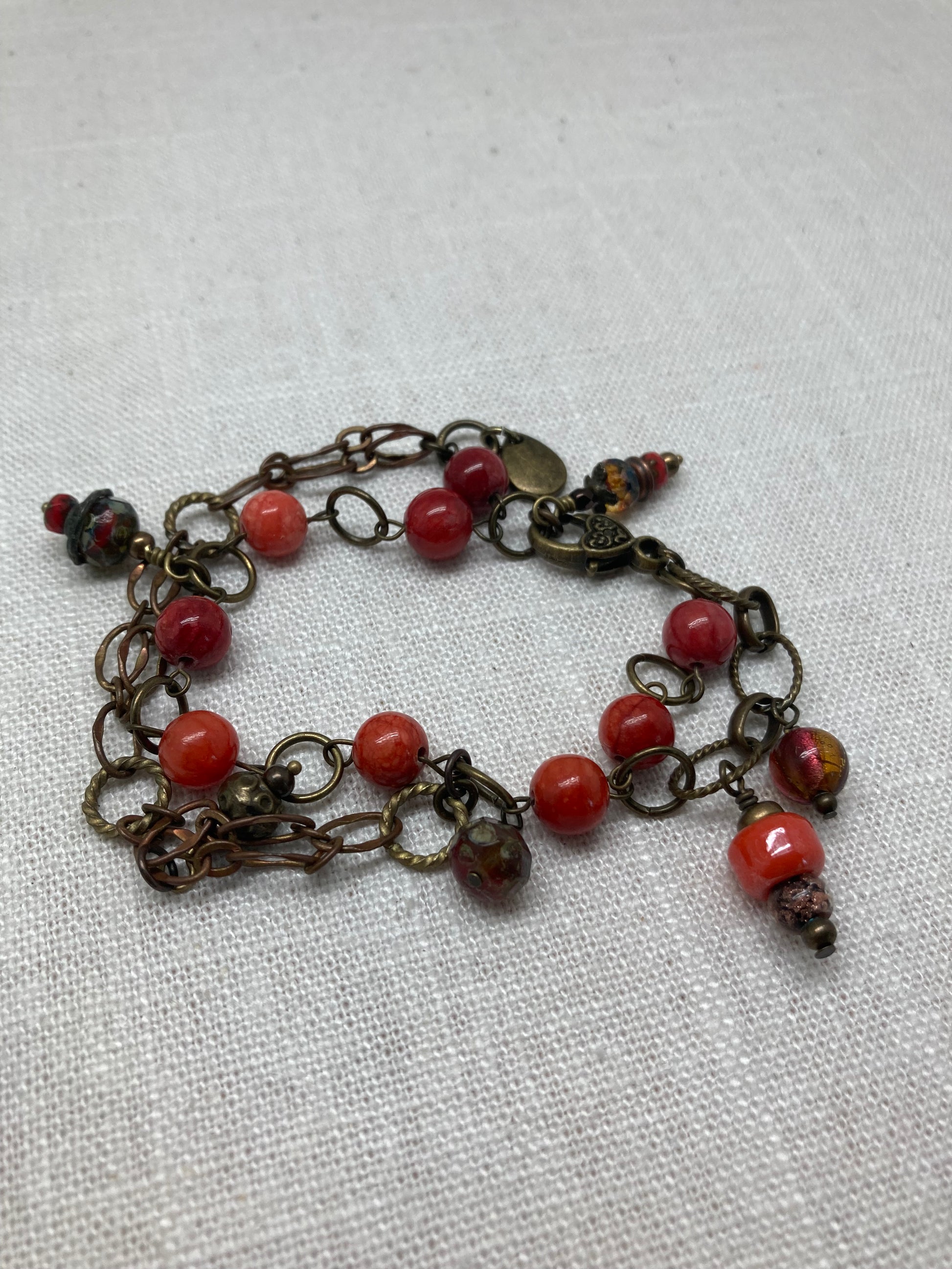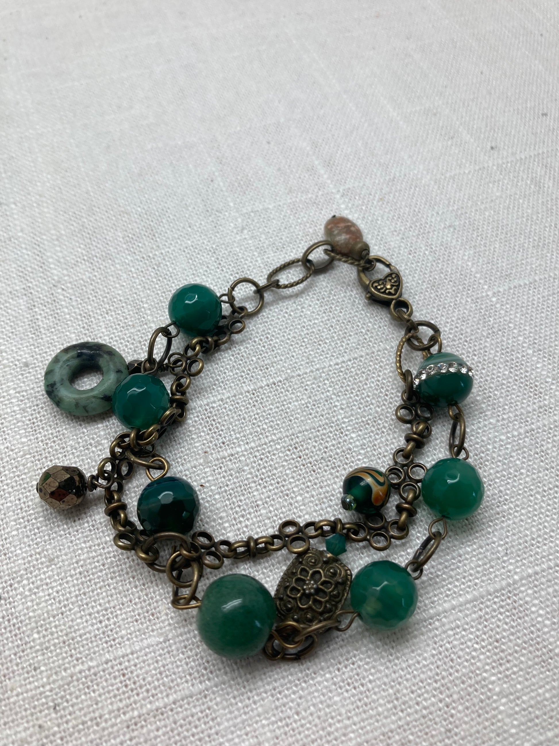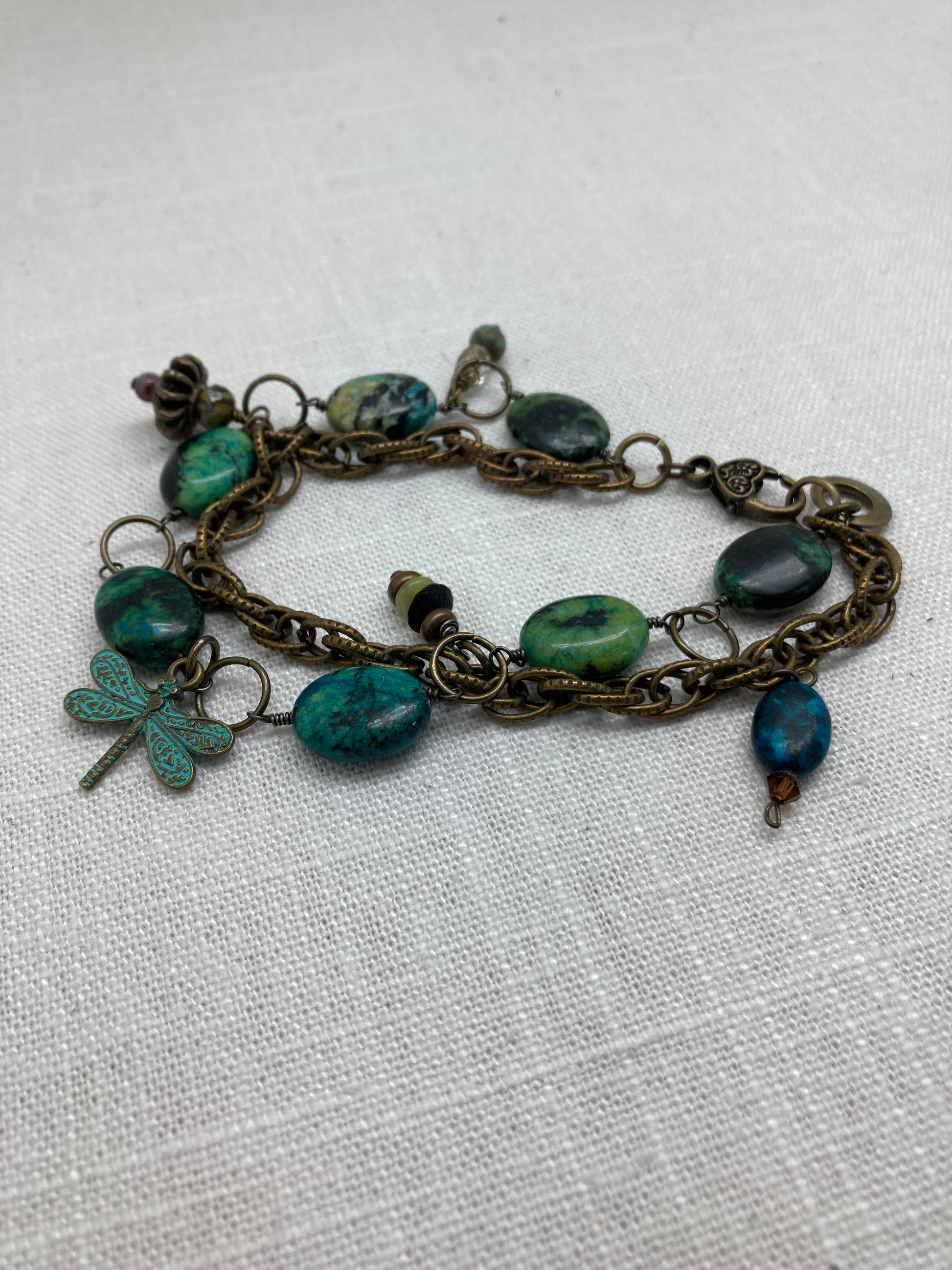 Dyed agate round gemstones combined with a vintage brass chain and various charms.