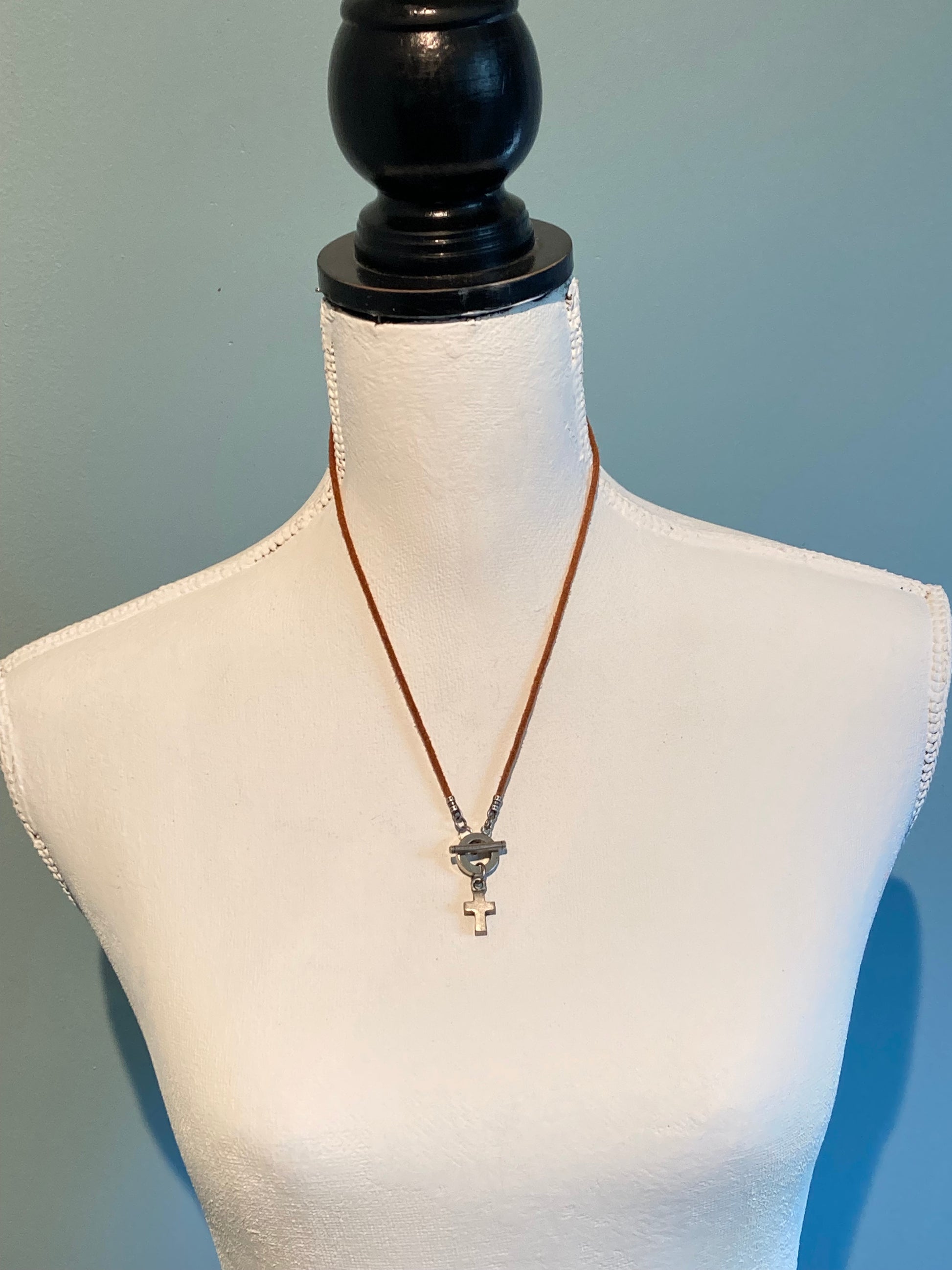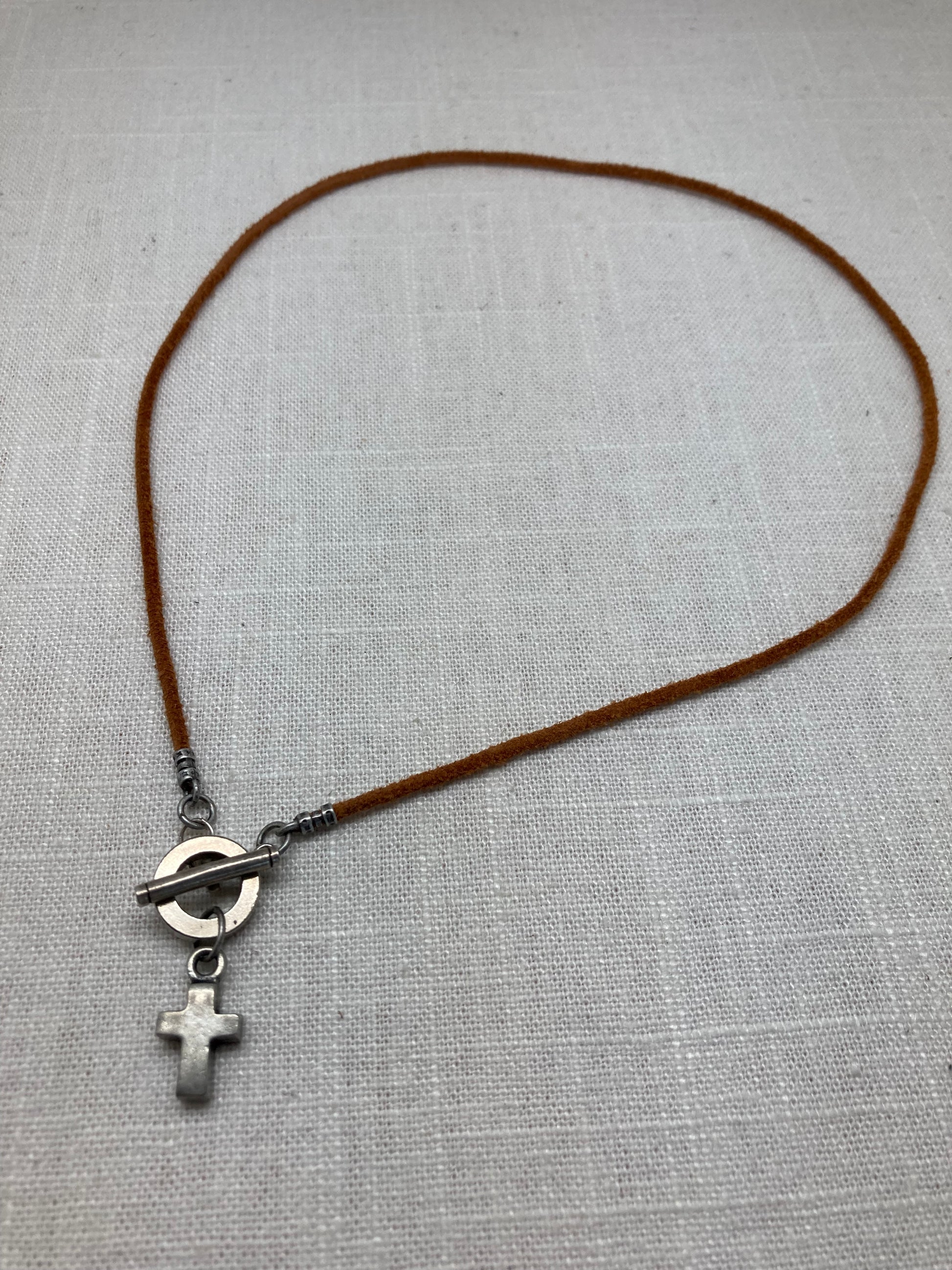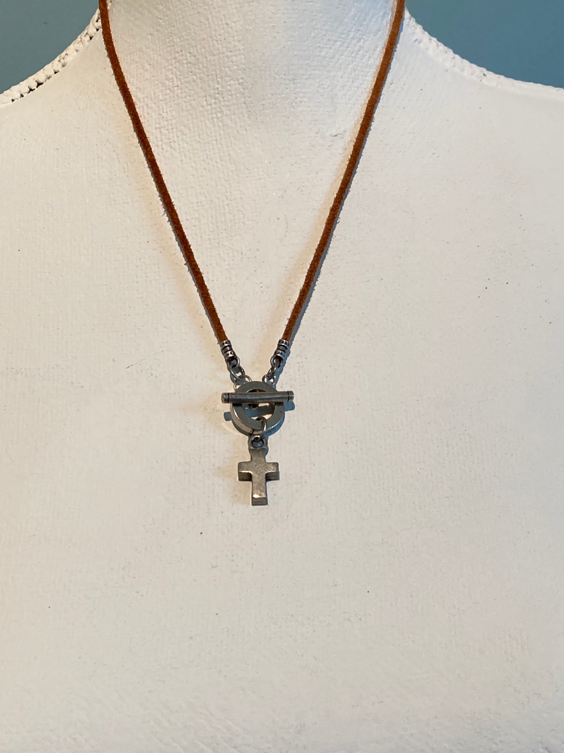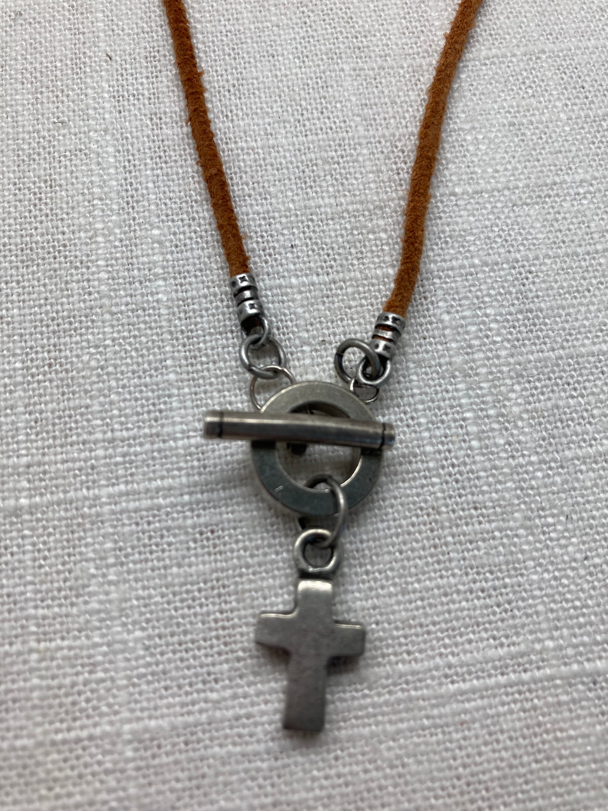 I love this red-brown suede paired with antique silver. I used a chunky toggle and a tiny cubic cross for a simple, casual necklace.