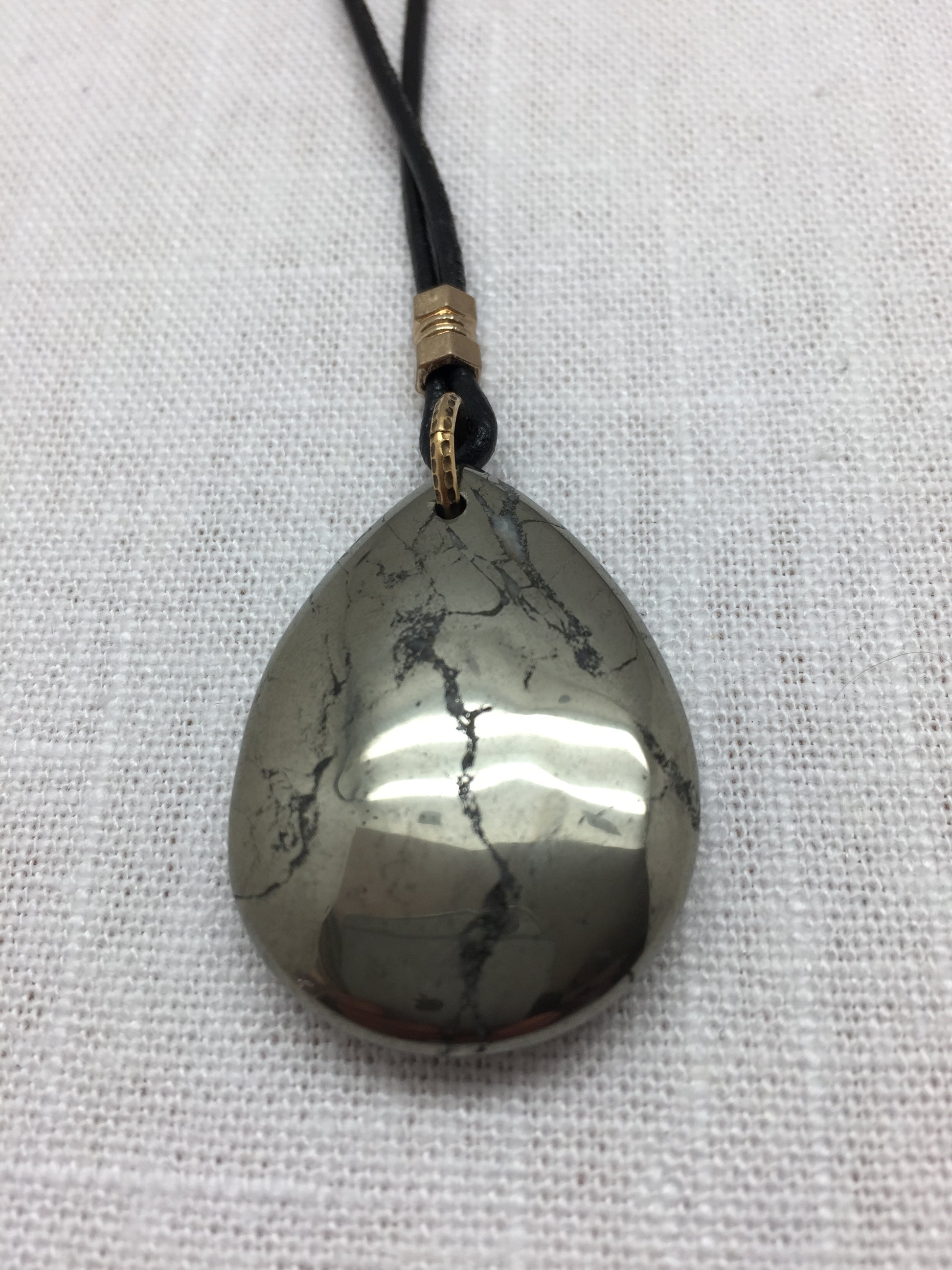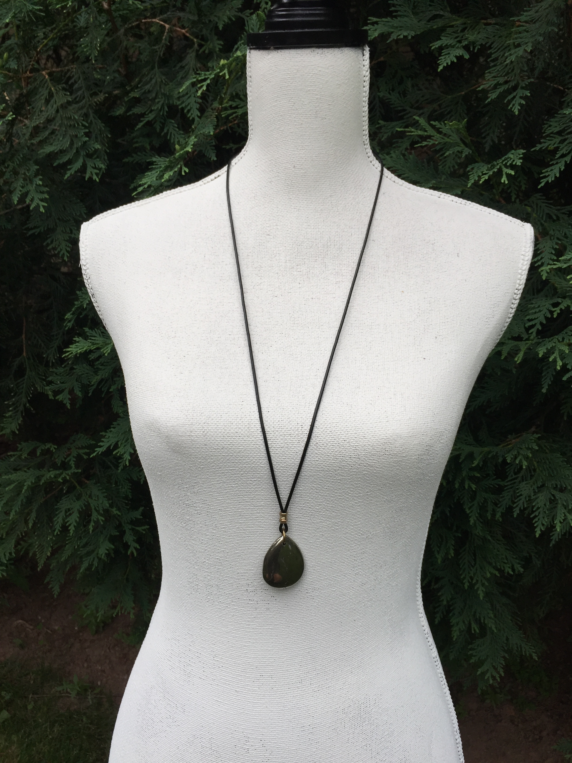This eclectic pendant necklace is simple yet elegant. The polished pyrite teardrop measures 1 1/2 inches. The necklace is adjustable from 18-36 inches.
