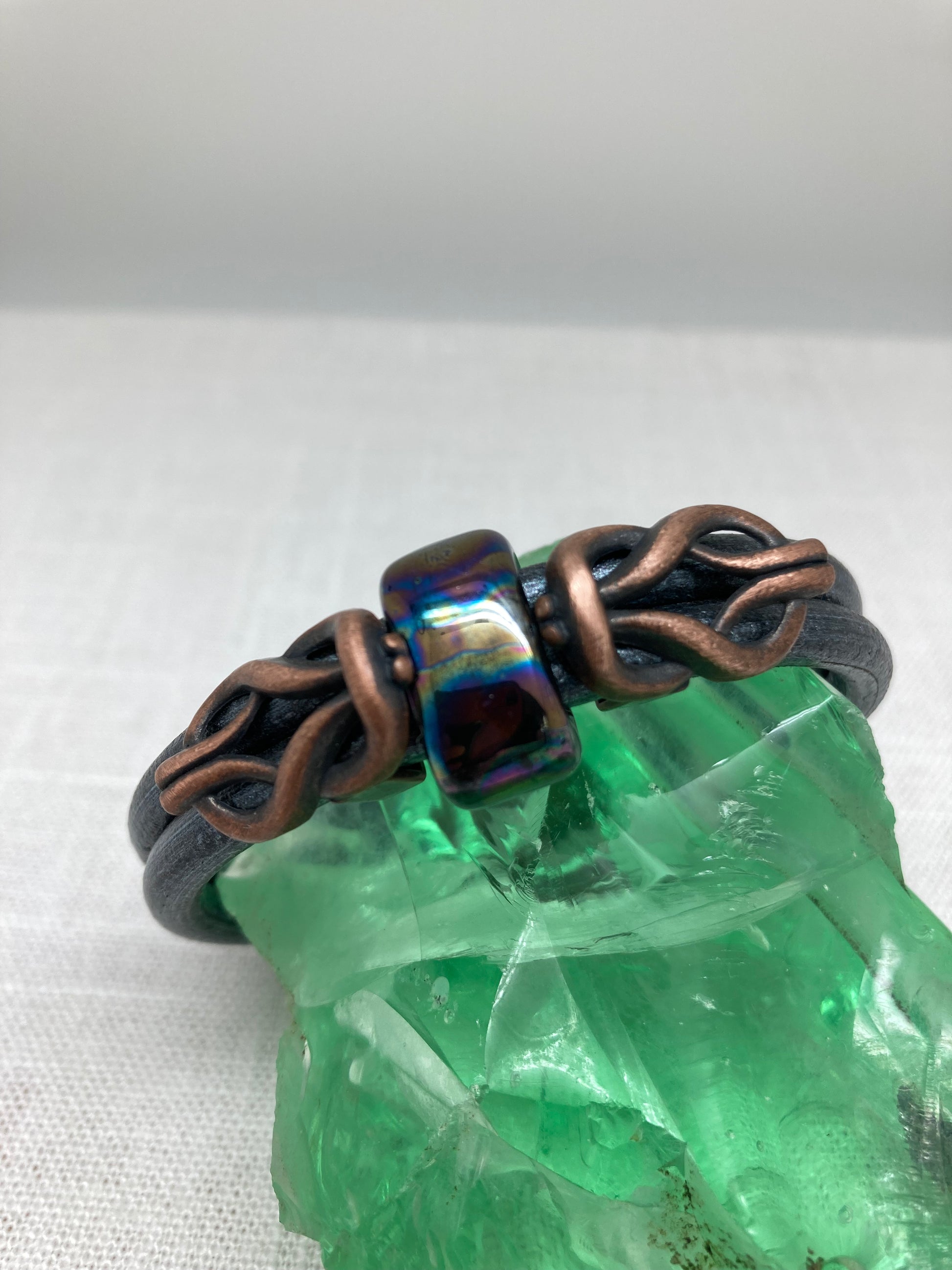 These fun bracelets feature copper knots surrounding highly polished ceramic beads.