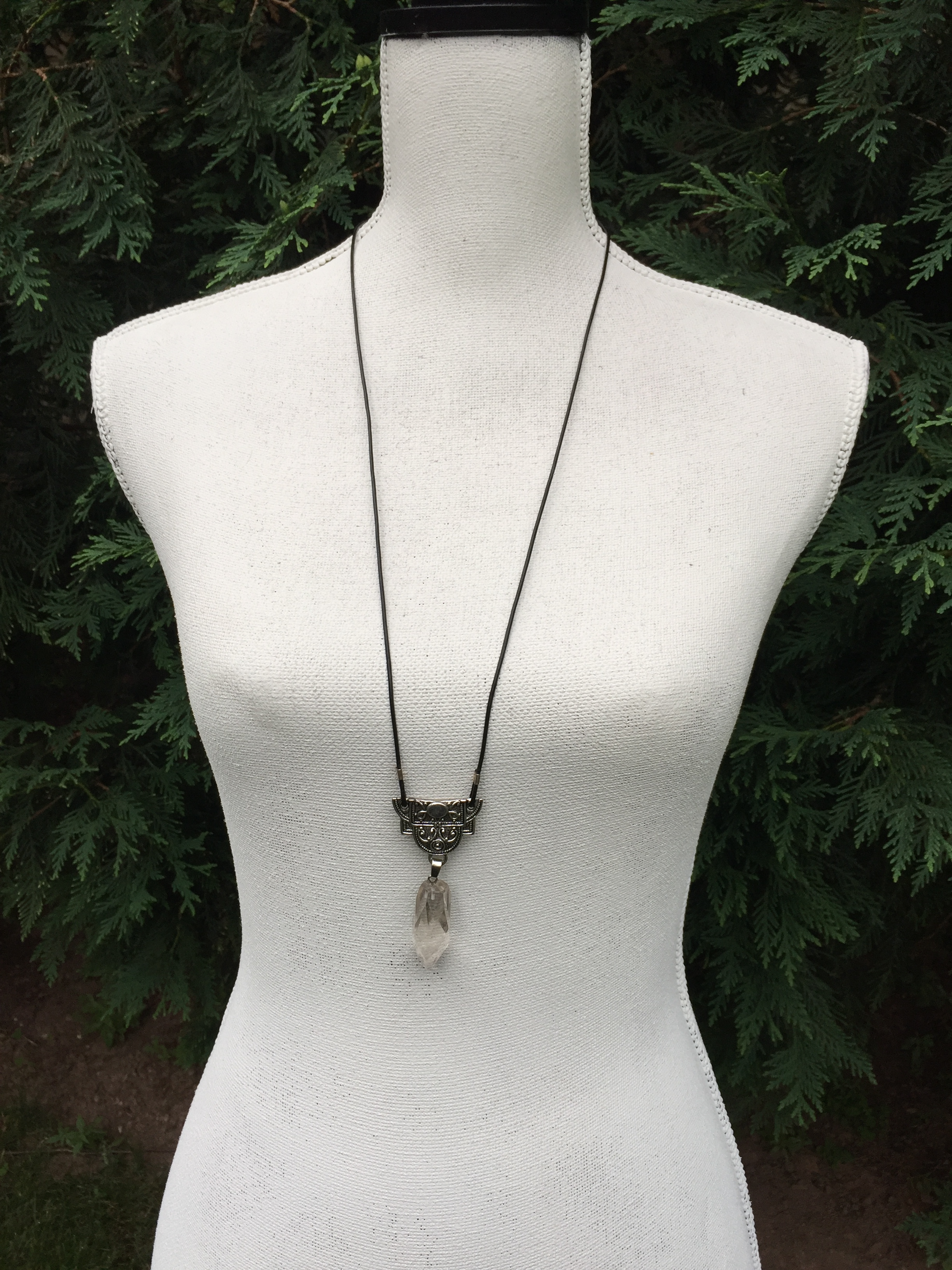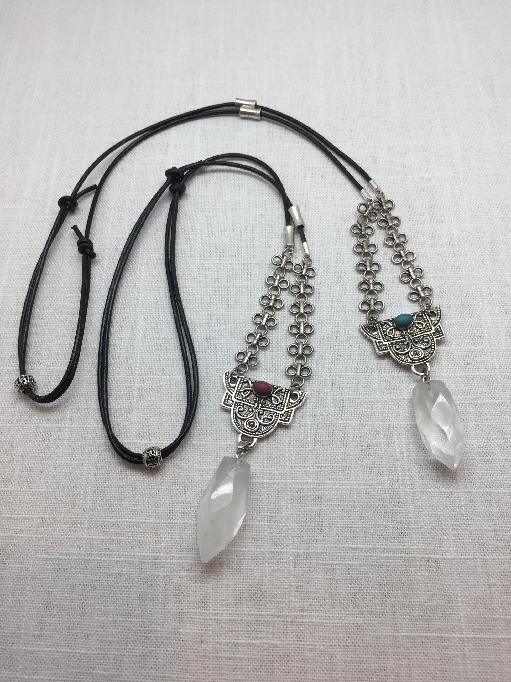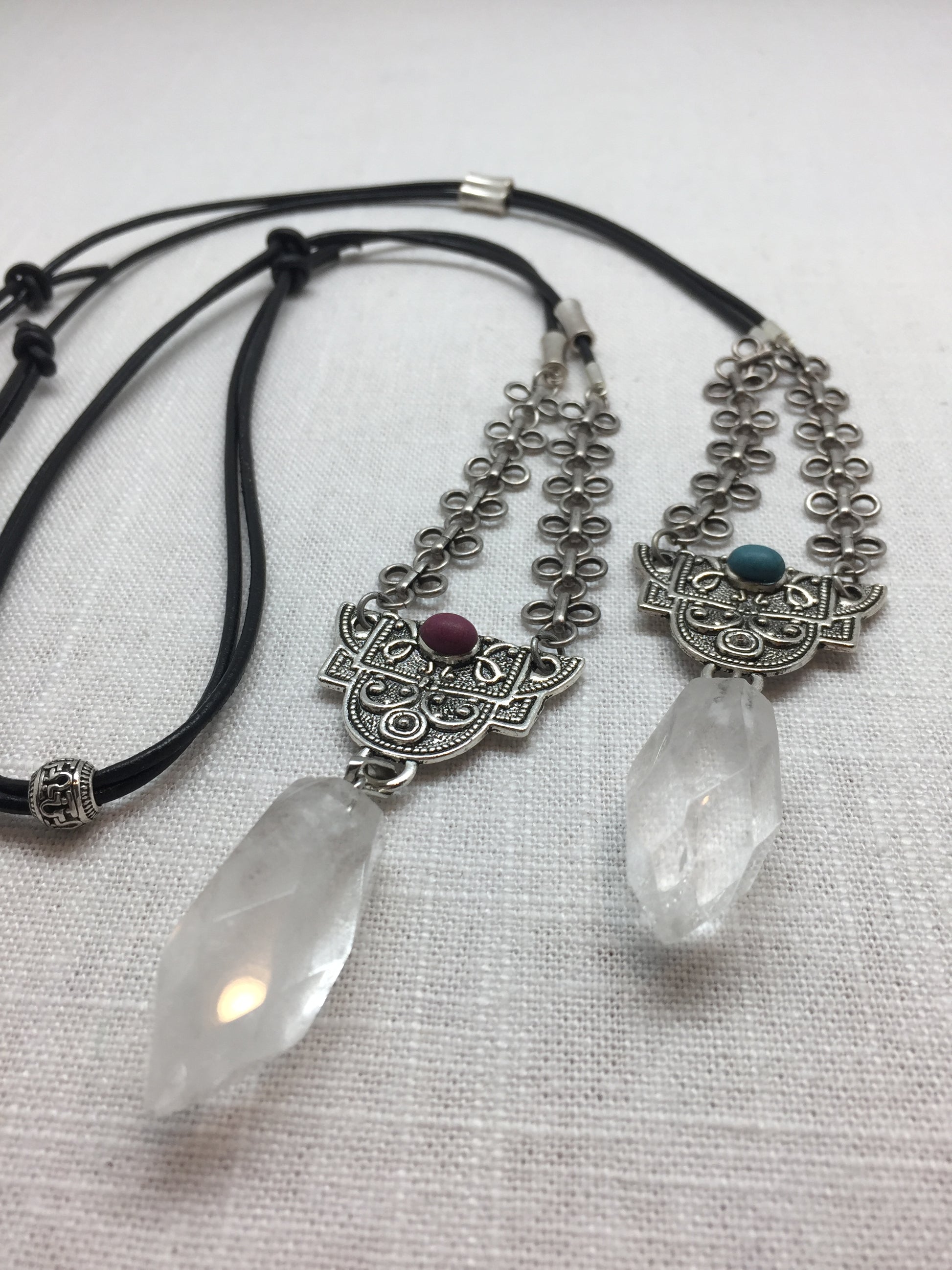 A beautiful 1 1/2 inch crystal is suspended from an adjustable soft black leather cord. The focal is finished with a coral or turquoise oval cabochon.