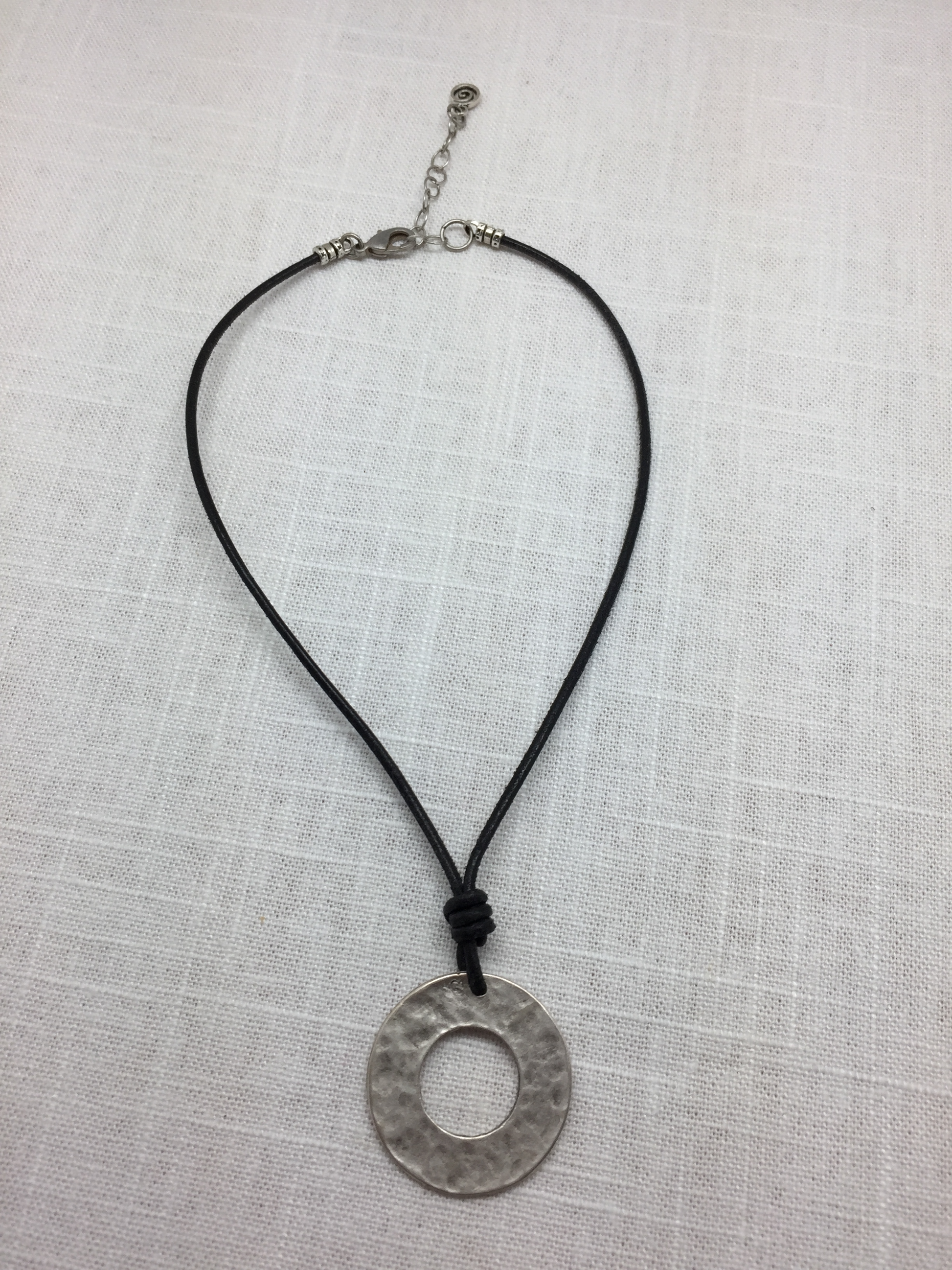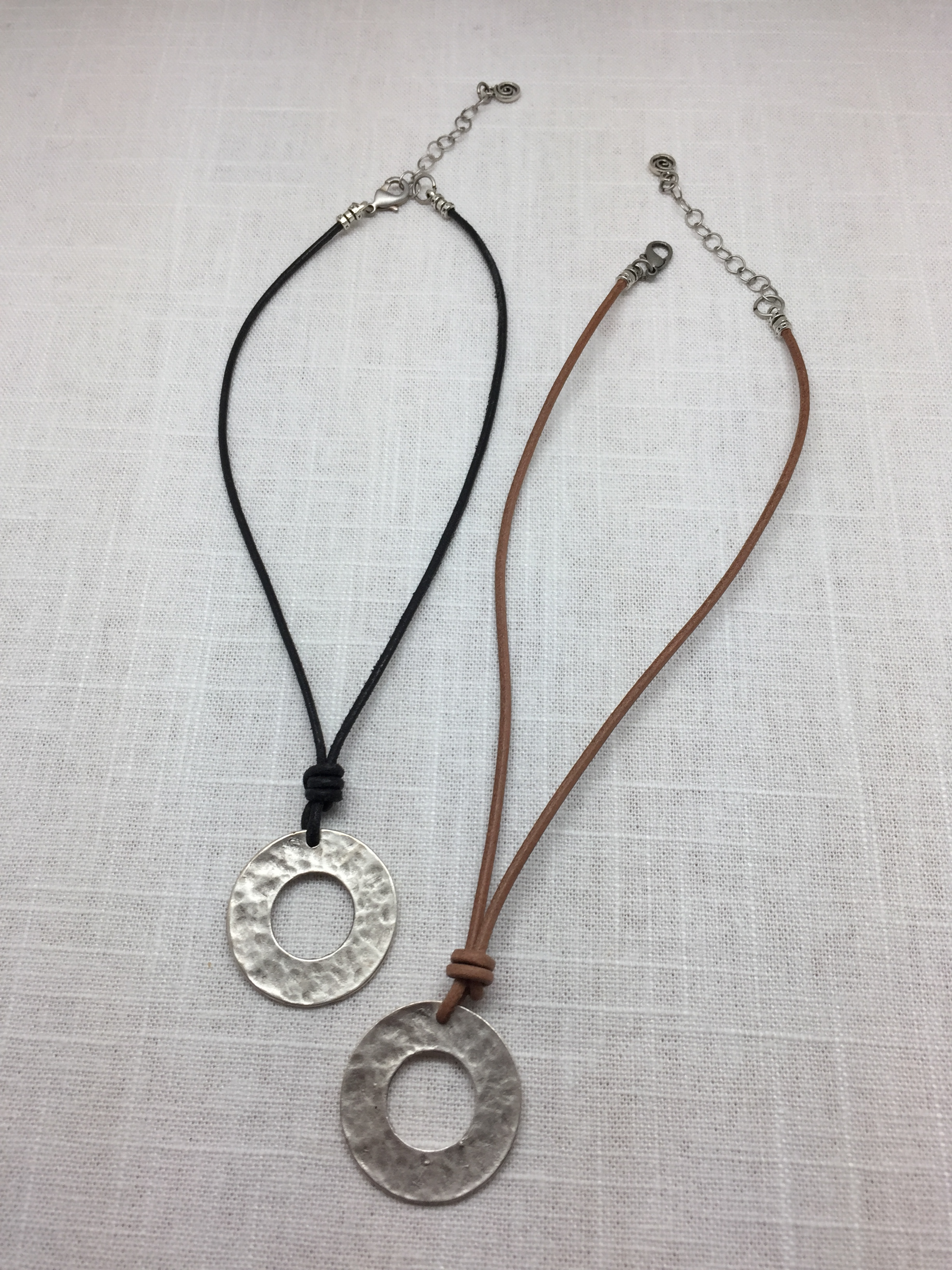This beloved bebop original is a casual hammered silver donut charm knotted on rustic leather. Available in medium brown, dark brown or black.