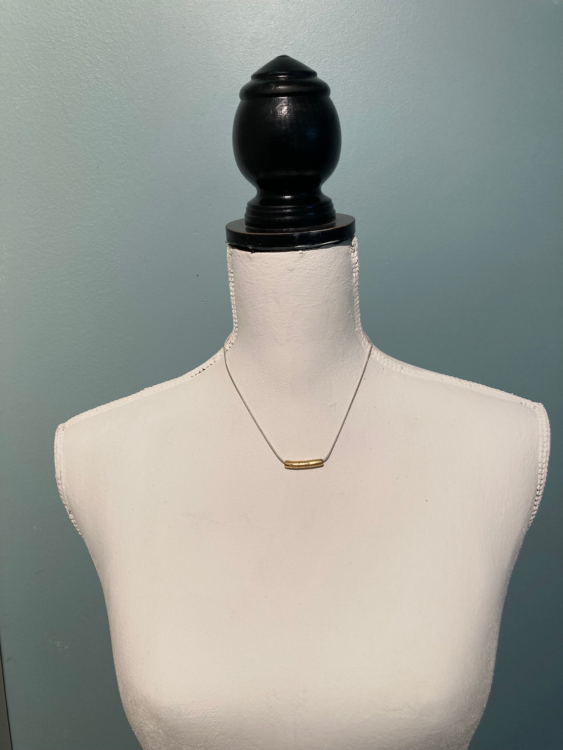 This stunning antique gold tube contrasts beautifully with the elegant silver snake chain. The hand-crafted design is understated yet impactful.