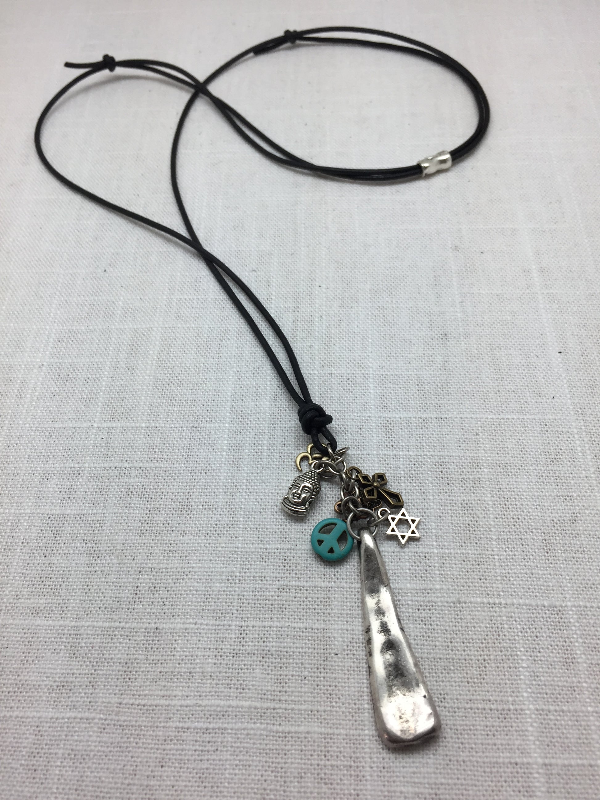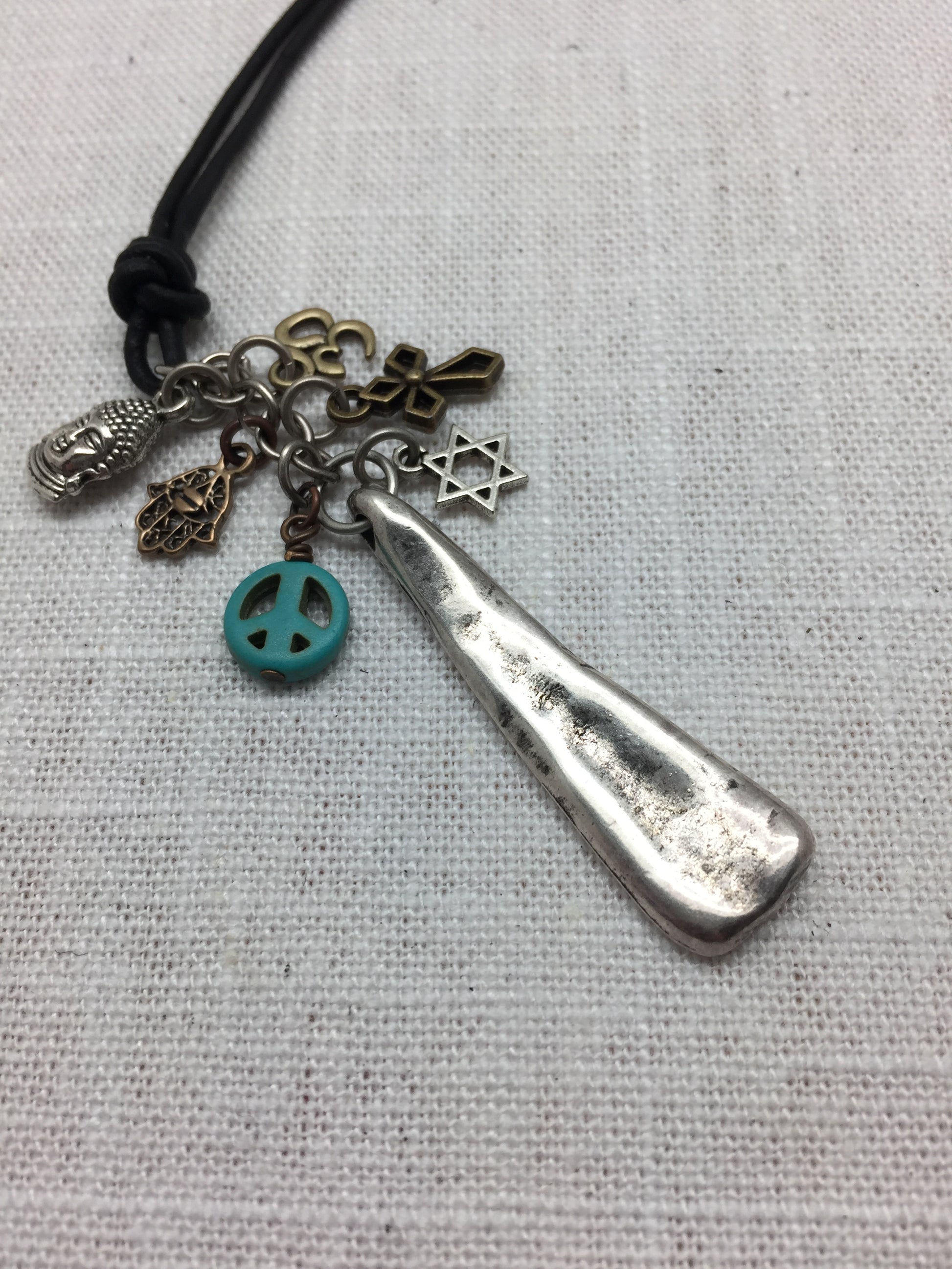 This necklace combines tiny mixed metal charms suspended above an organic silver plated bar to convey a hopeful statement