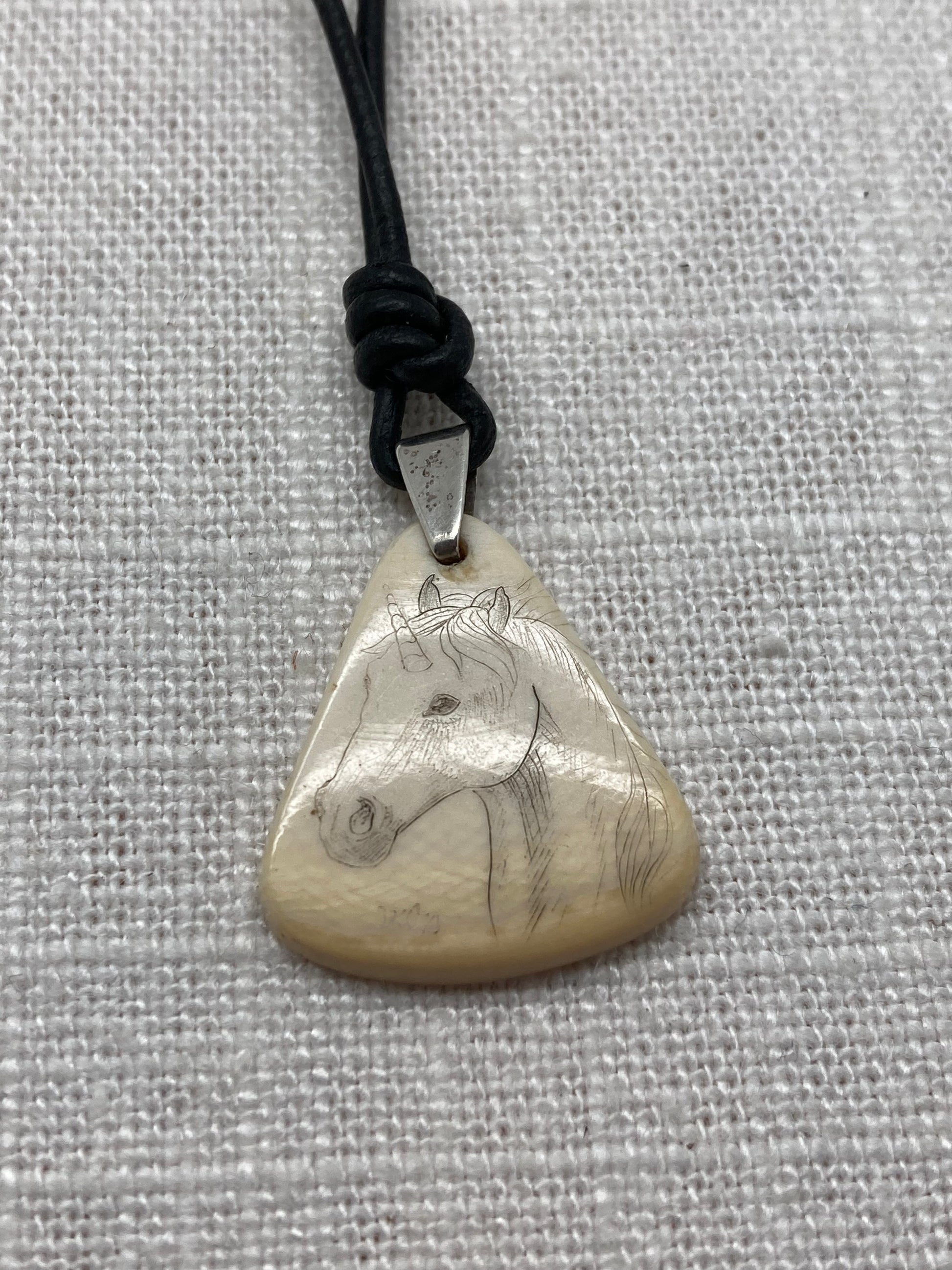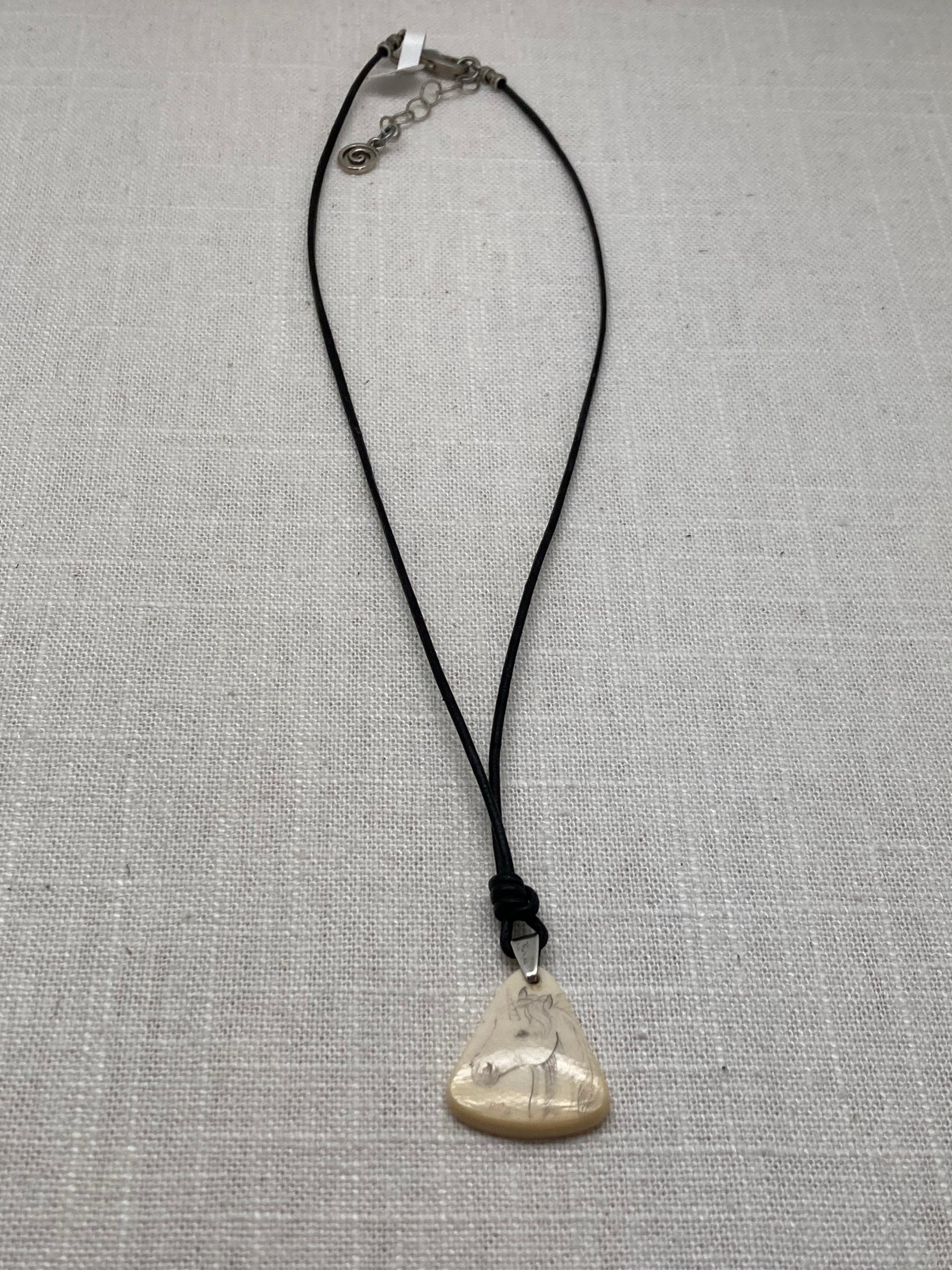 I found this etched piece at a garage sale and added it to a piece of plain black leather. I'm not sure if it's etched or painted or if it's shell or ivory but it is very cool.