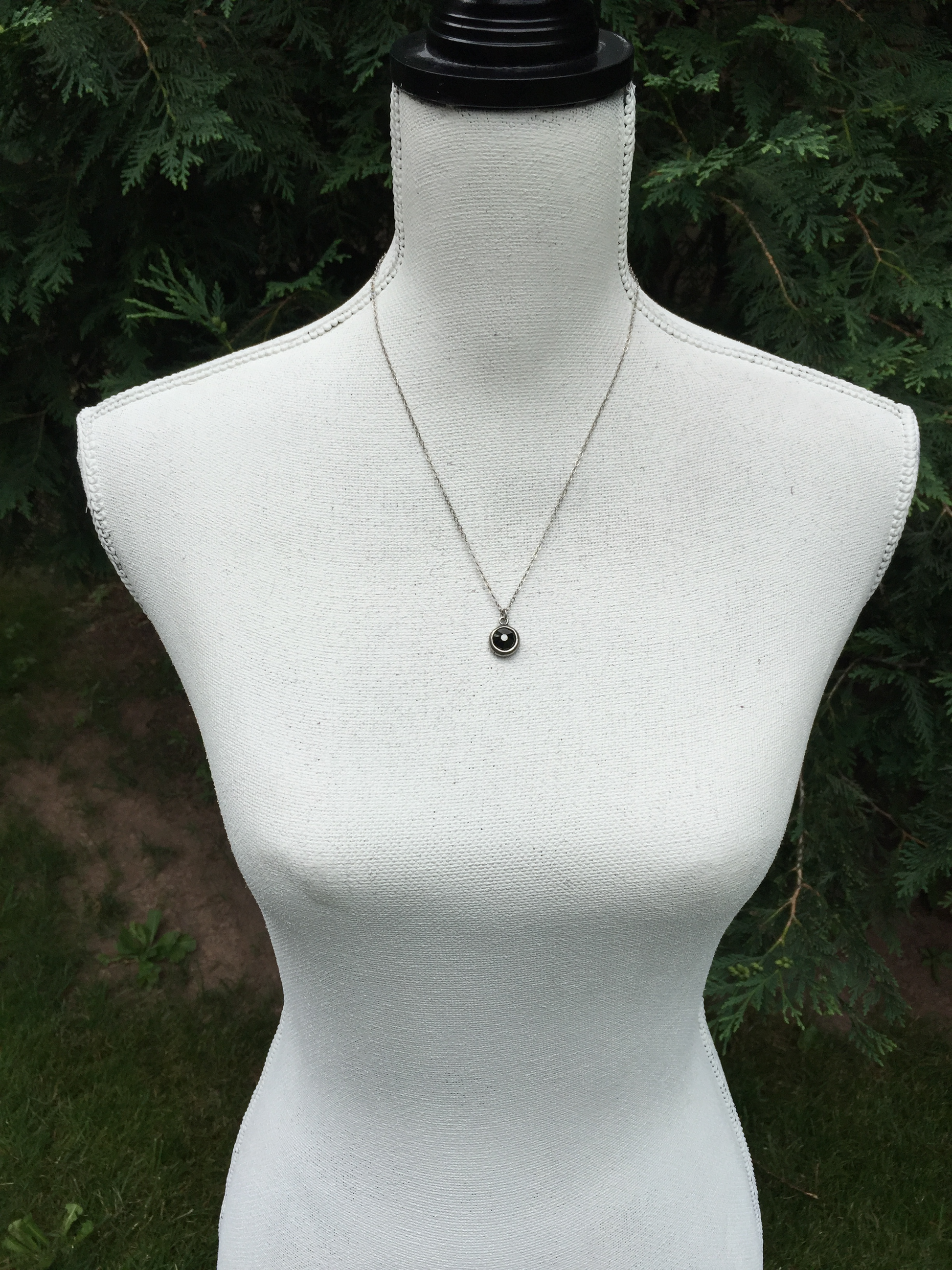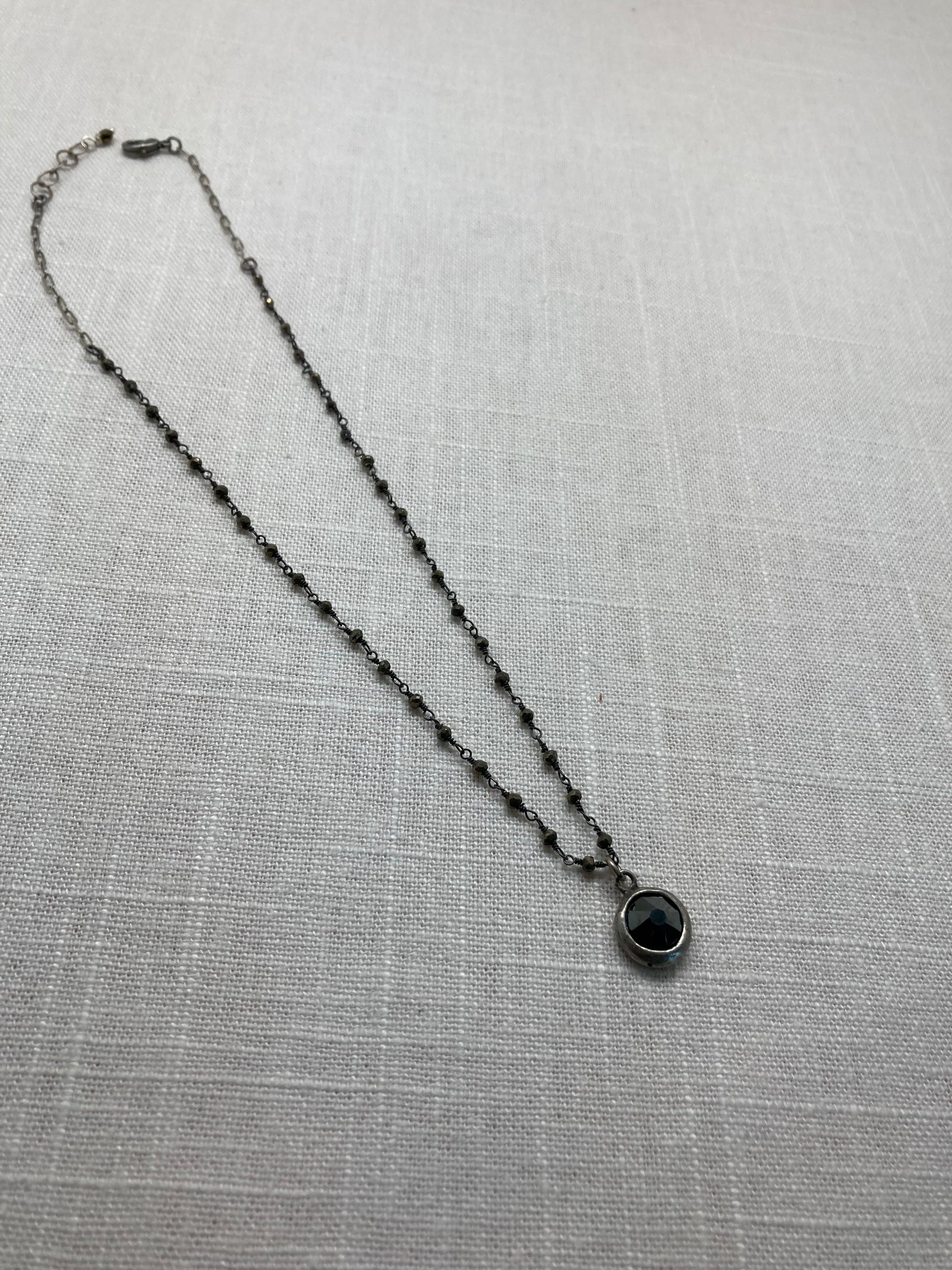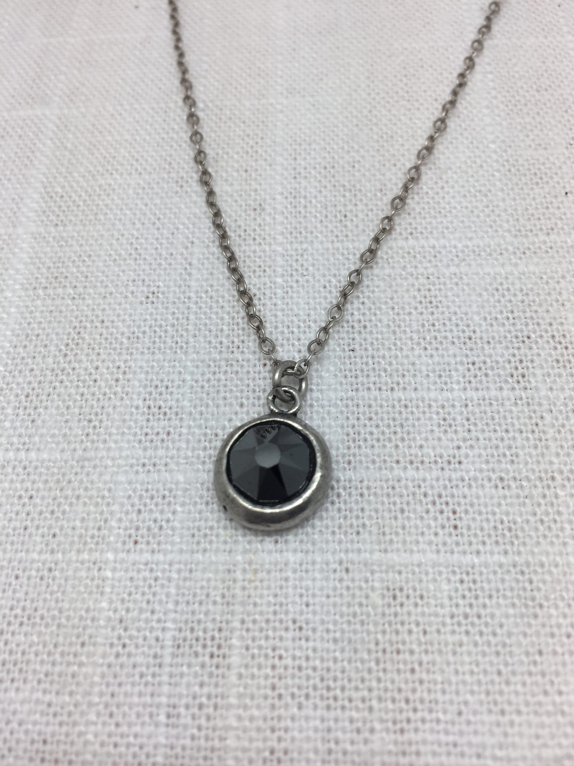 This simple drop necklace is a show stopper due to the gorgeous jet hematite crystal surrounded by a rustic antique silver setting. It is a great necklace on its own or it pairs well with other silver layering pieces.