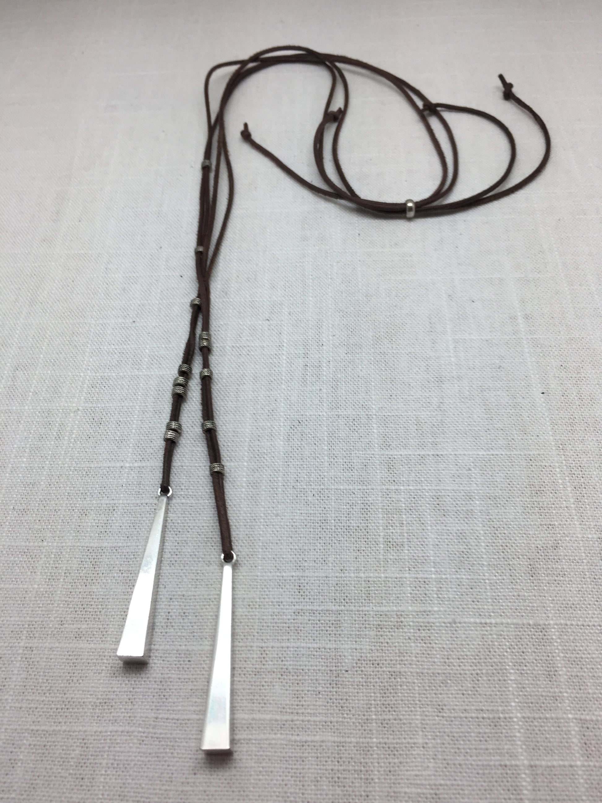 Two silver keystone shaped charms hang from dark brown leather cord on this lariat style necklace.
