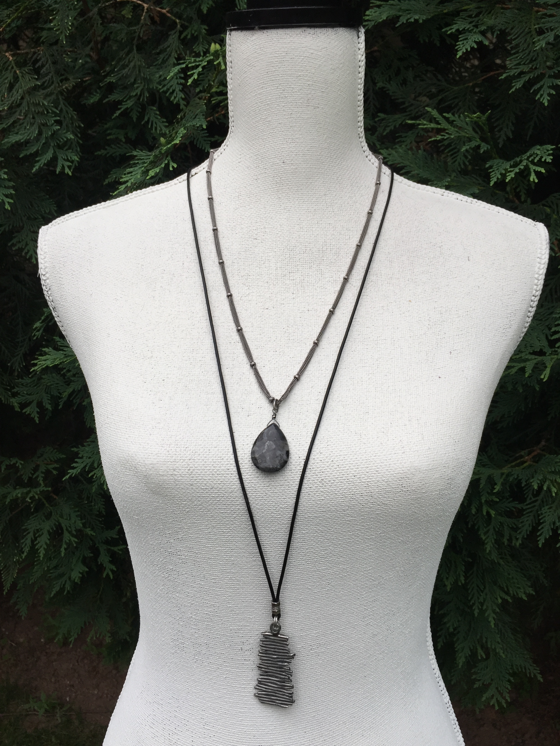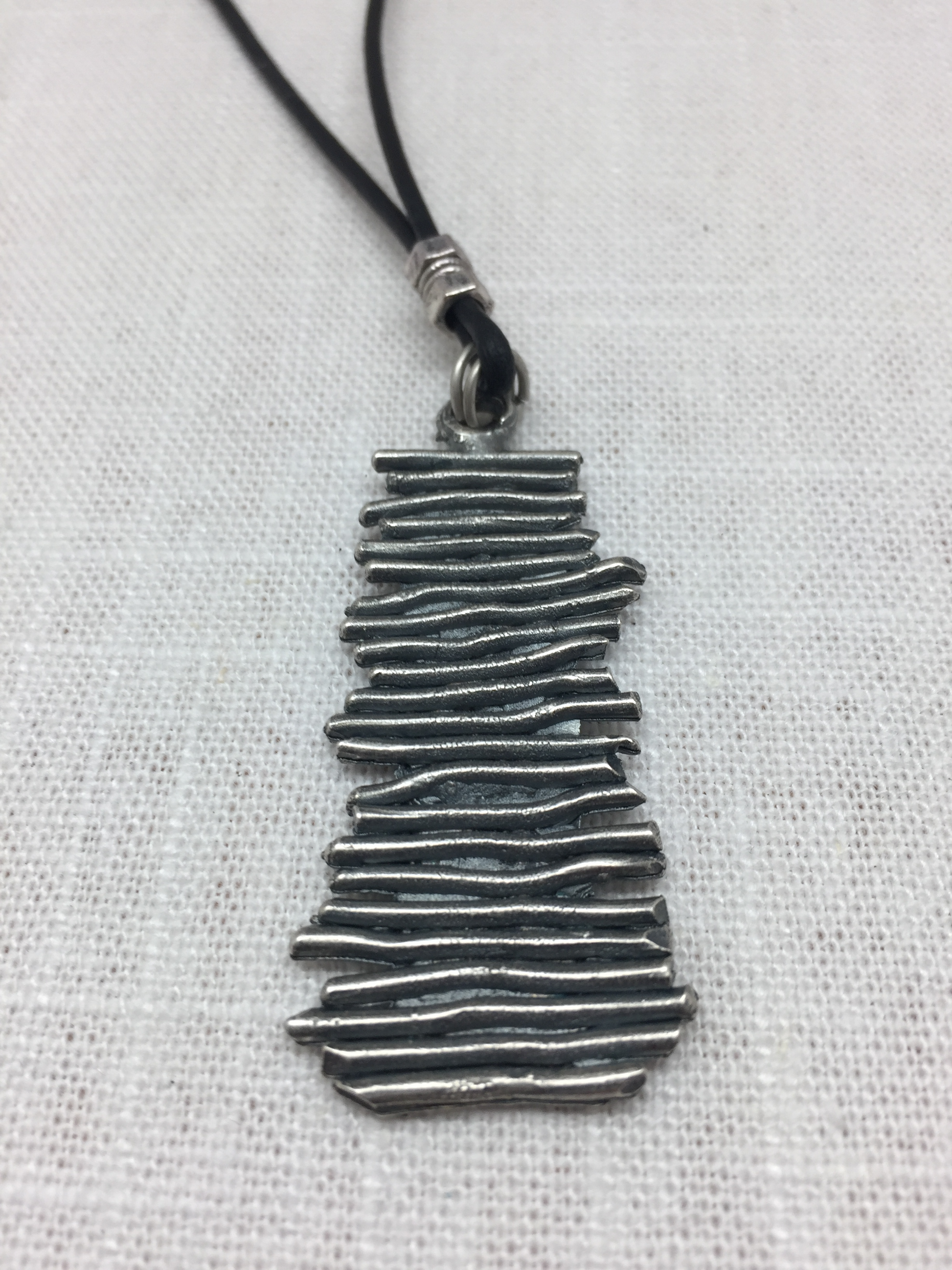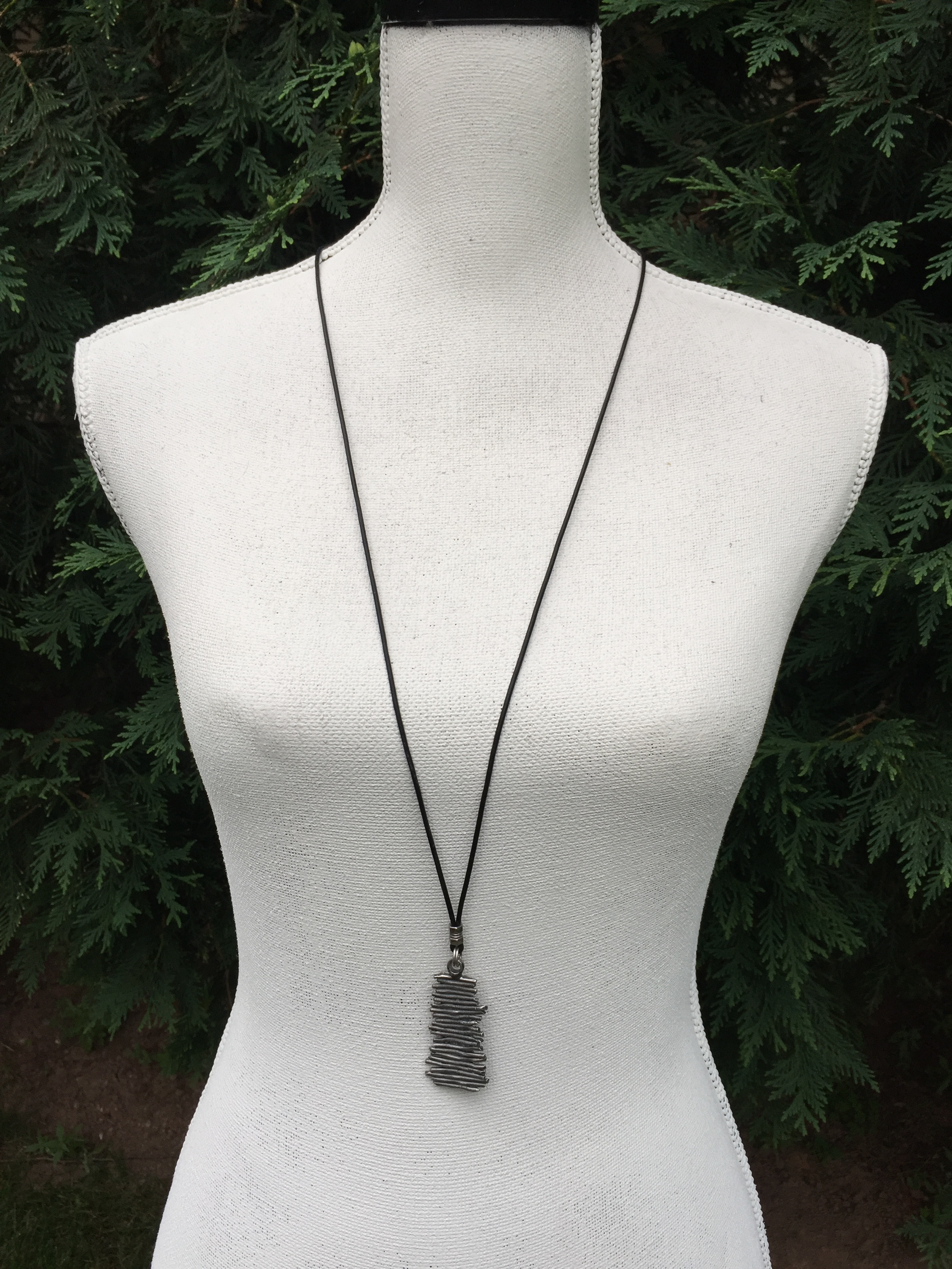 The longest piece in the Silver Layering Collection, this simple pendant is suspended from an adjustable strand of supple black leather. It is great as a casual accent to a turtleneck sweater or it works great as a layering pendant