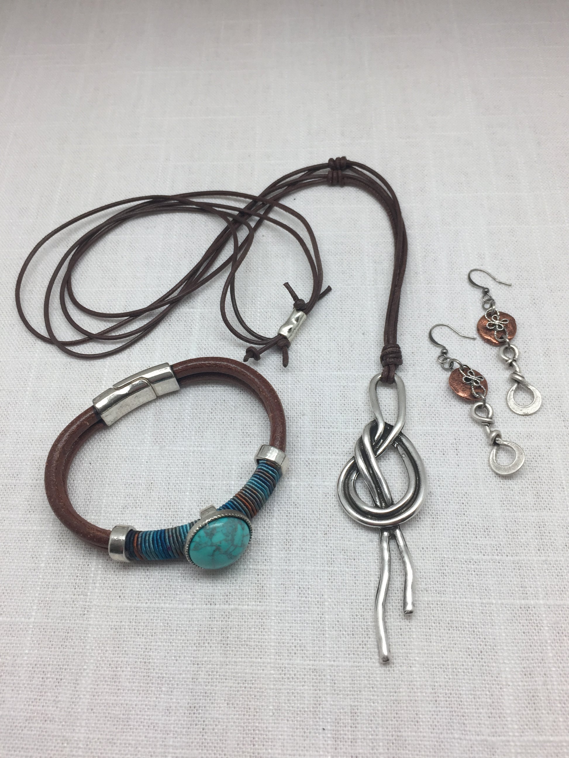Cute mixed metal earrings with a big silver knot hanging from a hammered copper disc.
