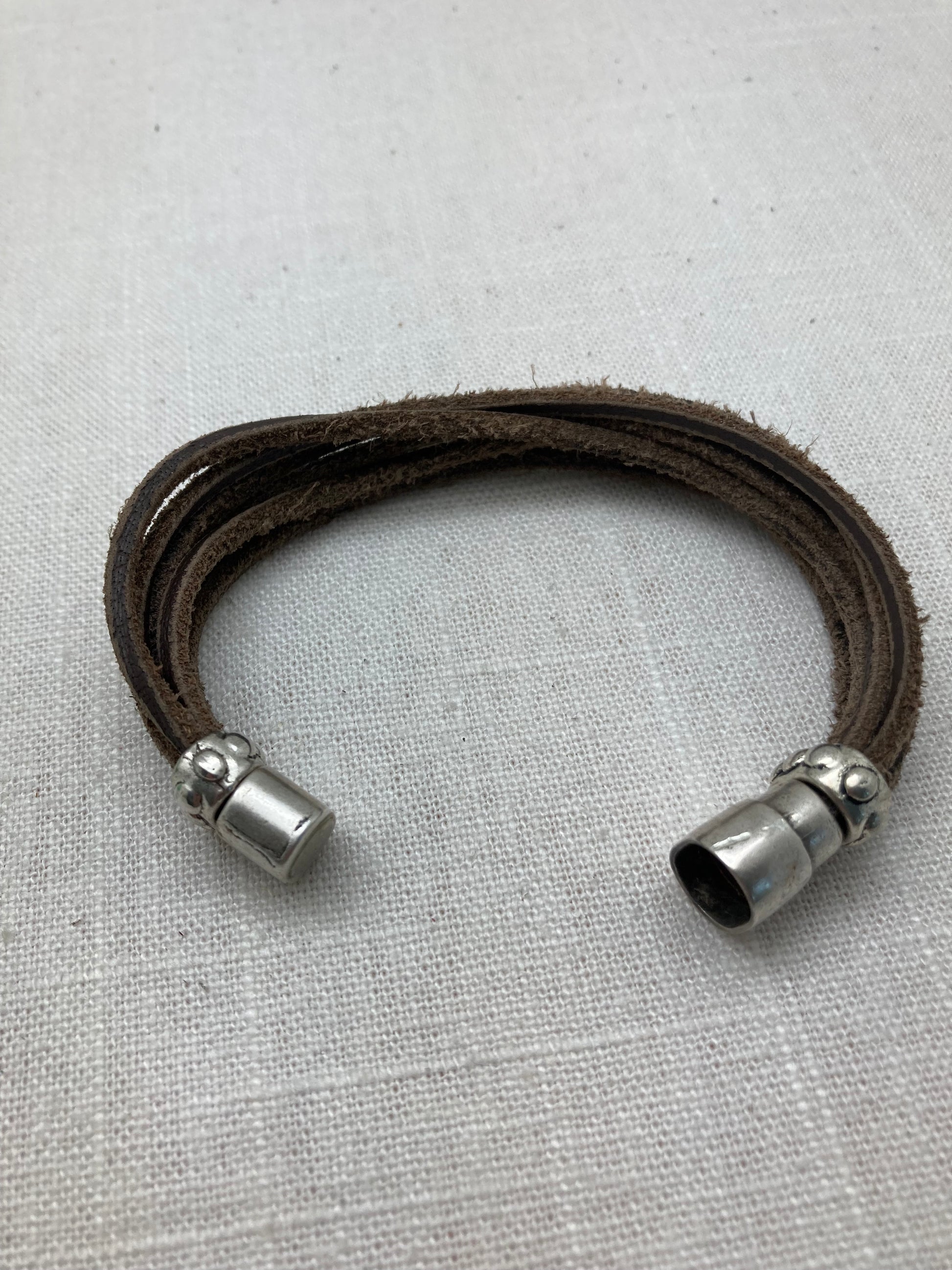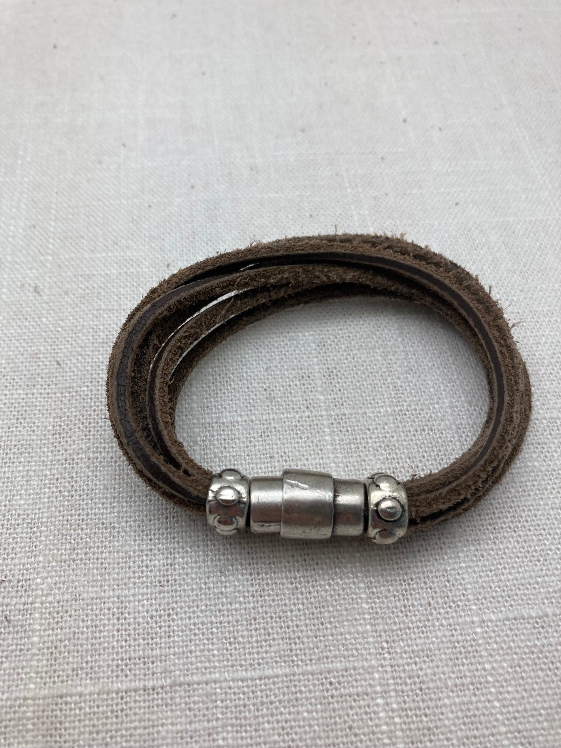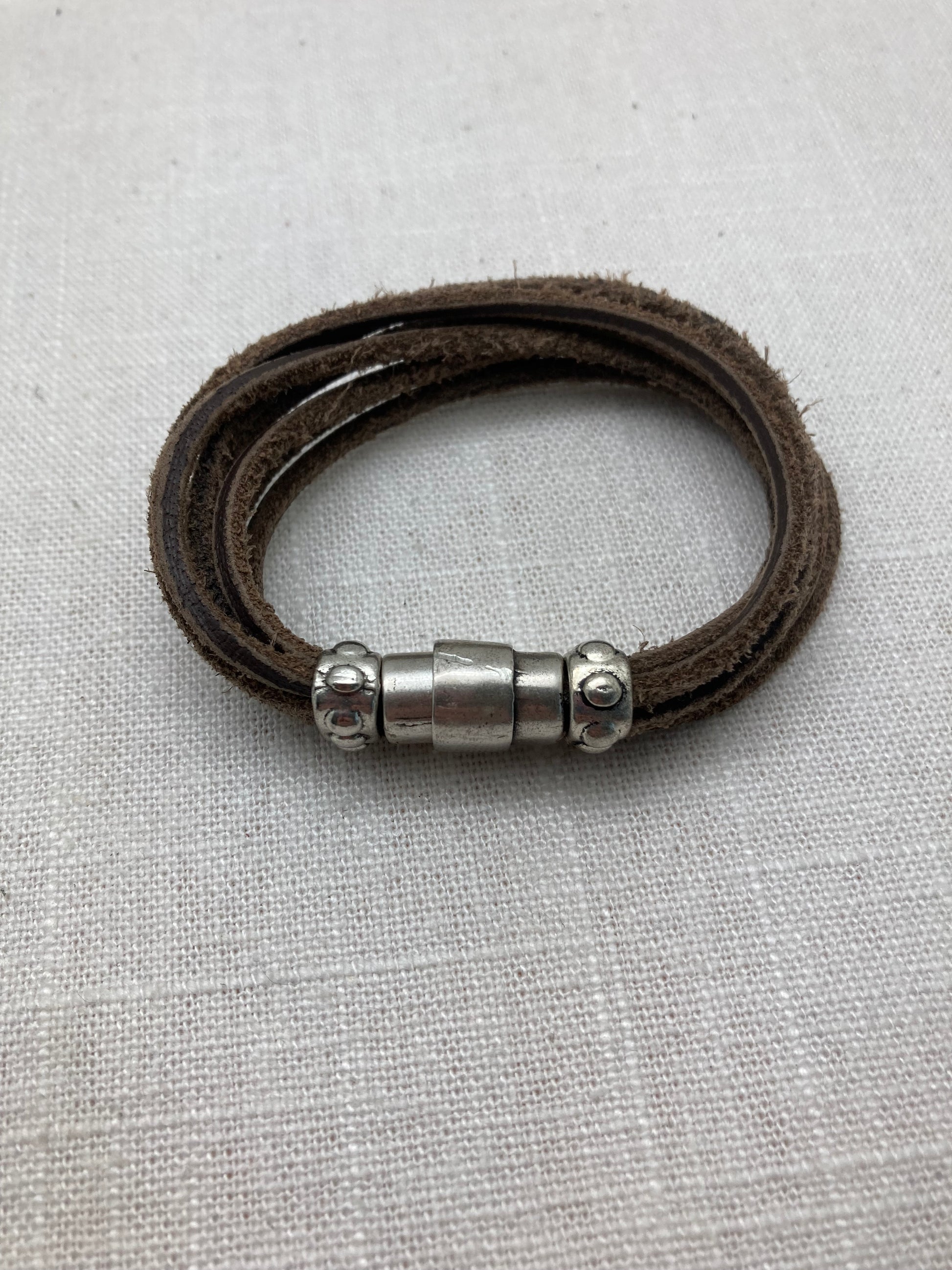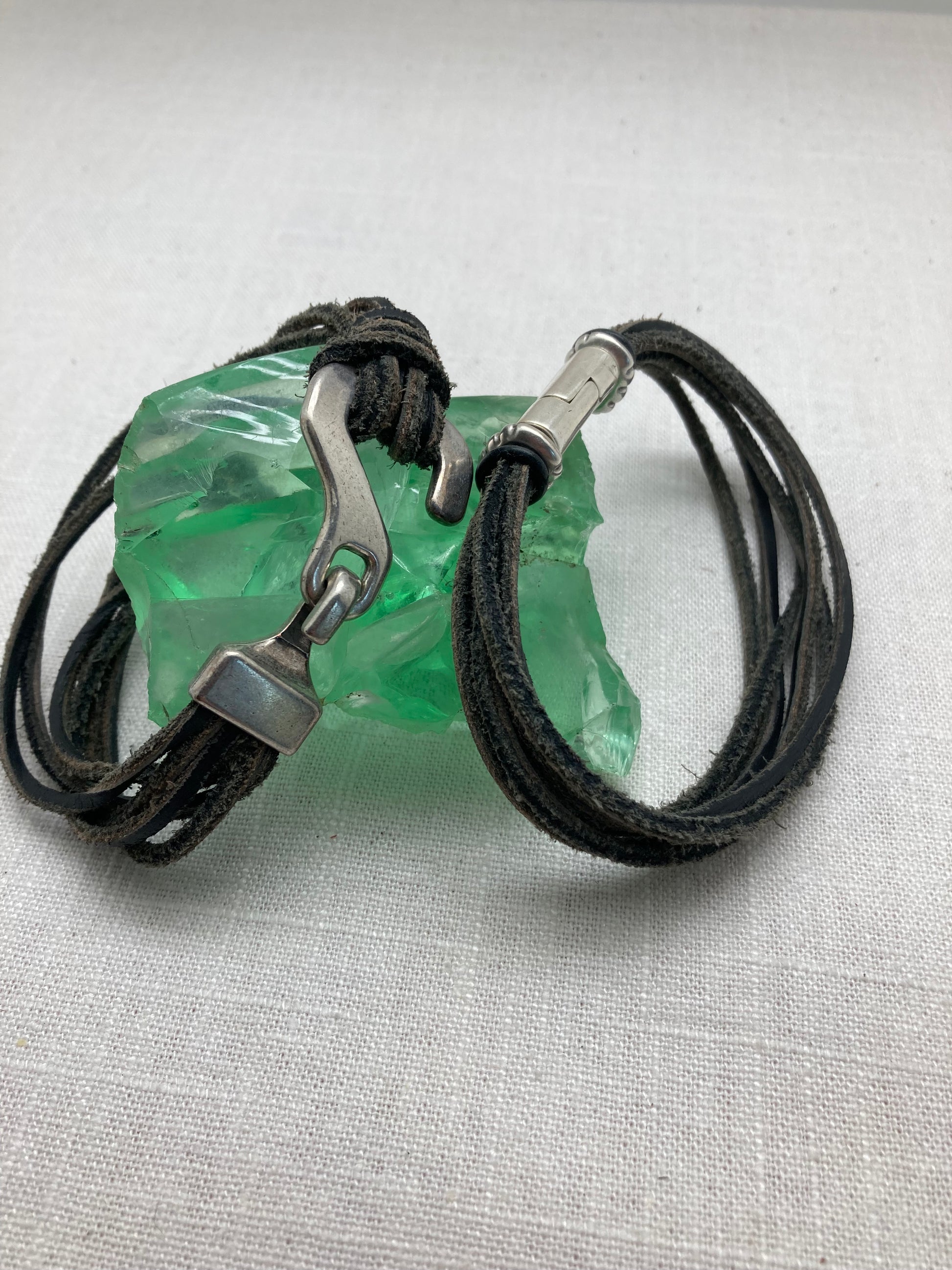Multiple strands of worn, rustic leather combine to make a very casual interesting unisex bracelet.