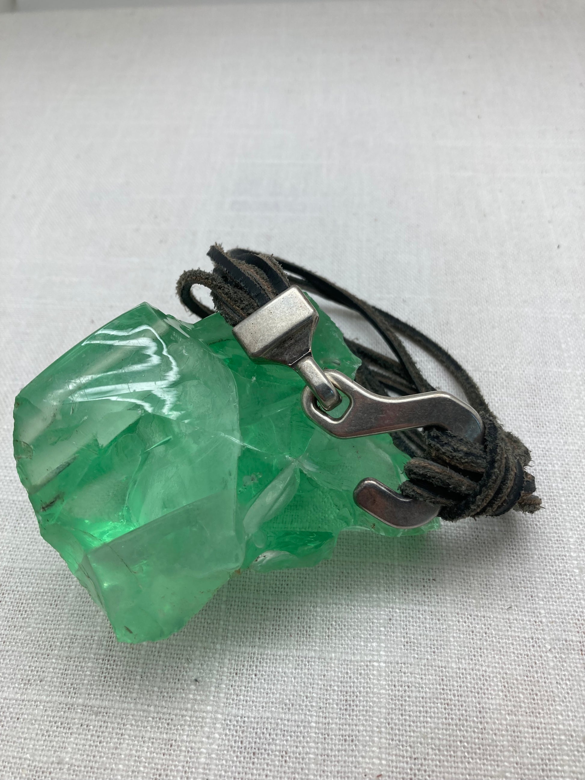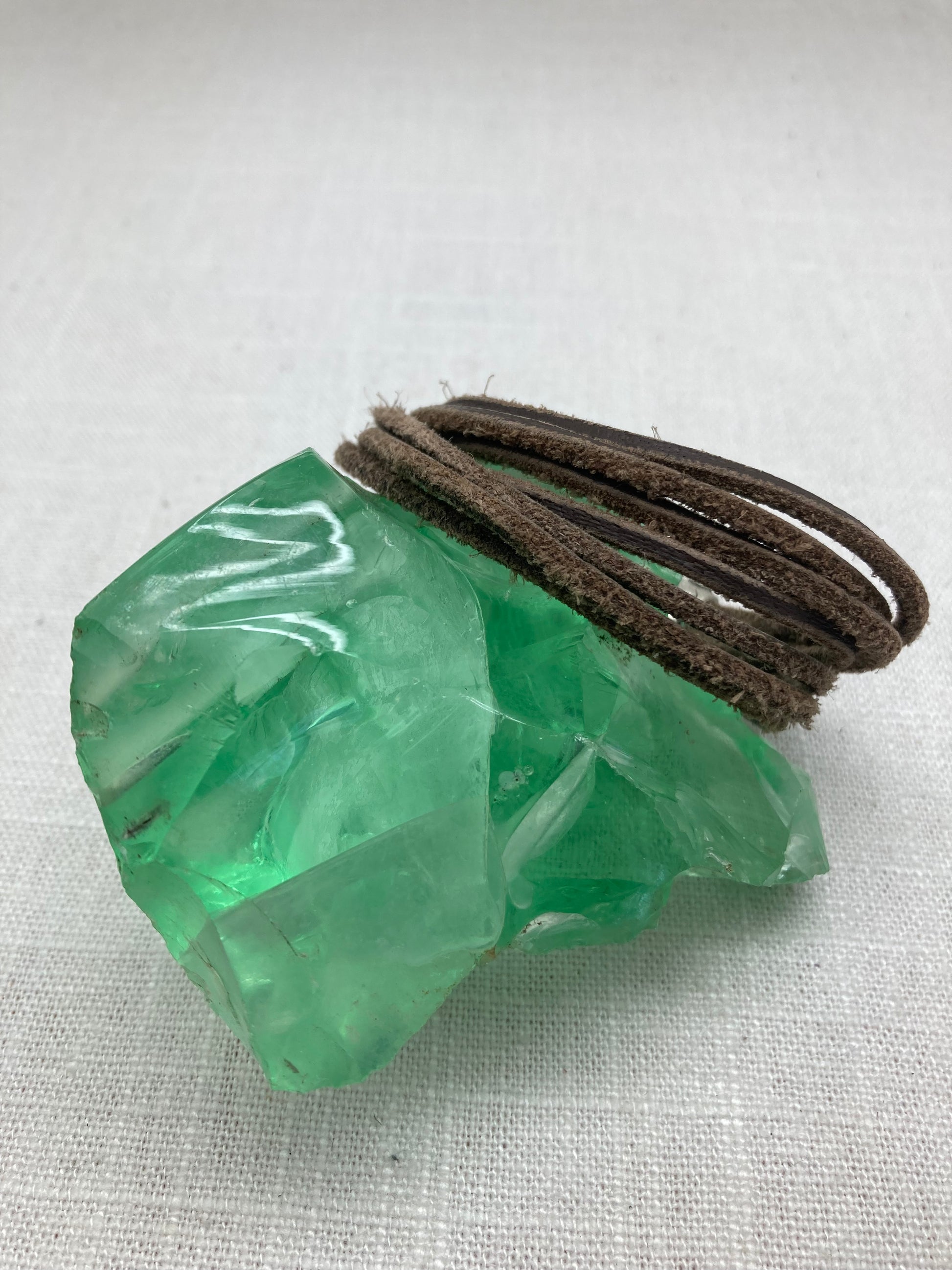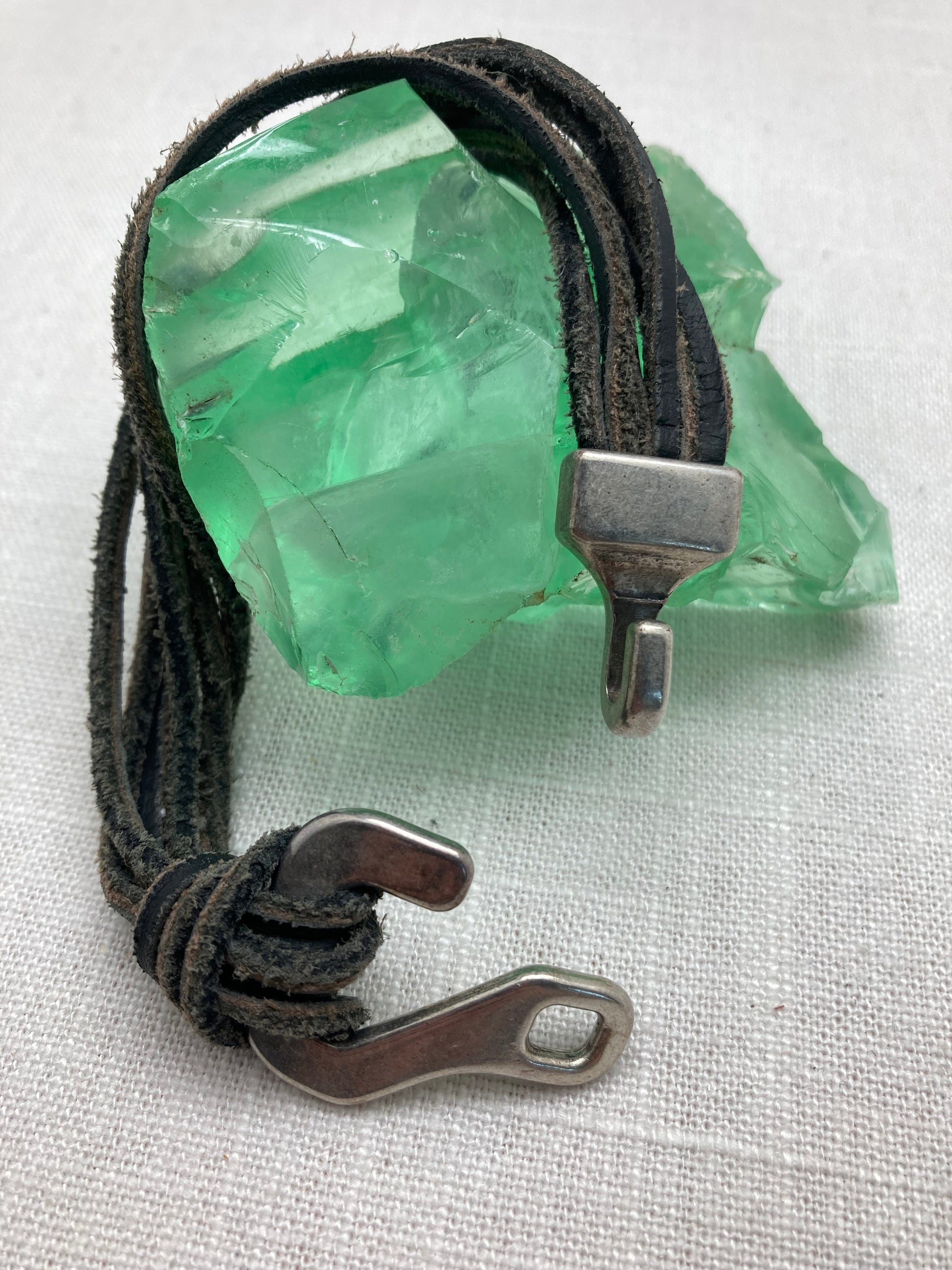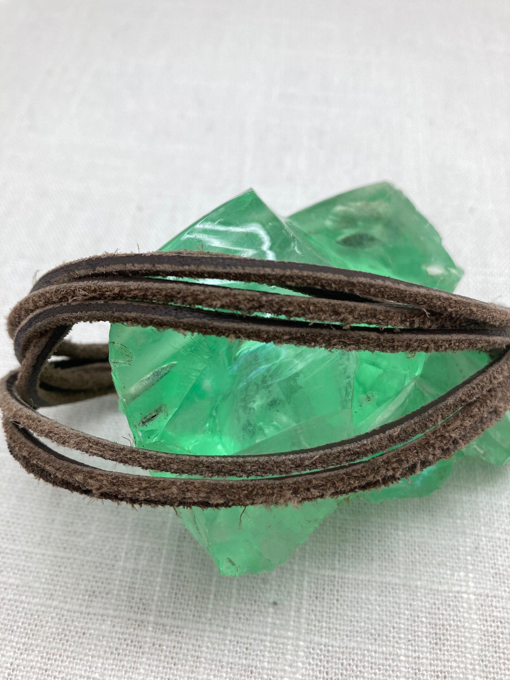 Multiple strands of worn, rustic leather combine to make a very casual interesting unisex bracelet.