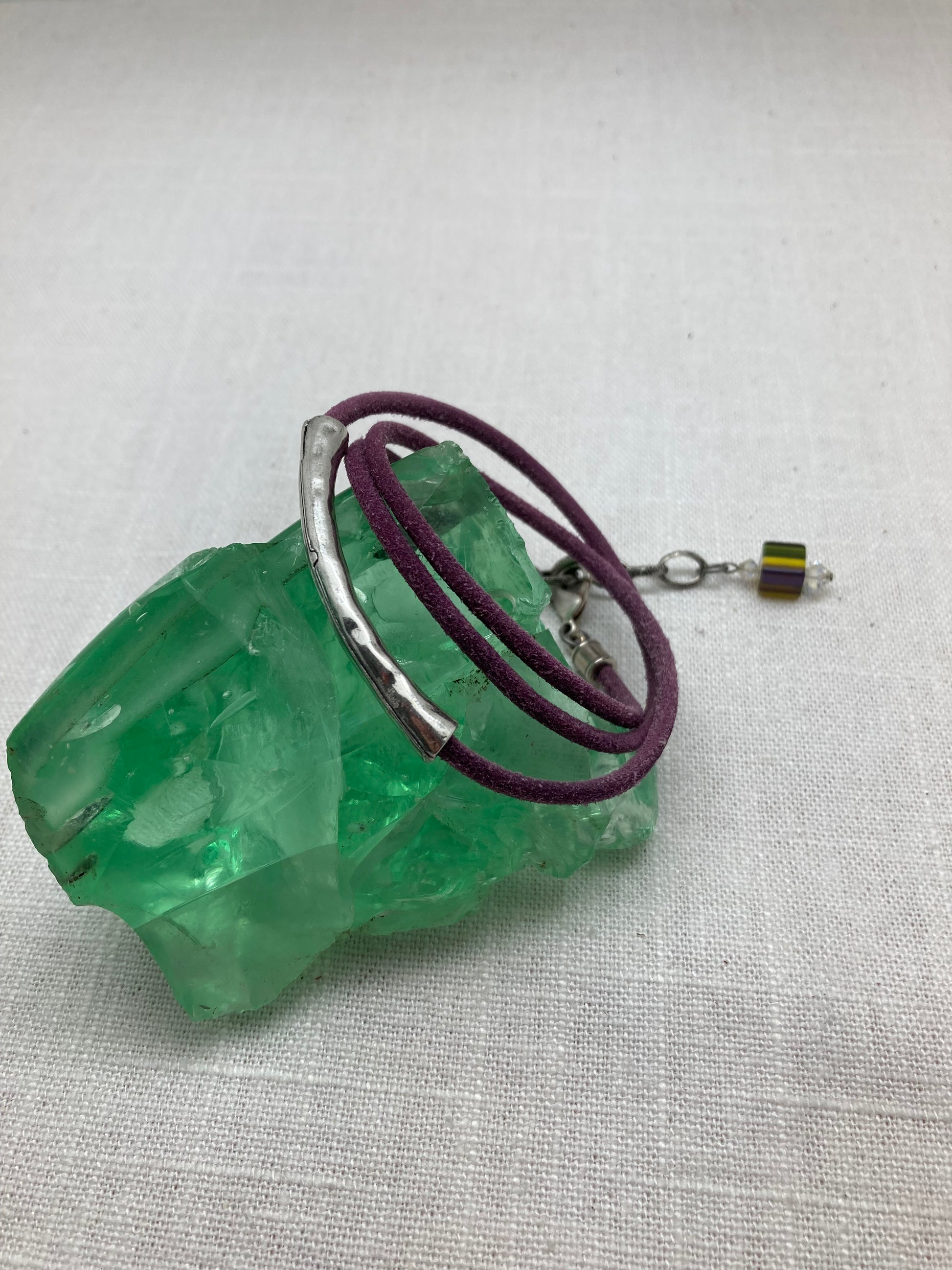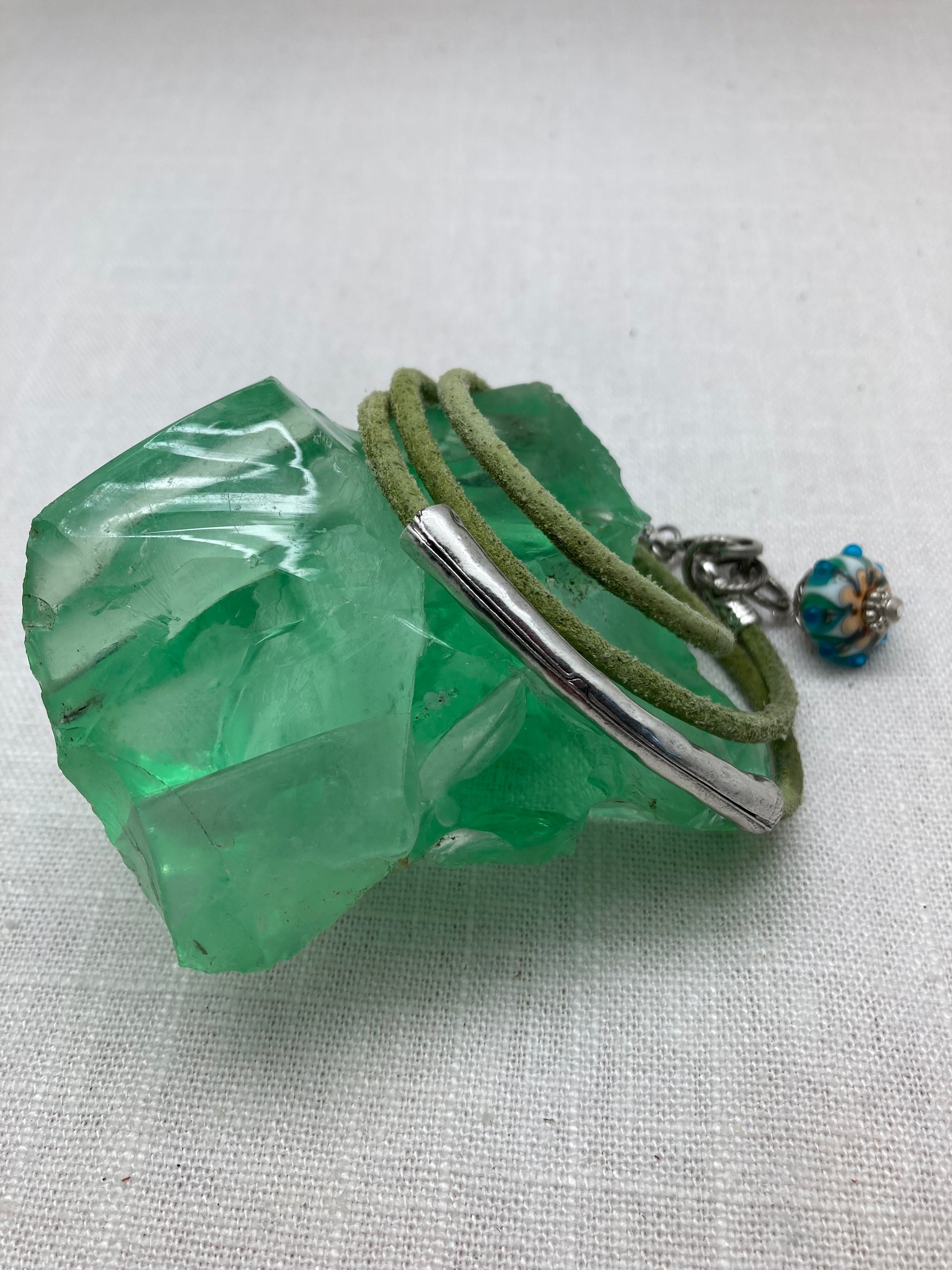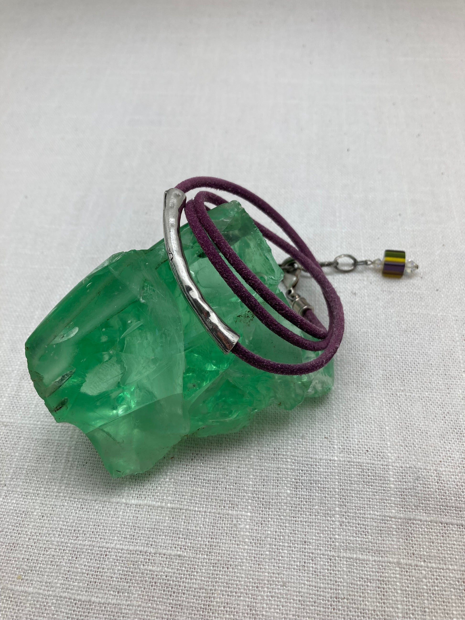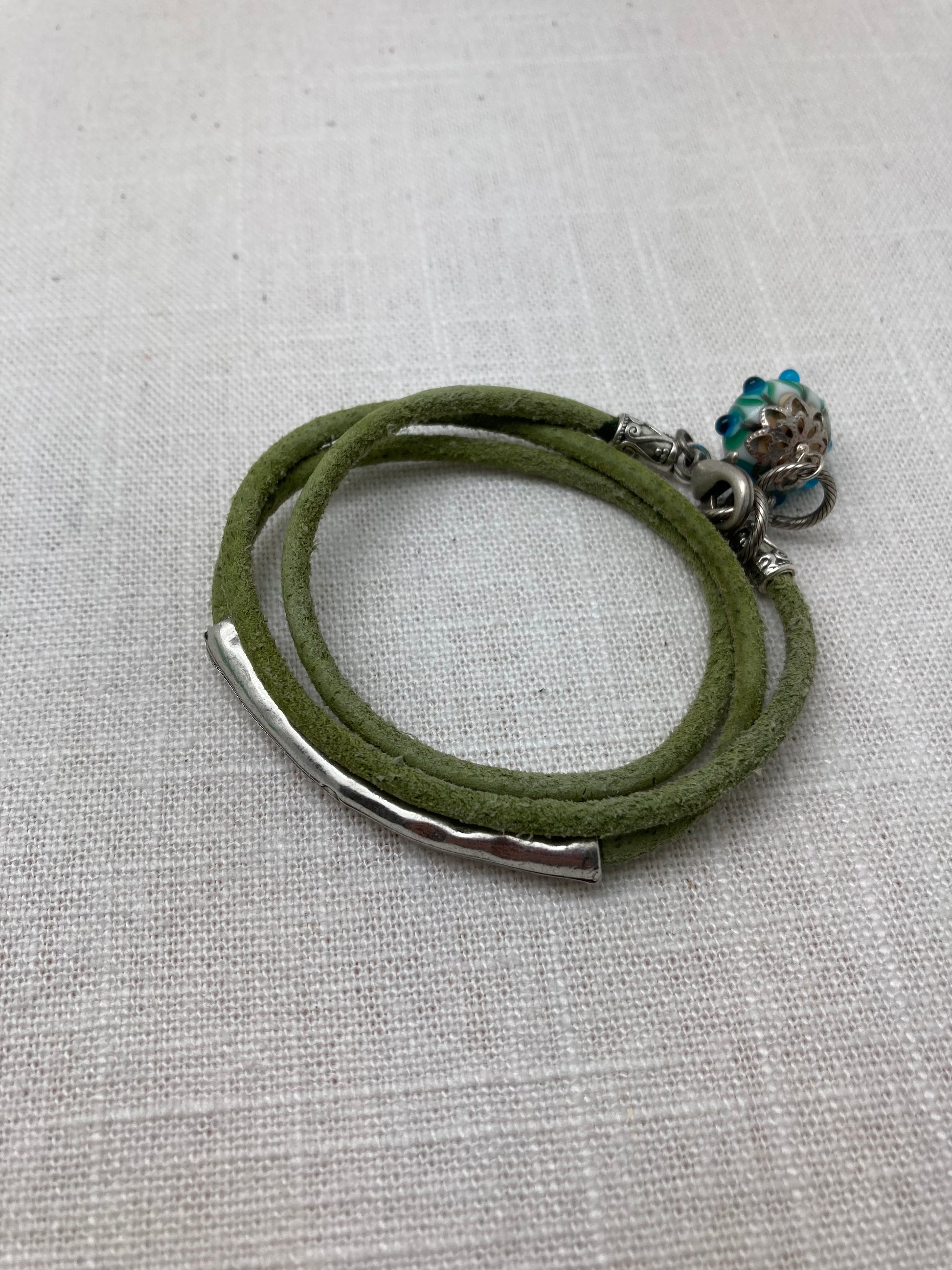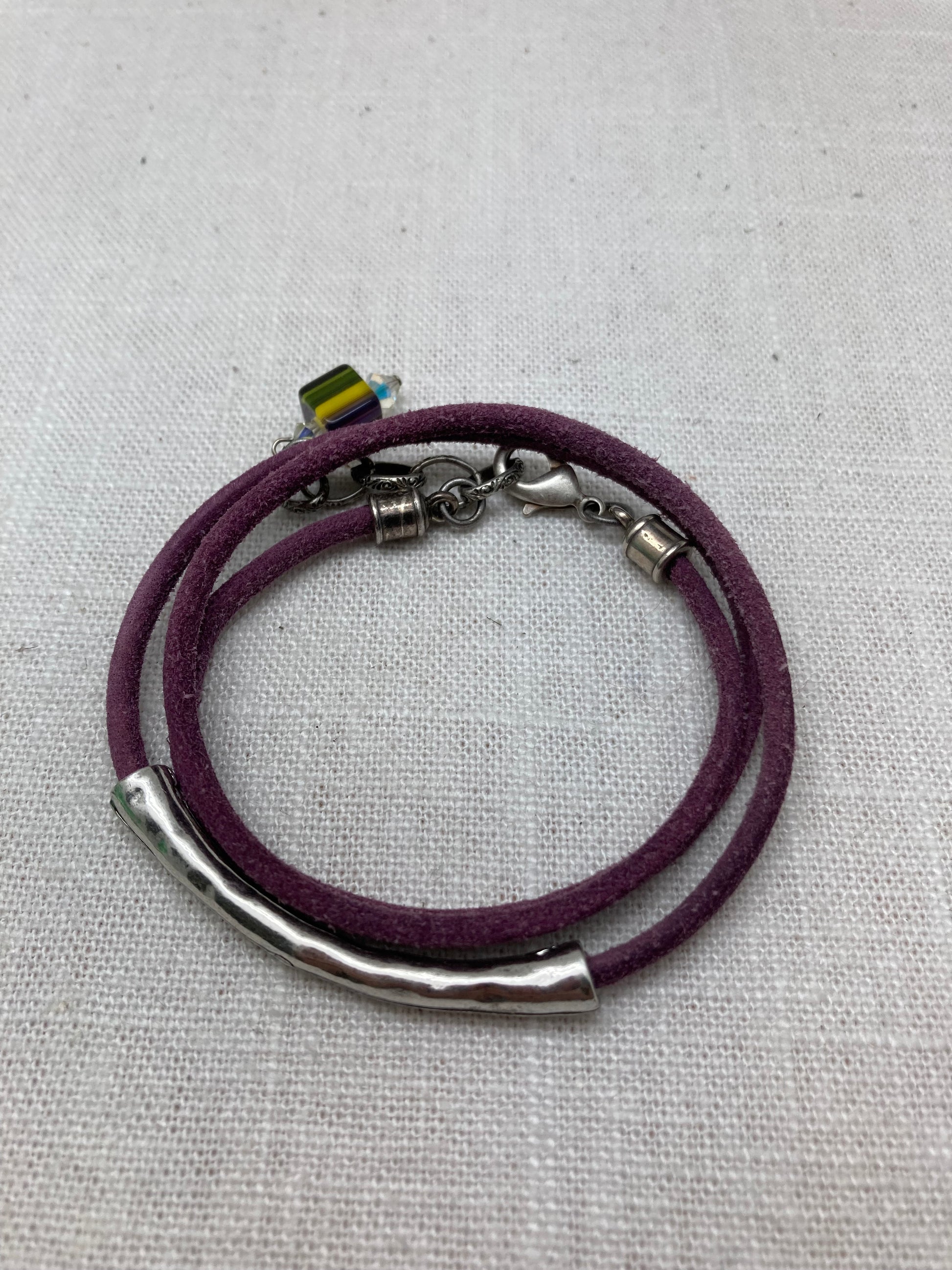 Soft strand of colorful suede wrapped three times around your wrist and fastened with a lobster clasp and a a glass bead.