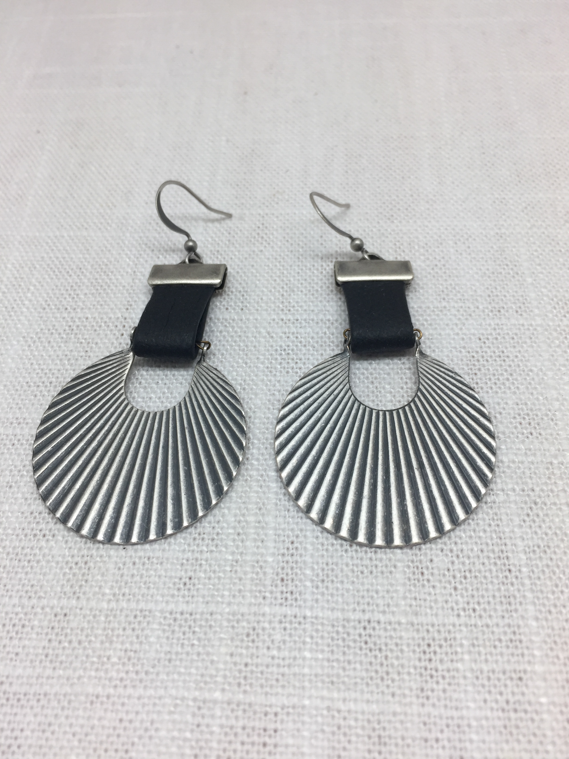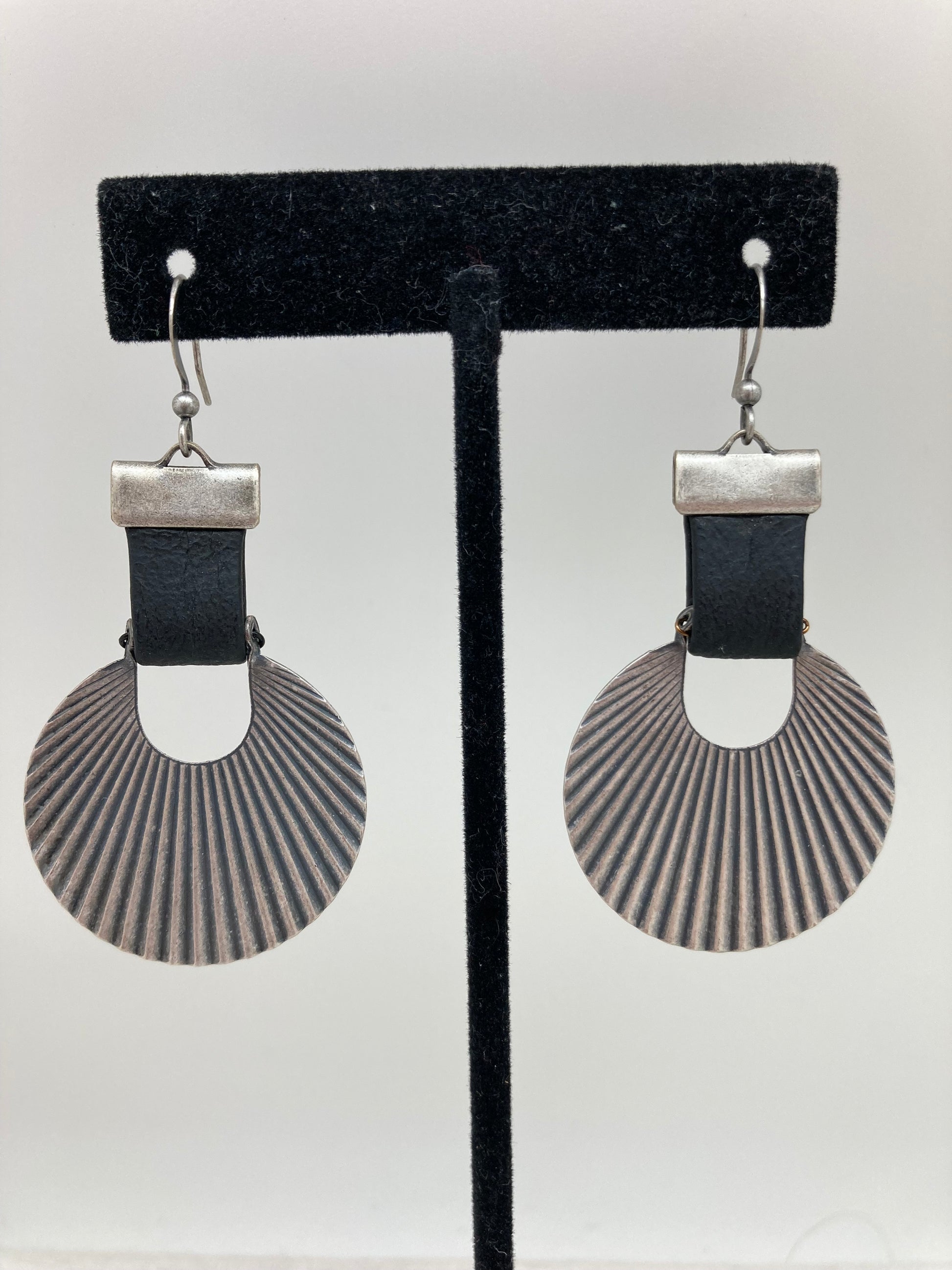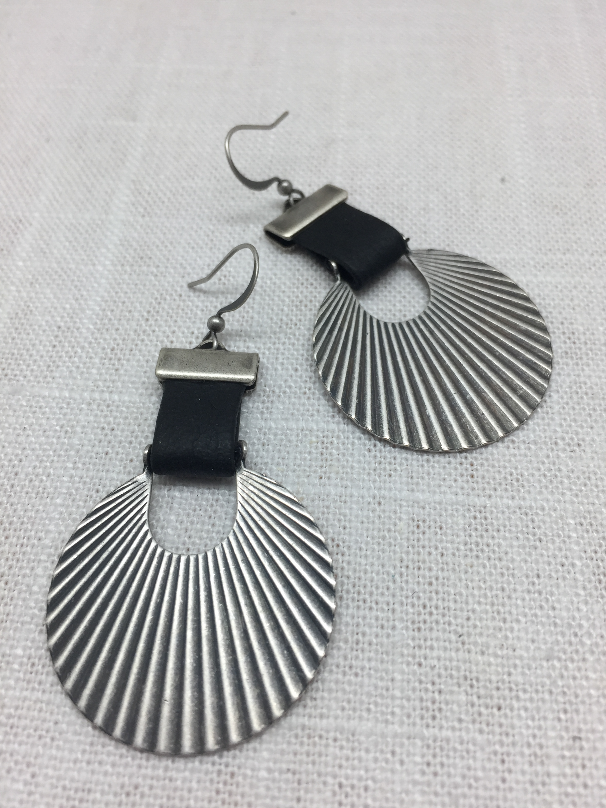 These casual earrings are a bebop favorite.  The antique silver corrugated charm is suspended from a strap of supple black leather.
