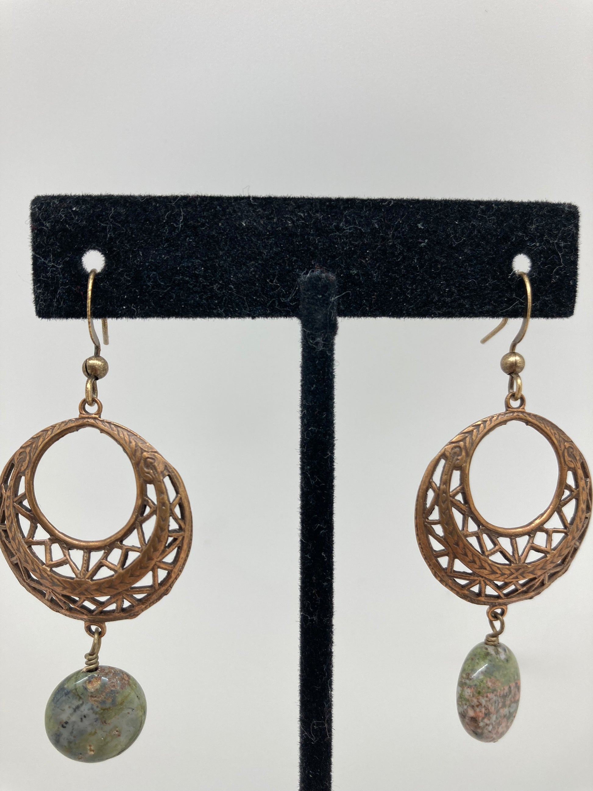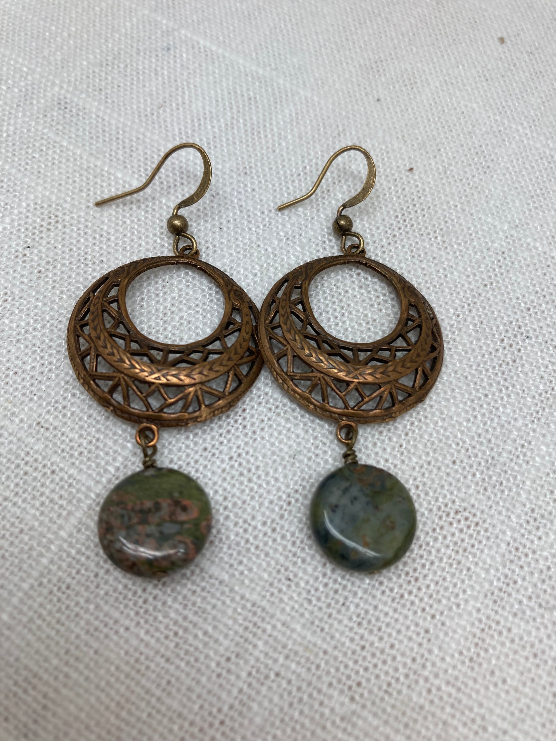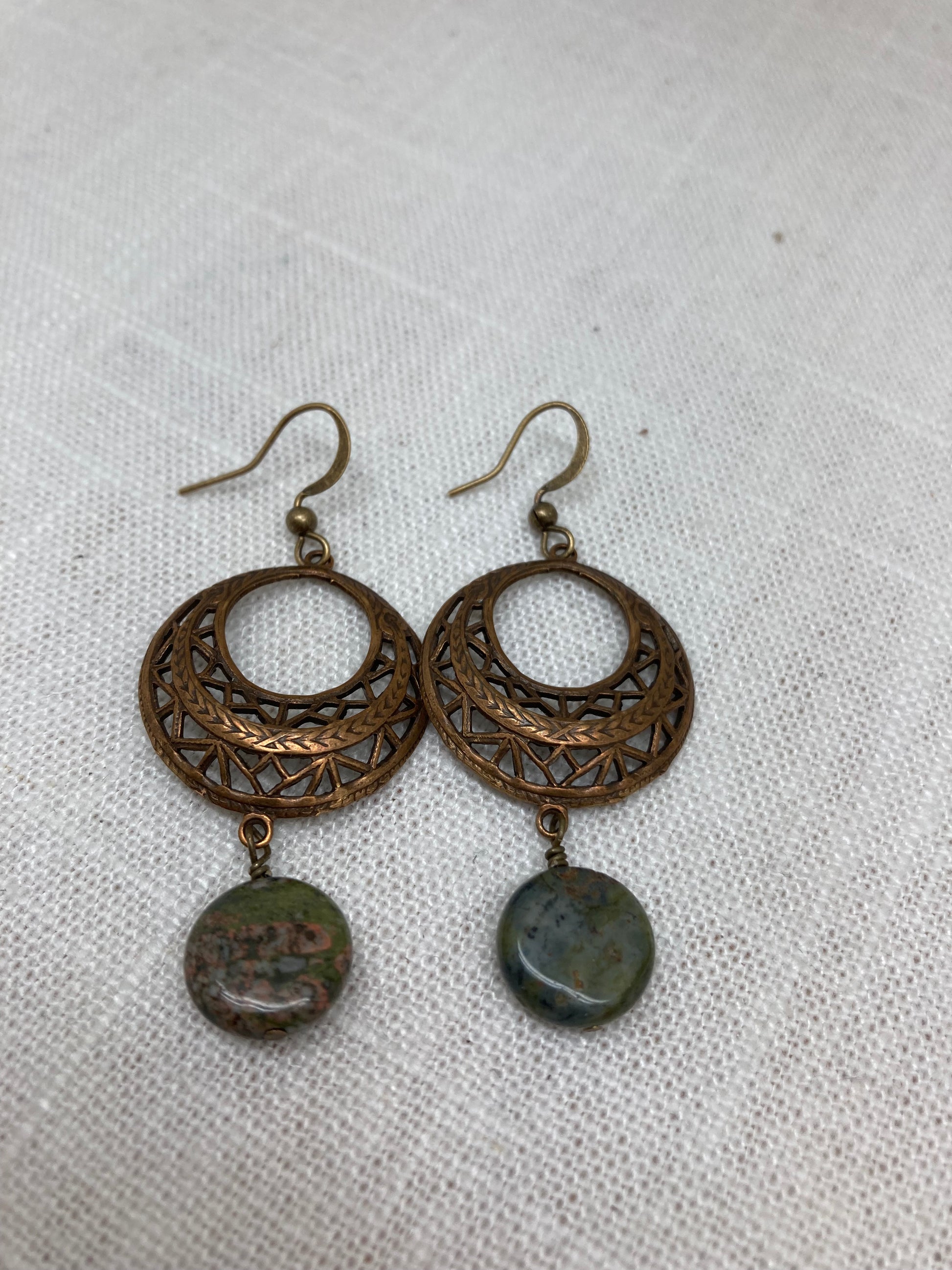 These earrings pair a moss agate disc bead with a vintage brass chandelier.