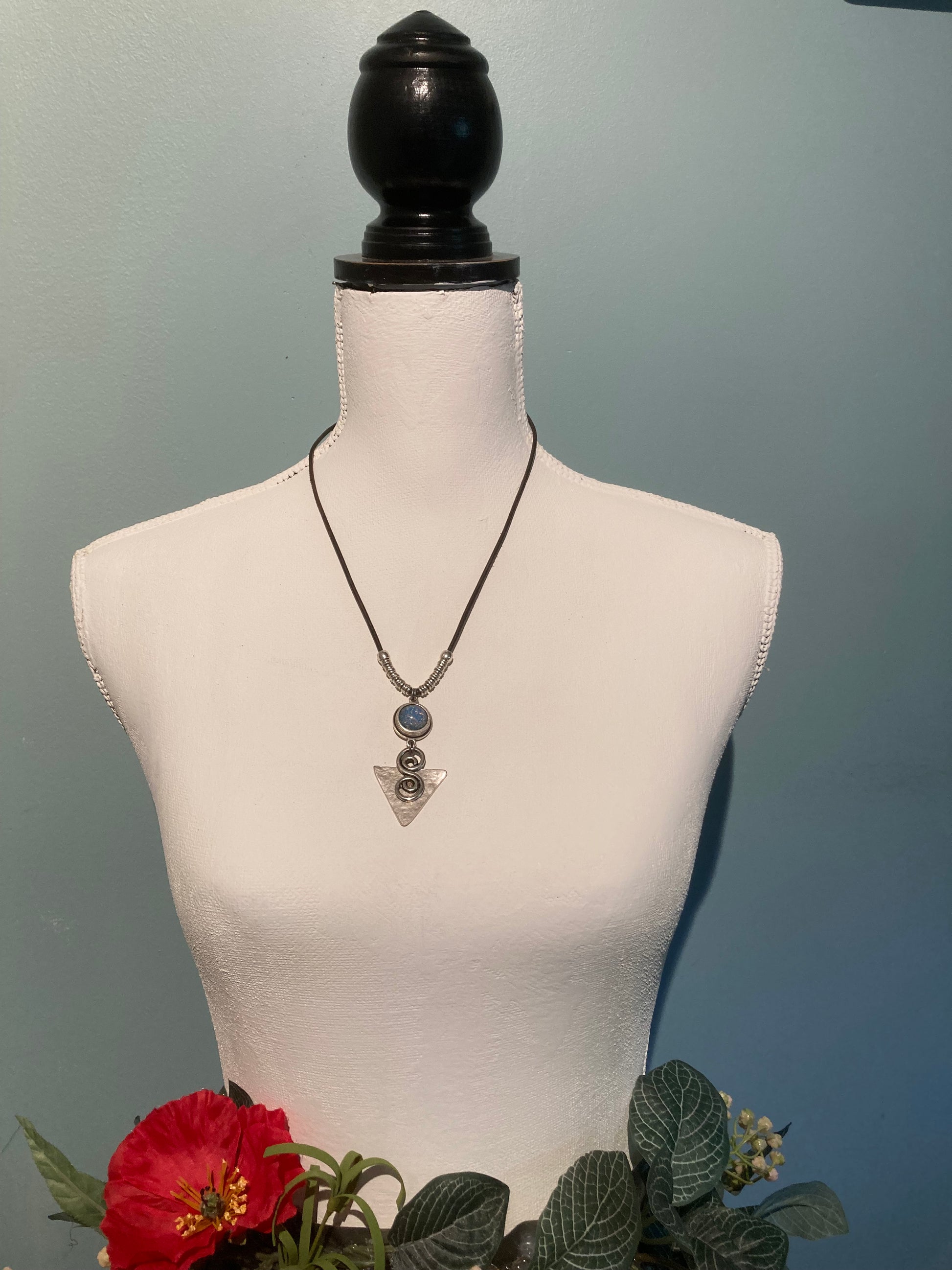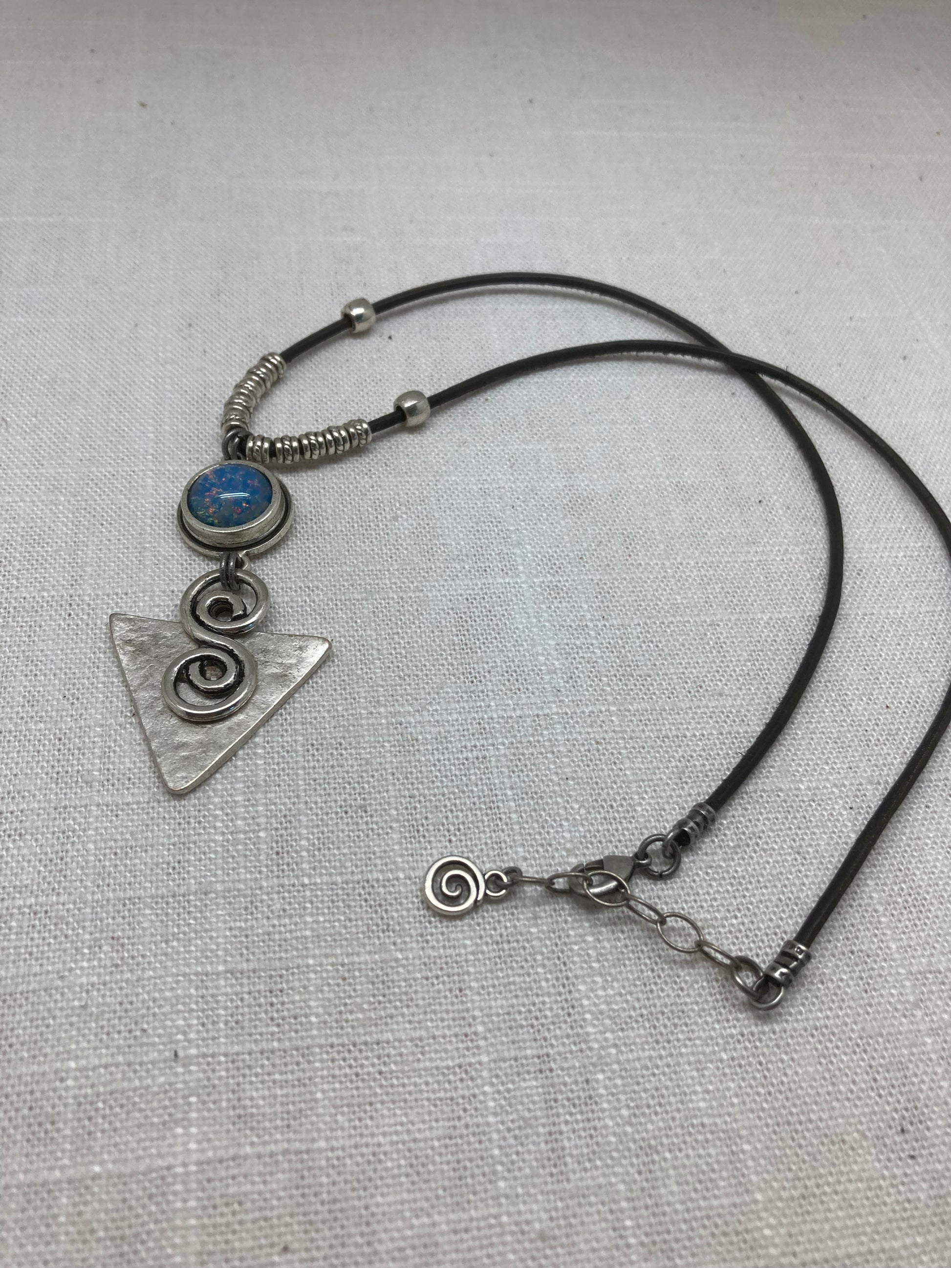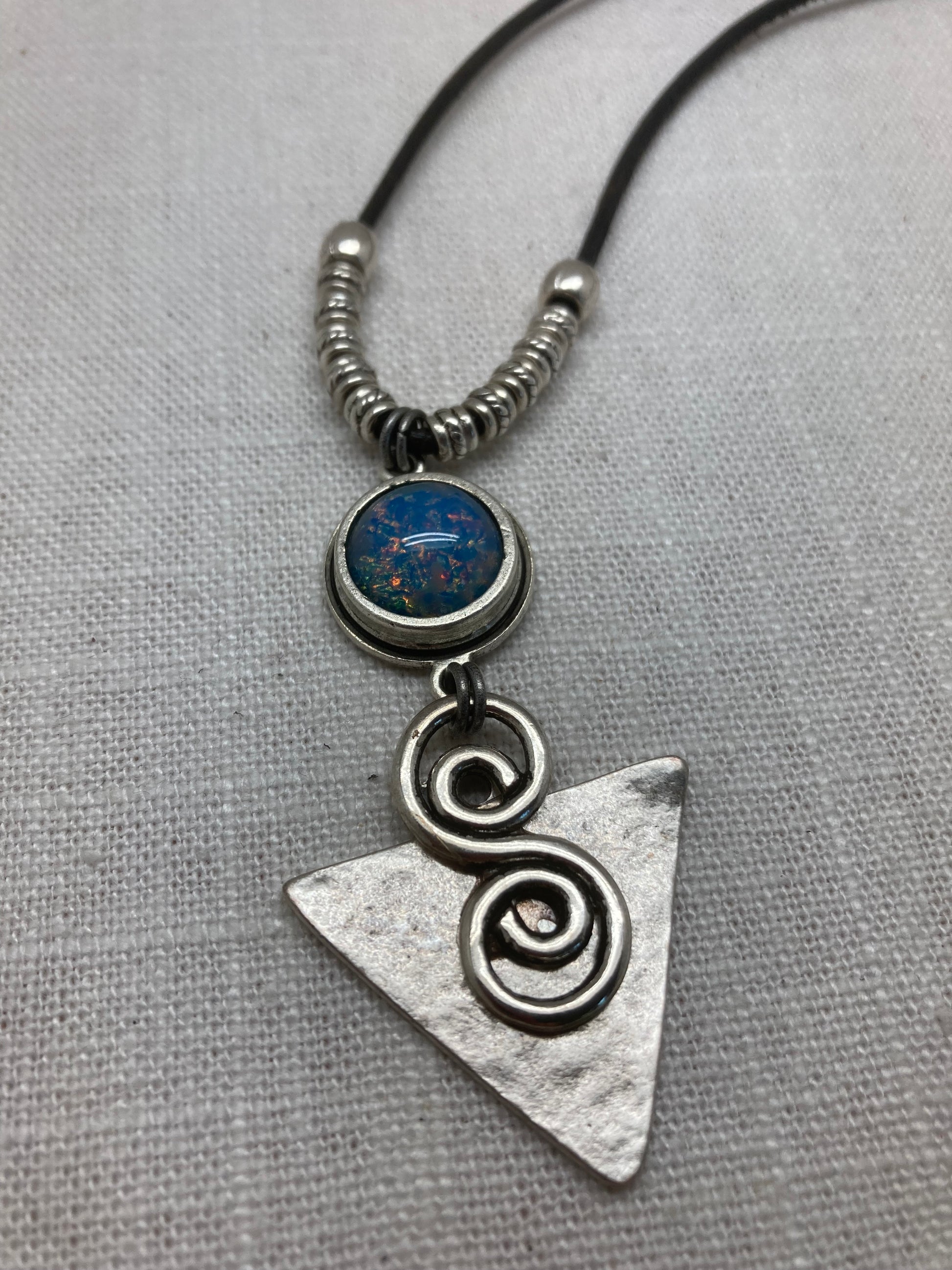 I hung one of my favorite charms, the hammered triangle, from a beautiful antique silver connector fitted with an opal glass cabochon.