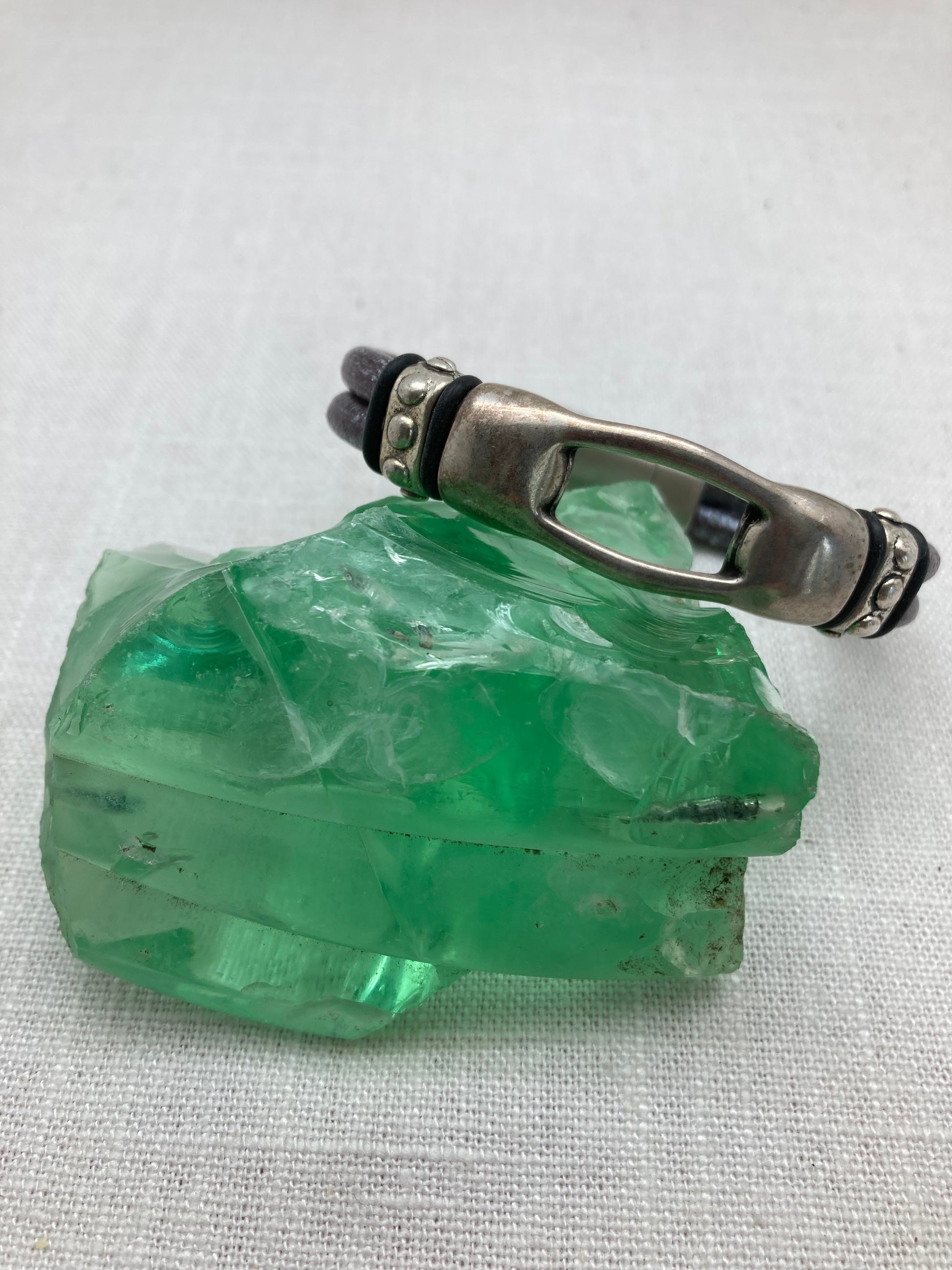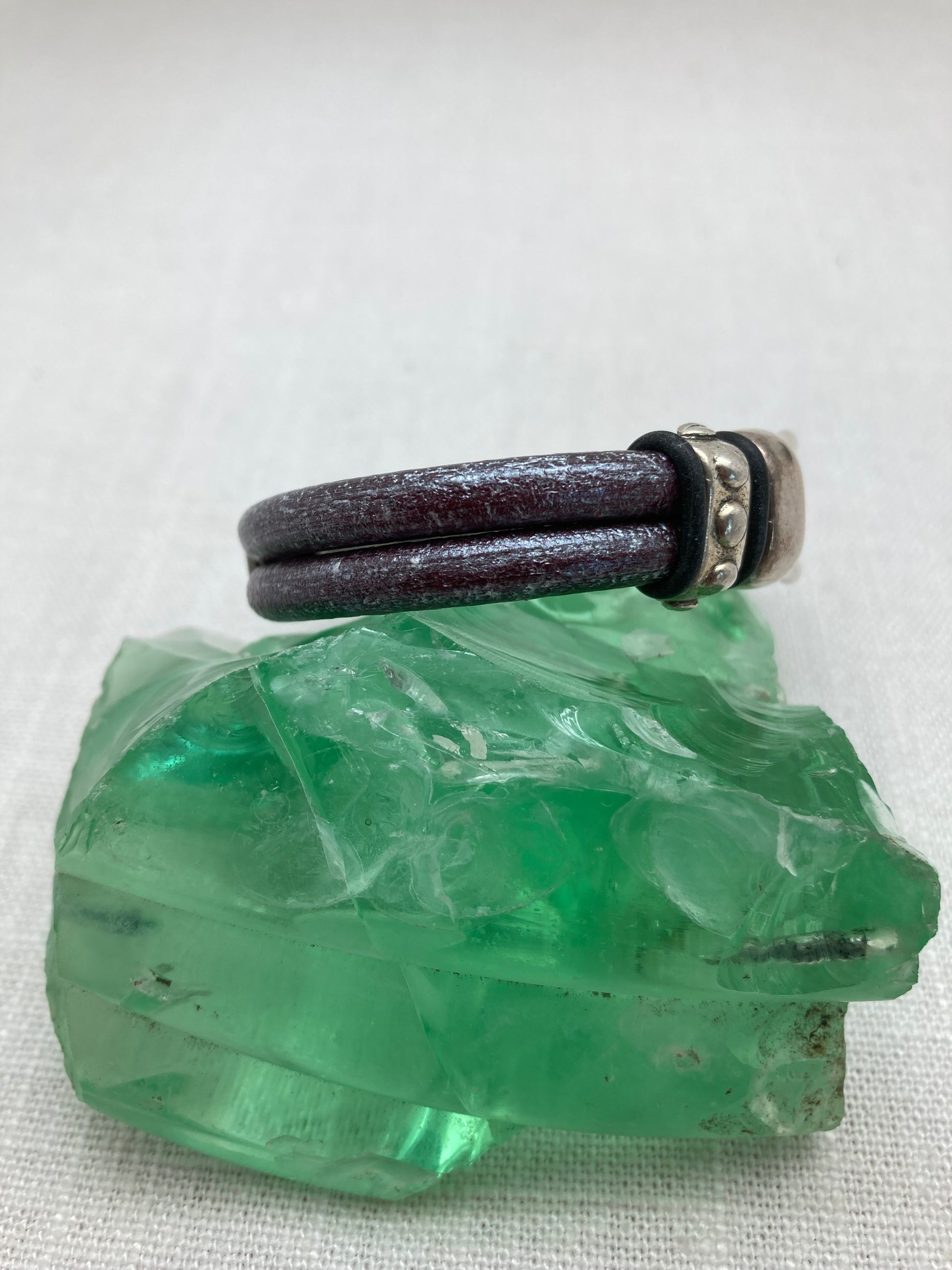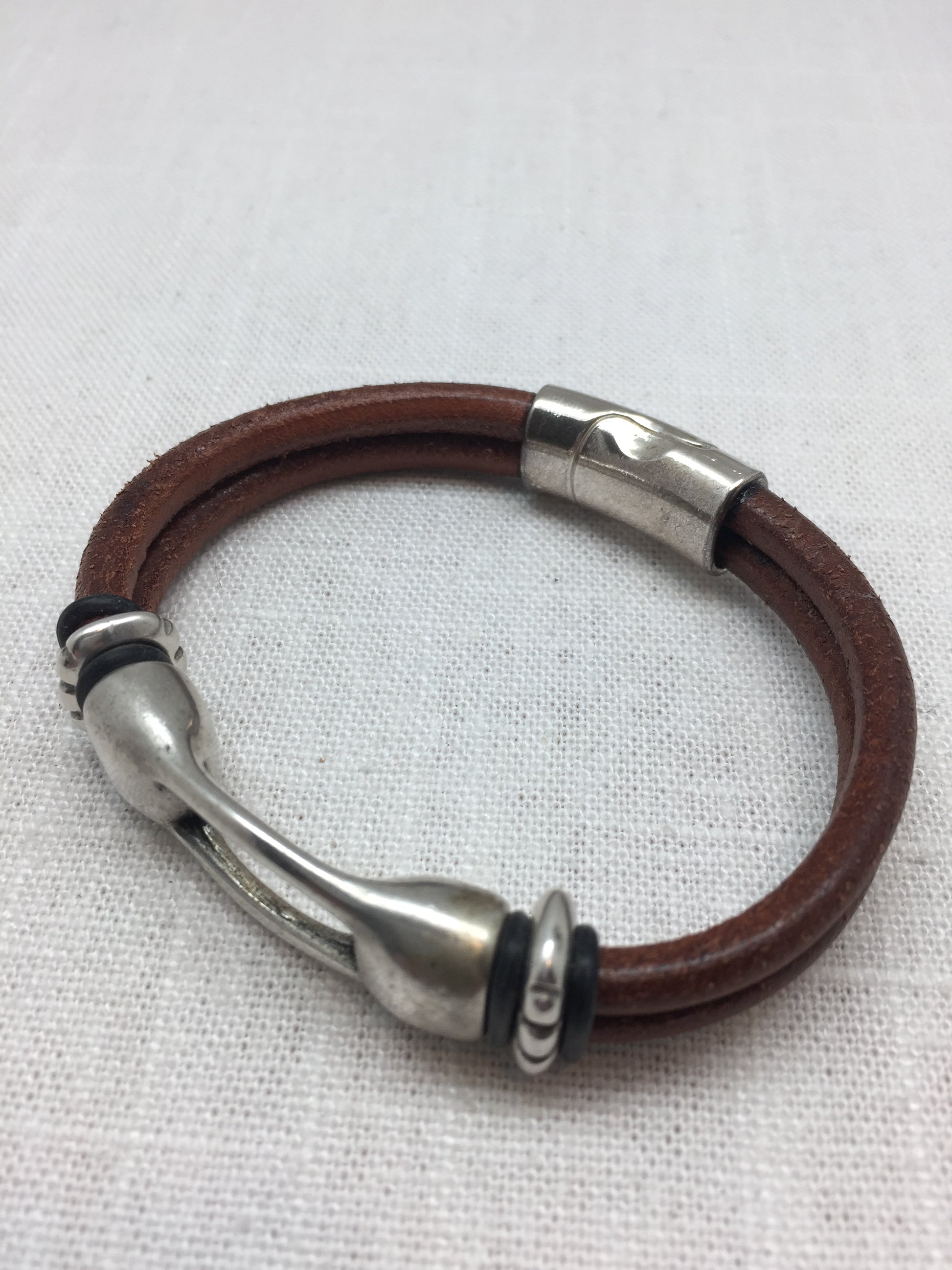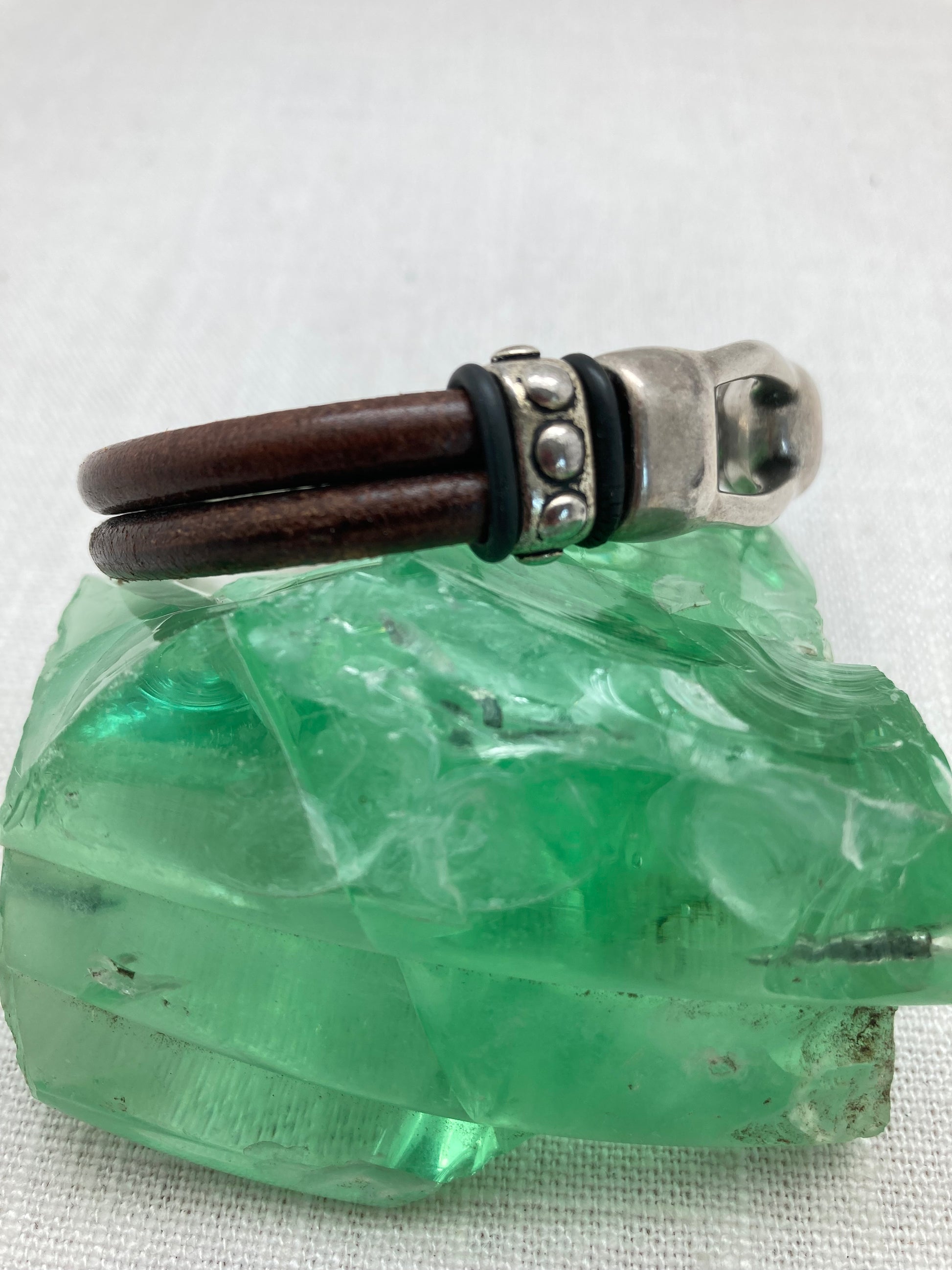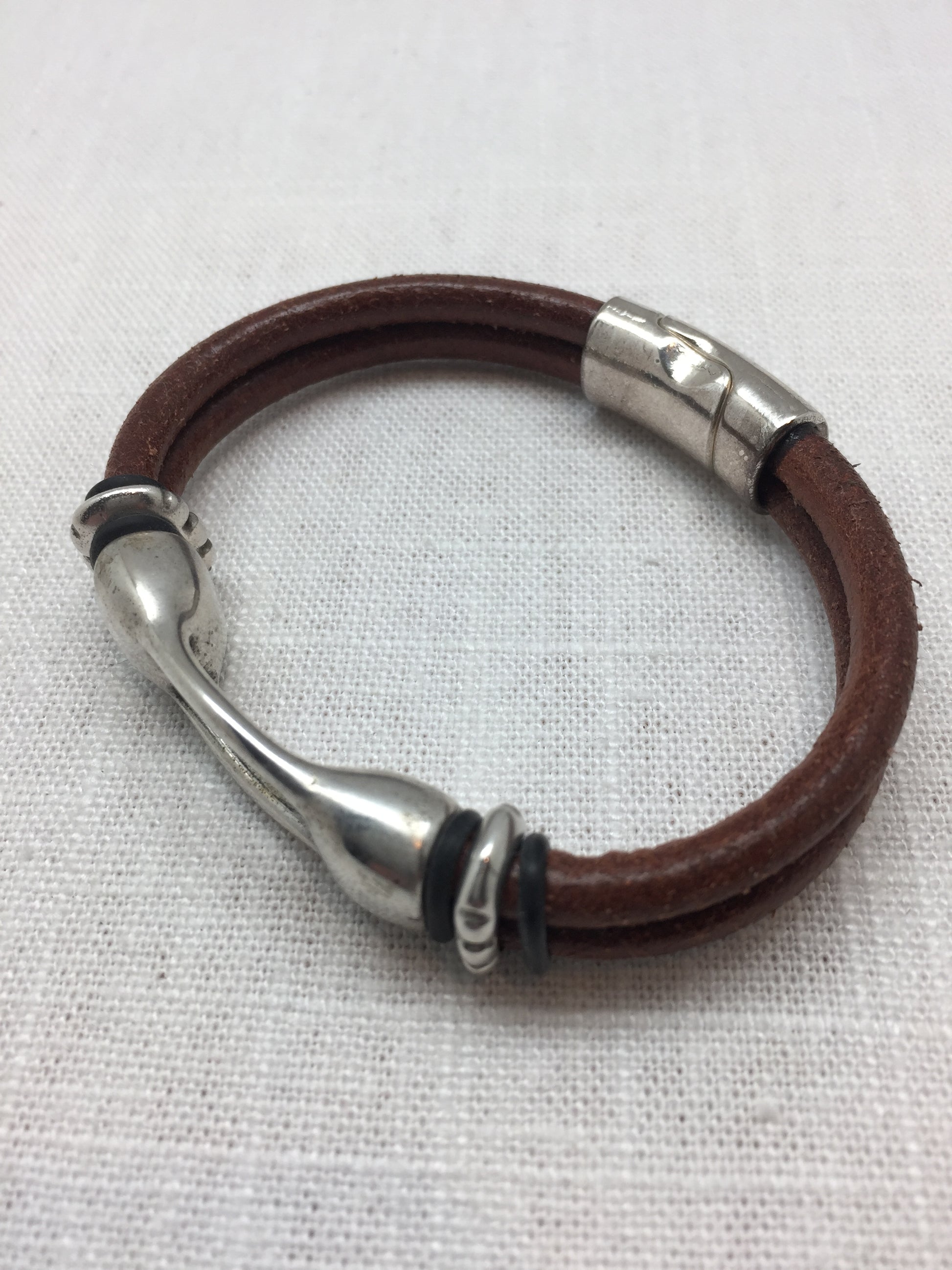 This is a revamped bebop favorite. Now made with beautiful, smooth saddle brown leather and black accents, the classic bracelet still sports the same antique silver focal.
