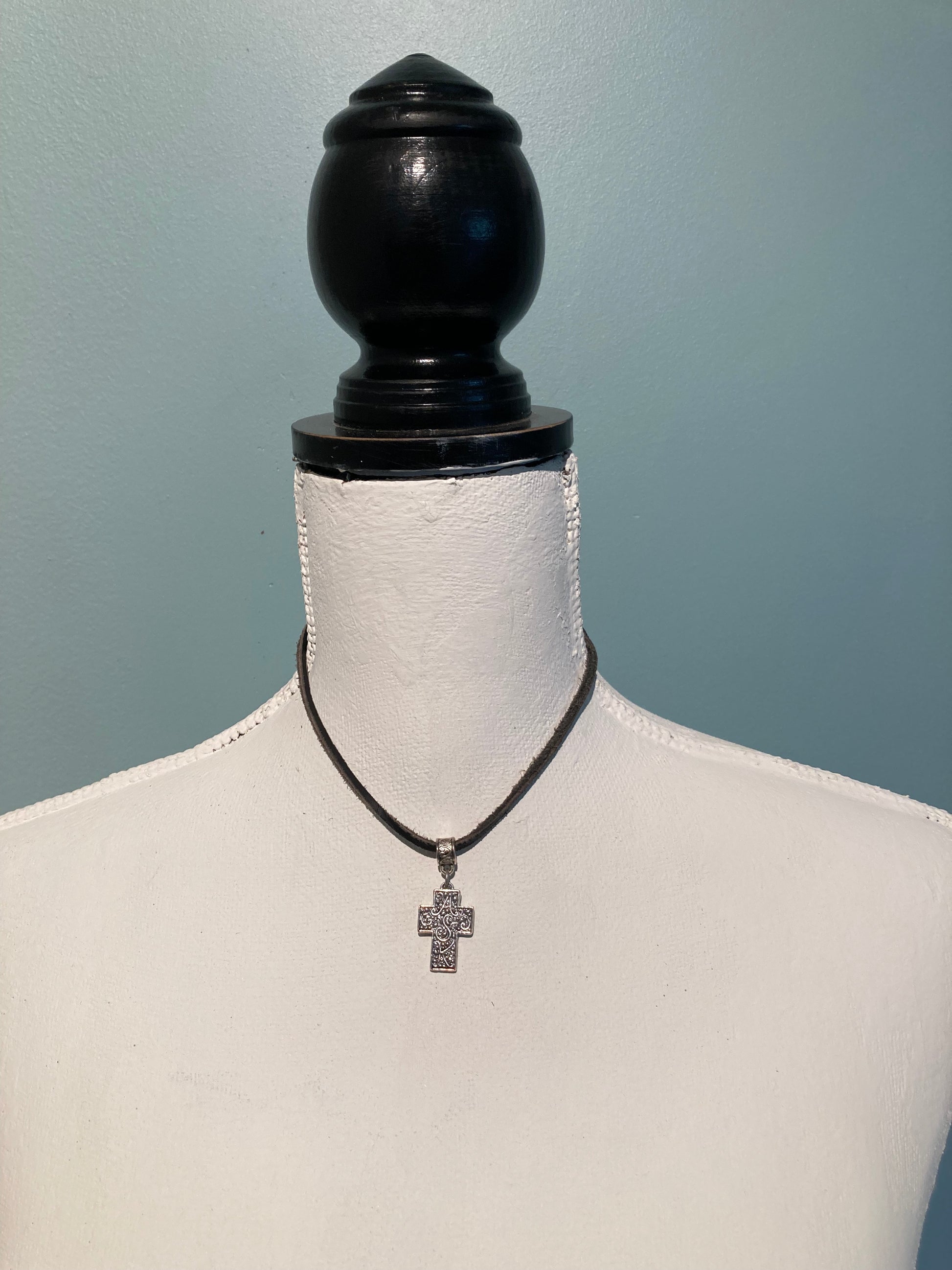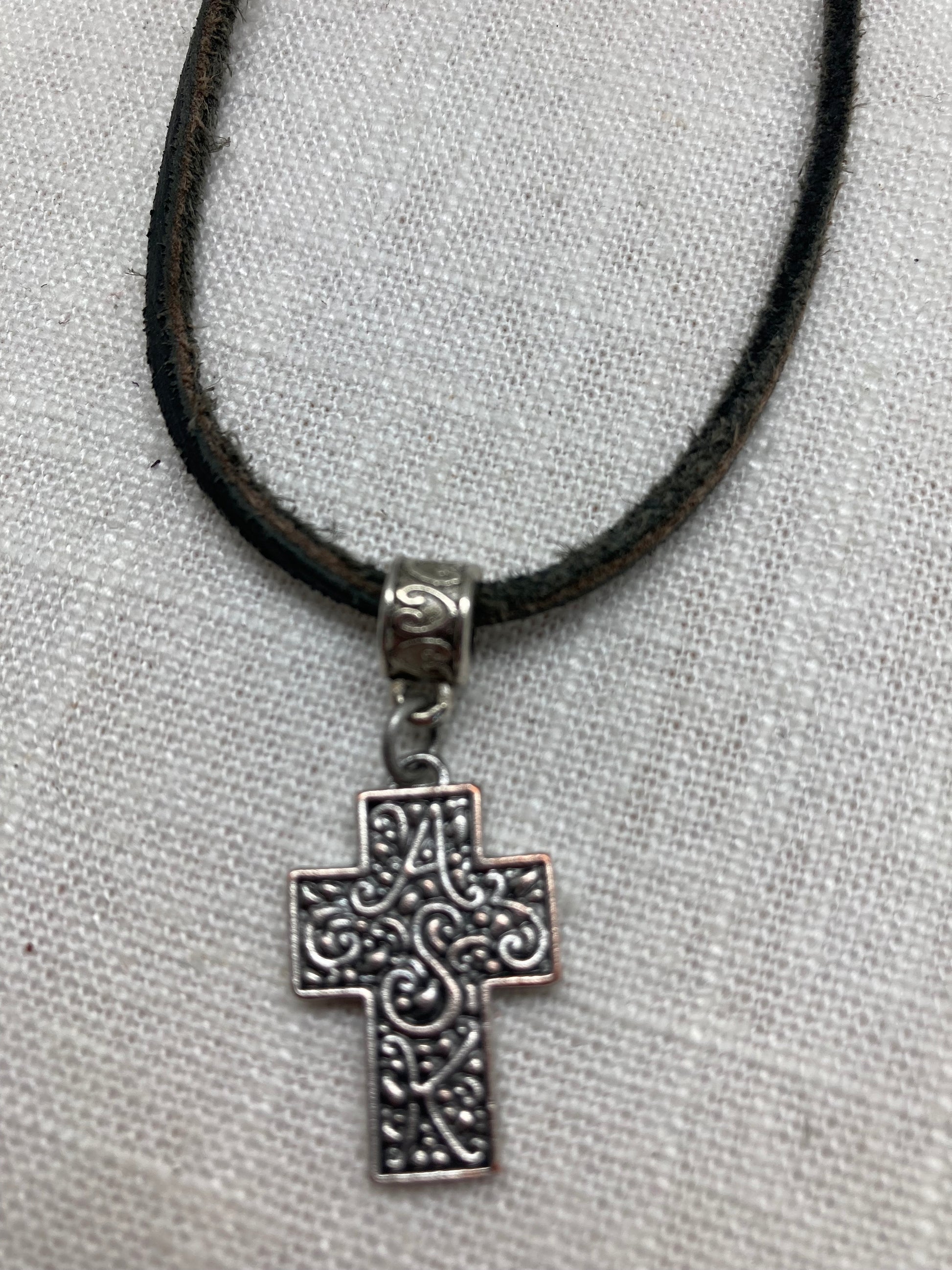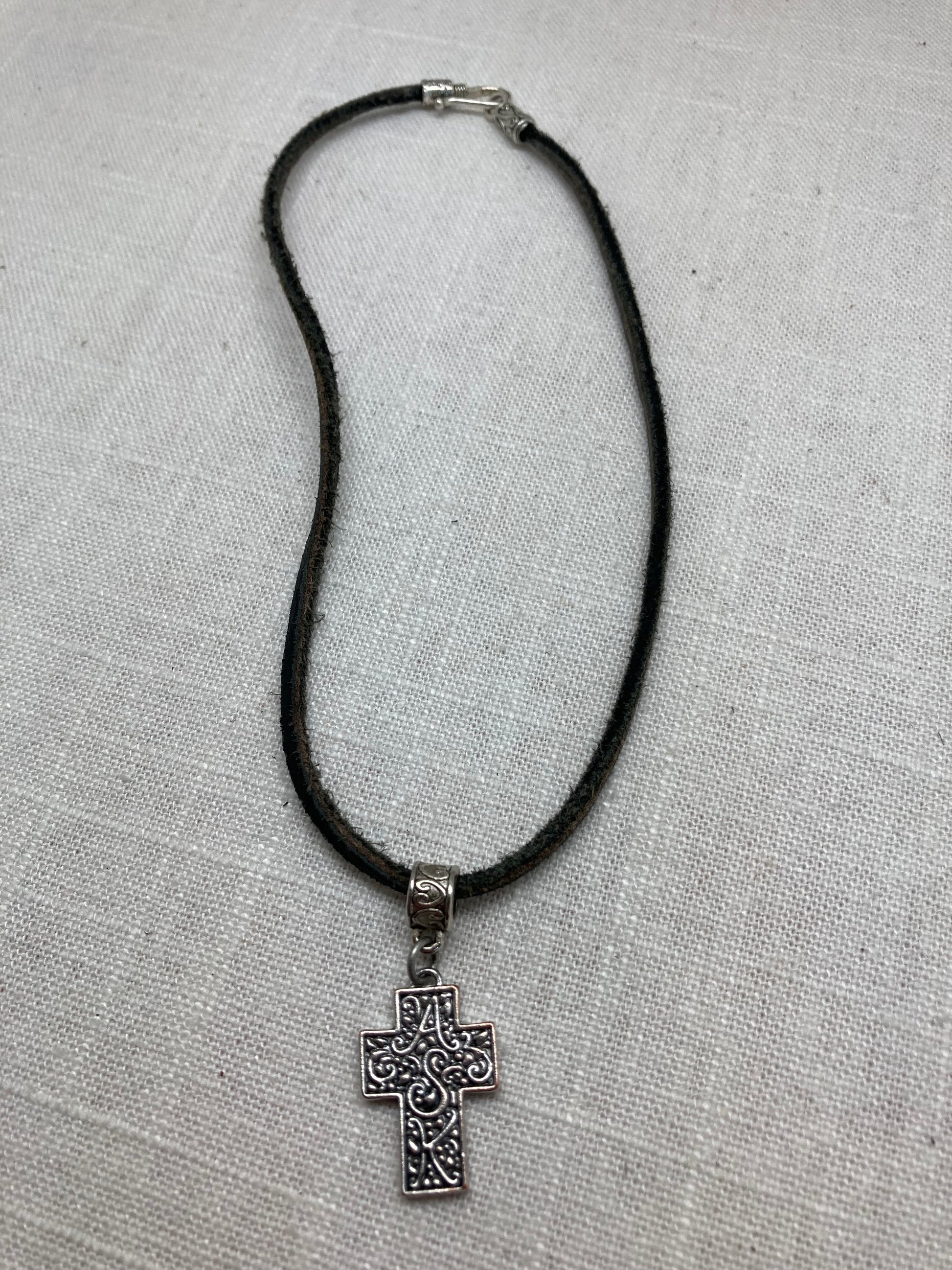 This is a very rustic square leather cord that has been softened and faded by weather.I've attached some different charms to different lengths of it and together they exude a very casual vibe.