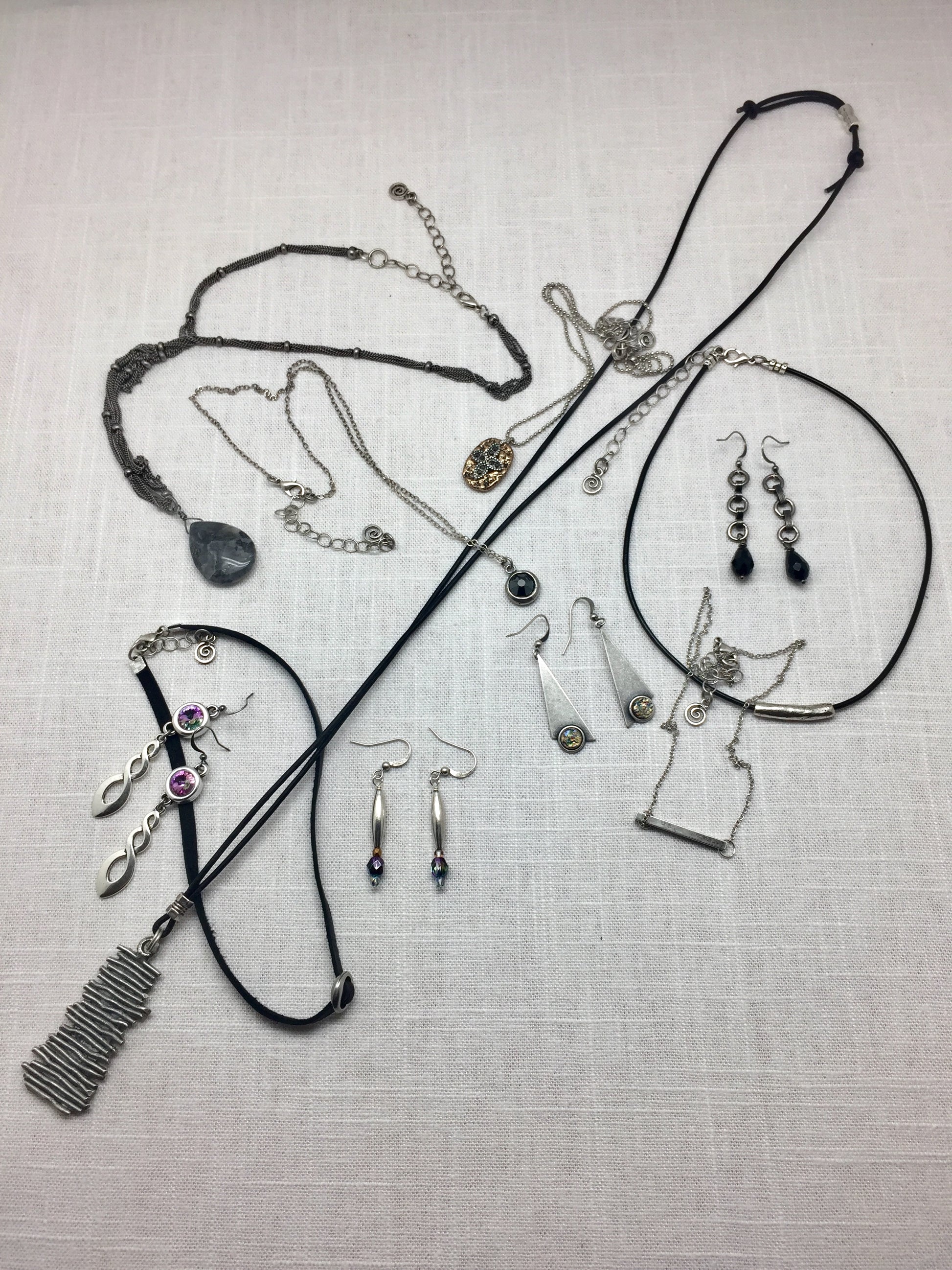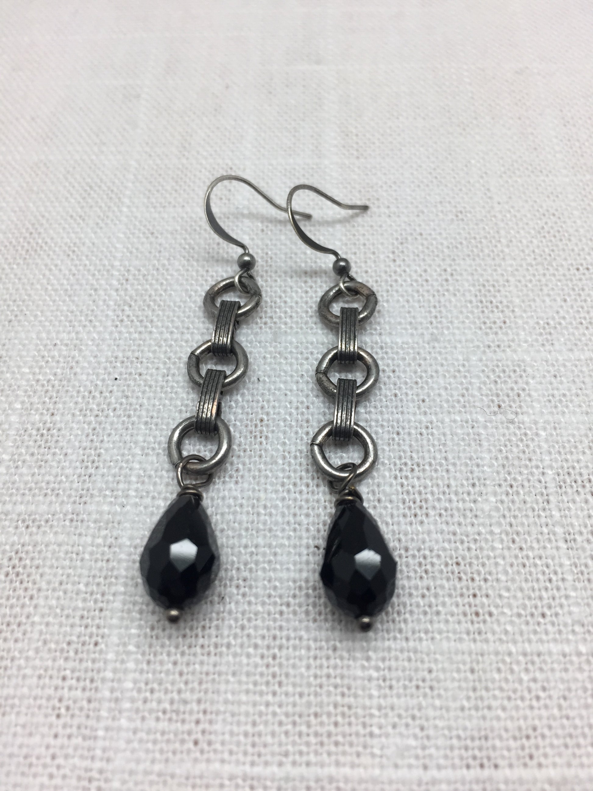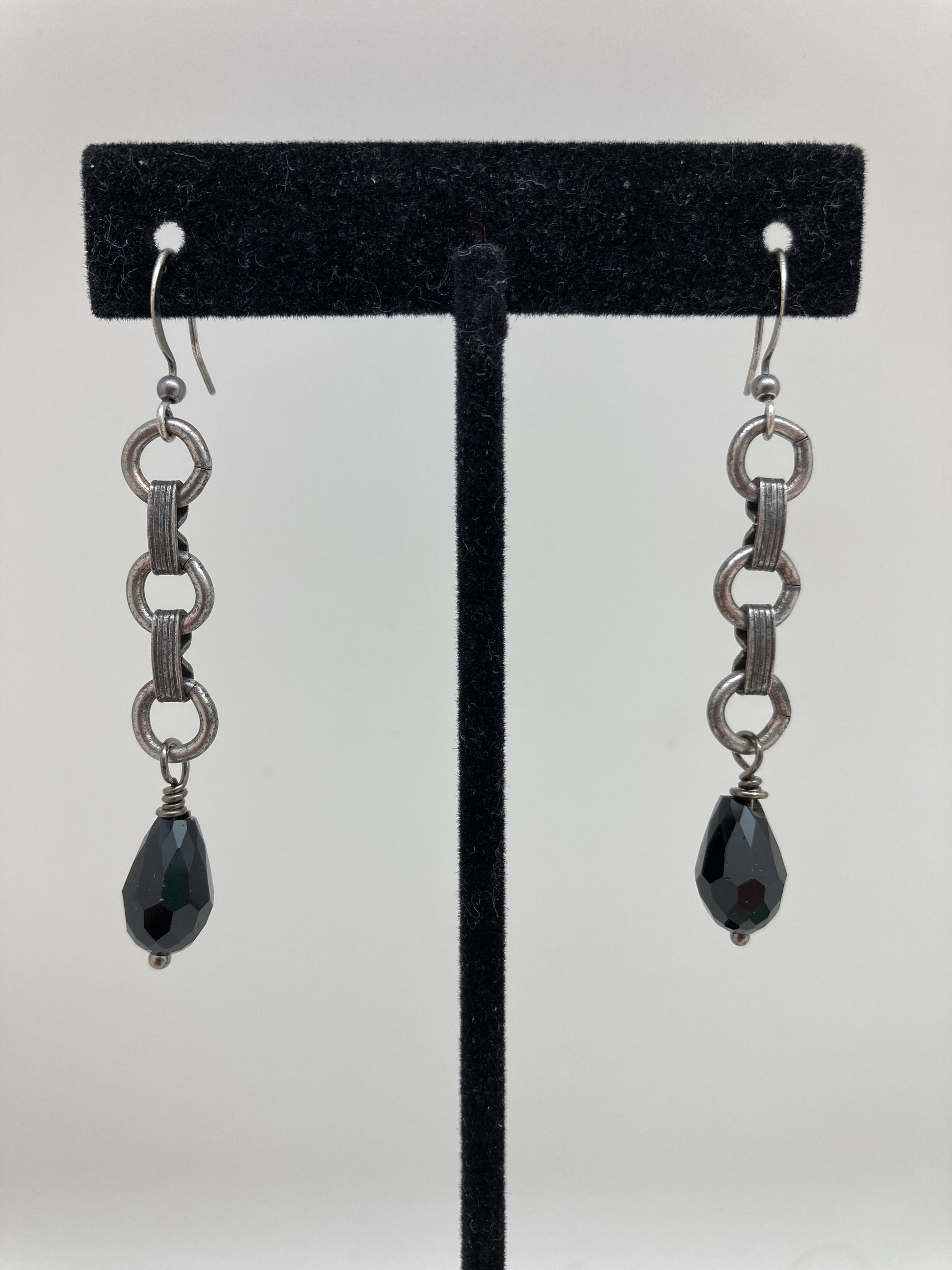 A sparkling black briolette hangs from a section of industrial silver chain.