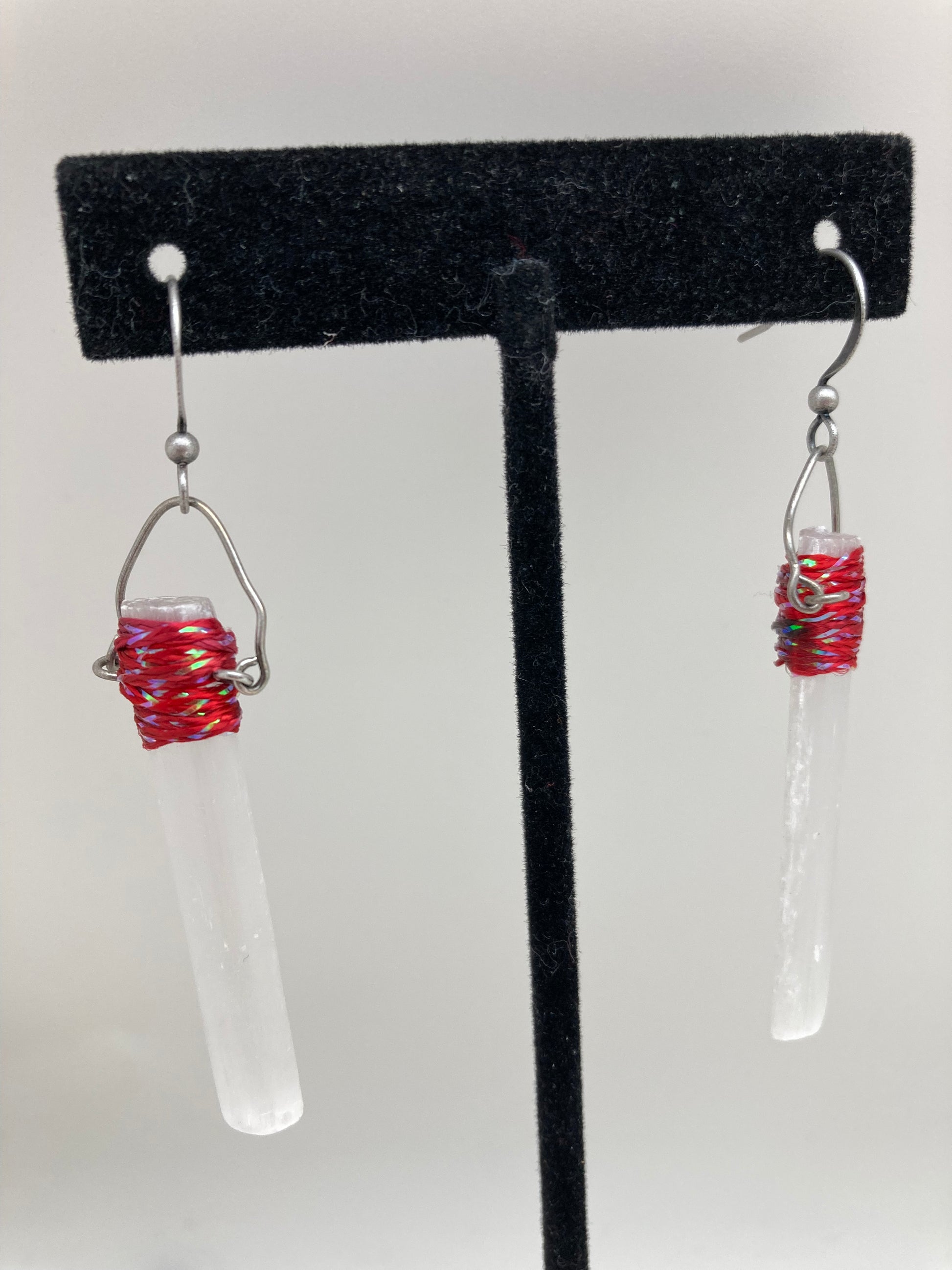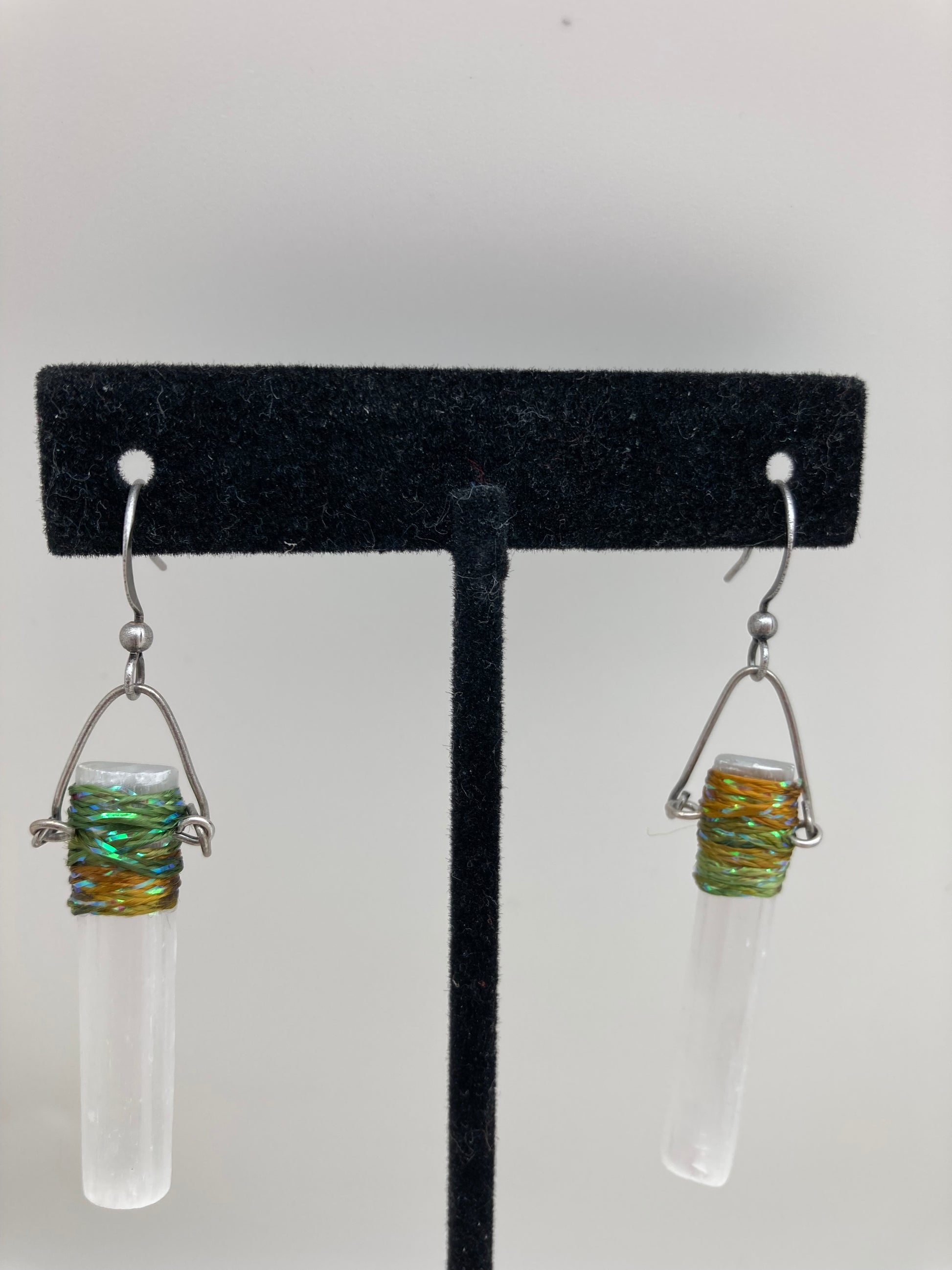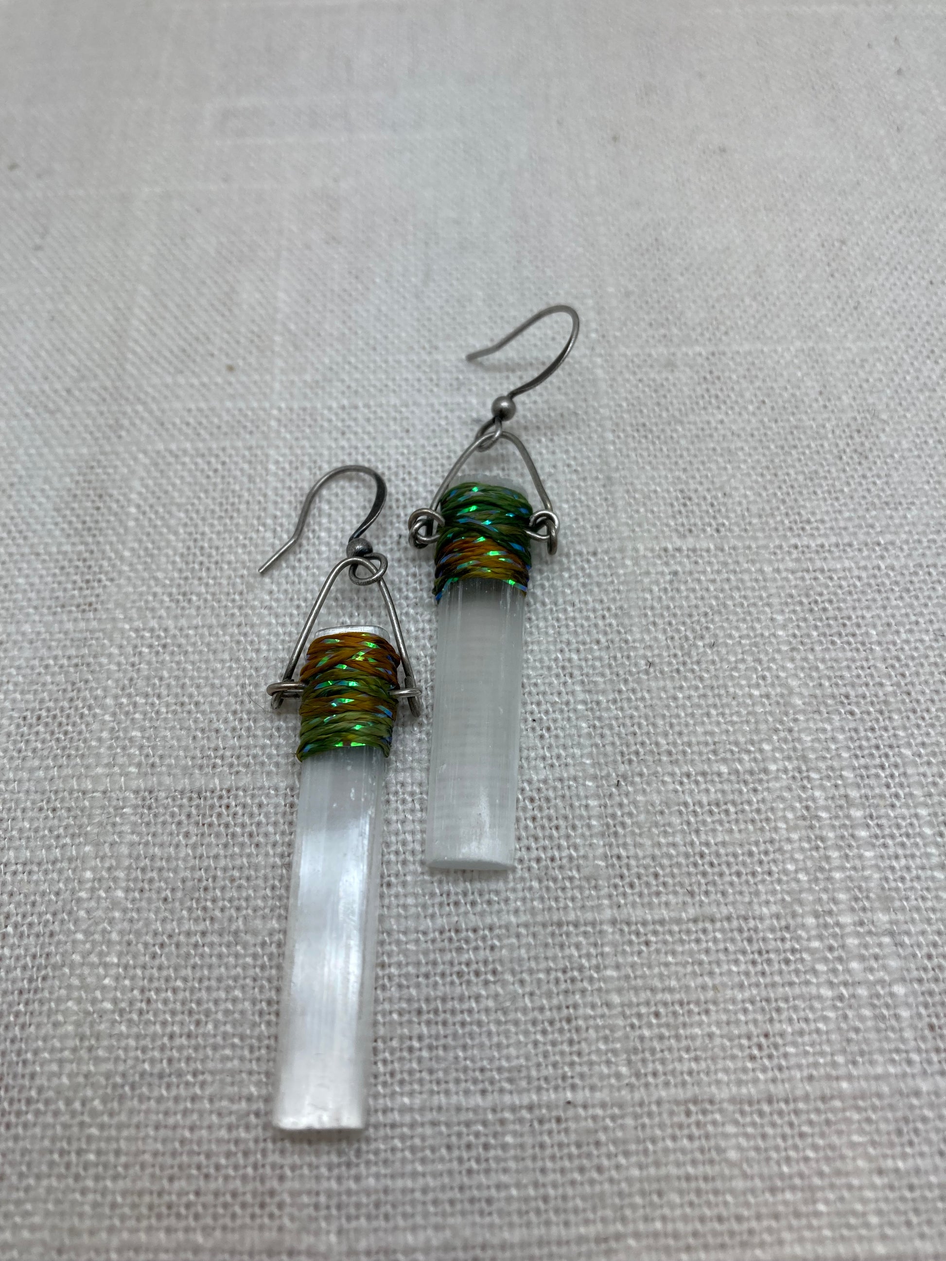 Selenite is a variety of gypsum. It is a very soft mineral that comes in pale shades of ivory and white. These selenite bars are organically and gently wired and wrapped to form a unique statement earring.