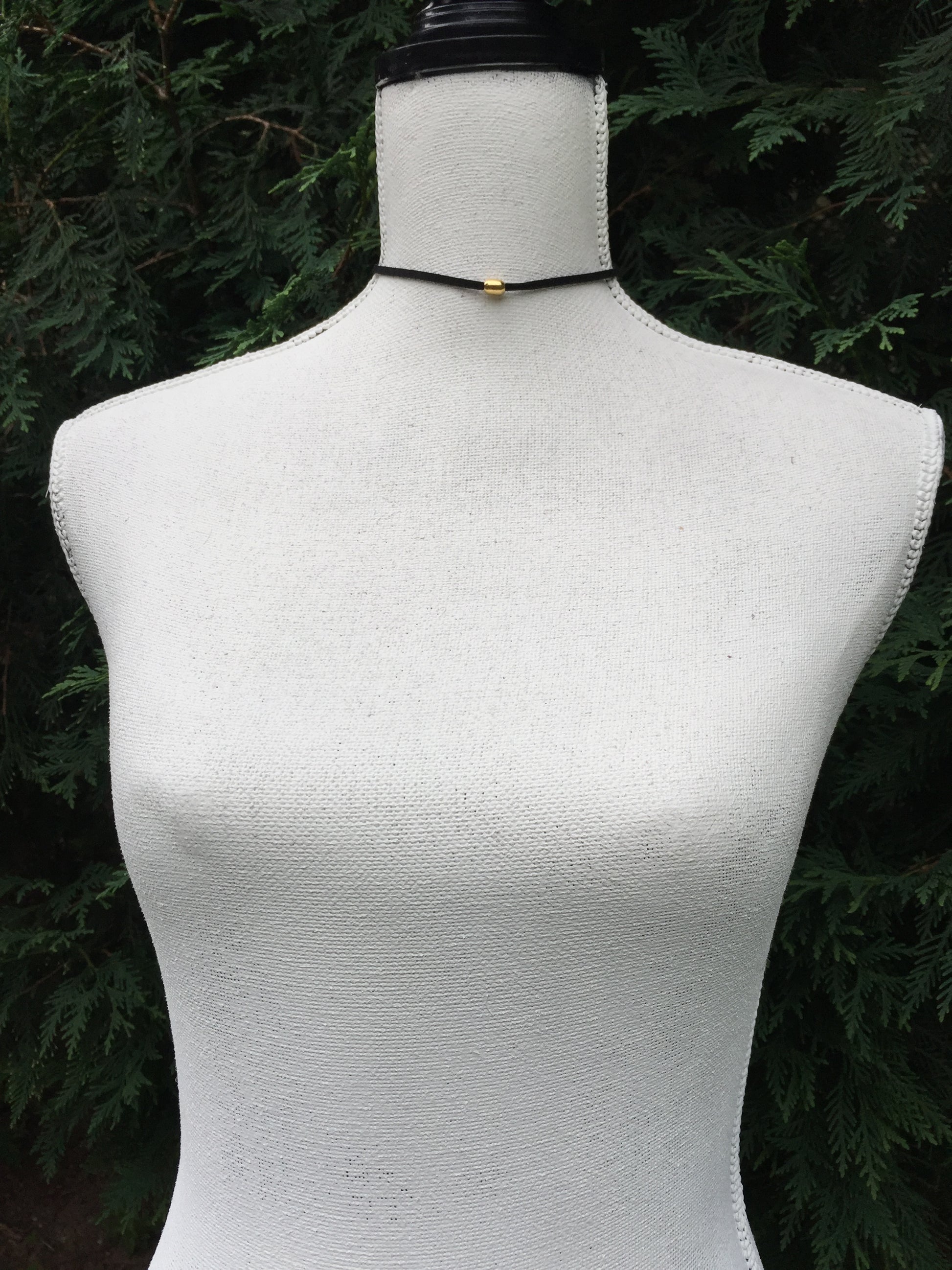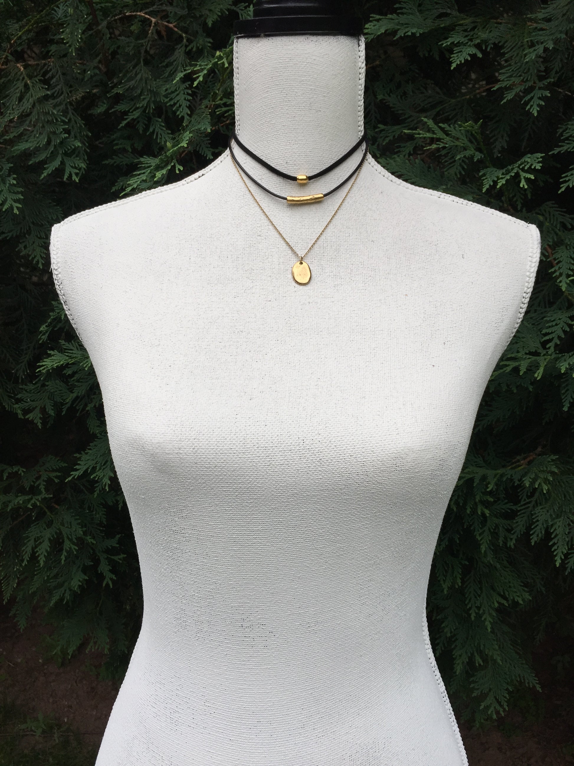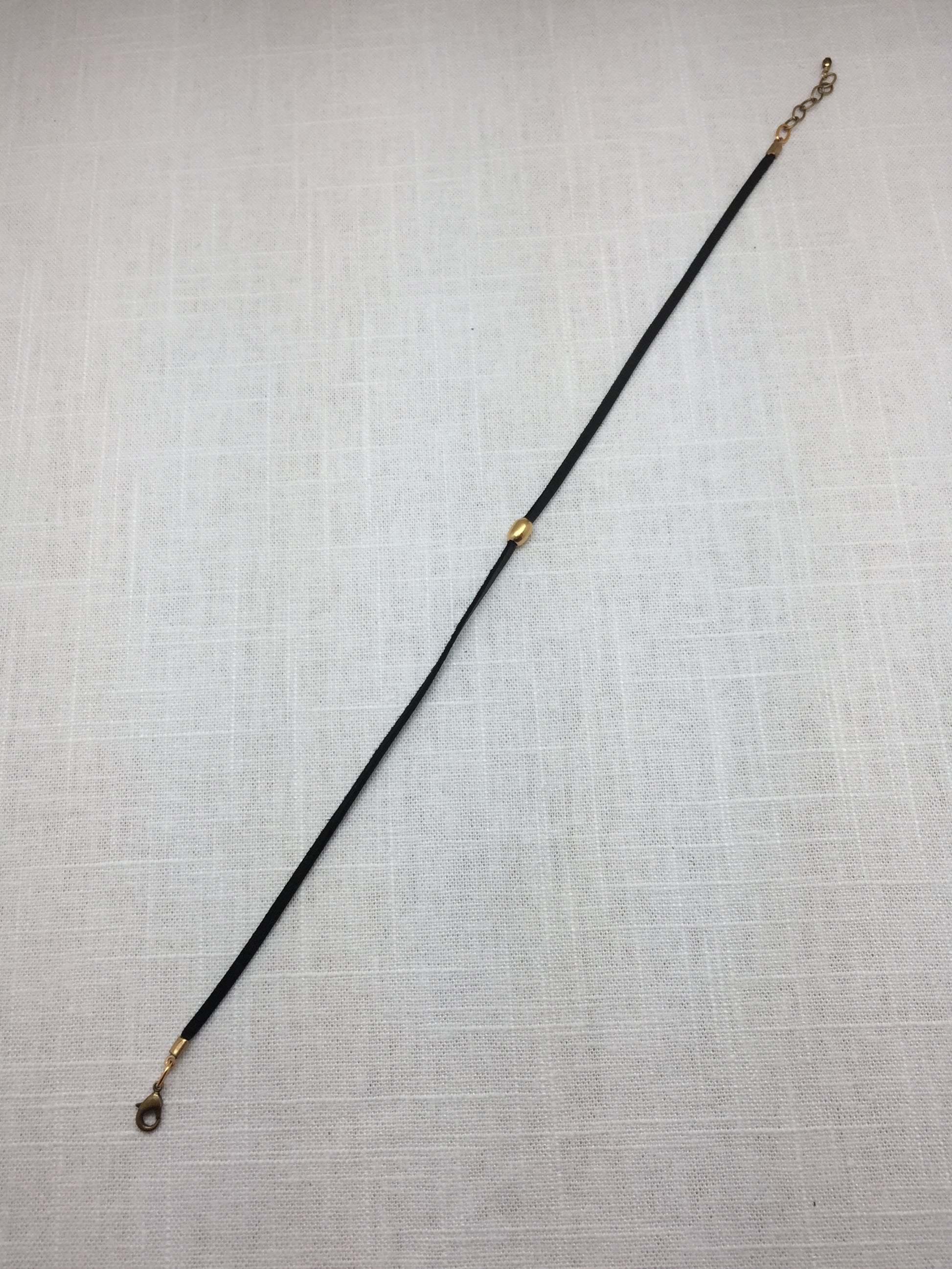 The shortest of the gold layering pieces, this deerskin lace showcases an antique gold rice shaped bead.