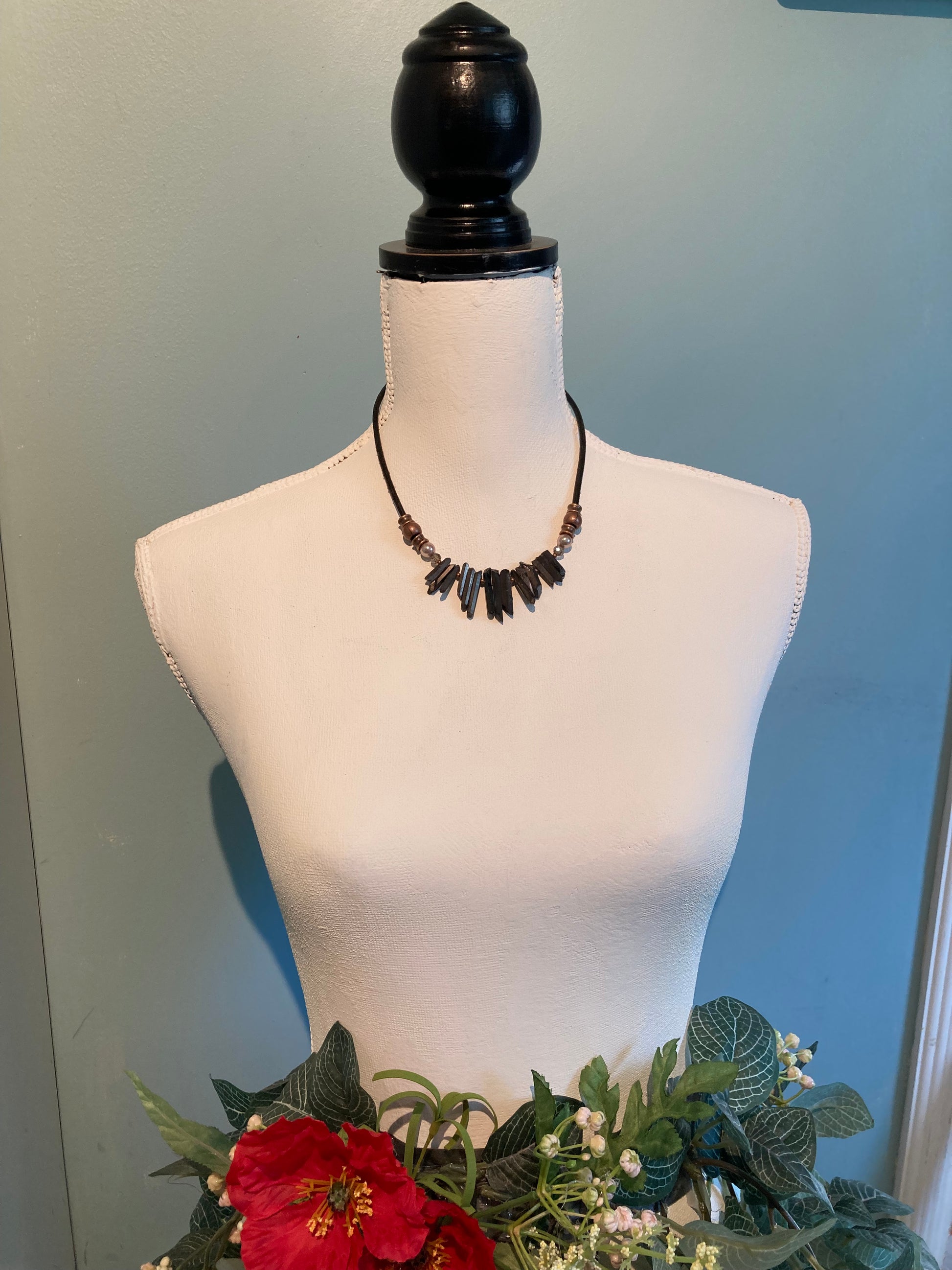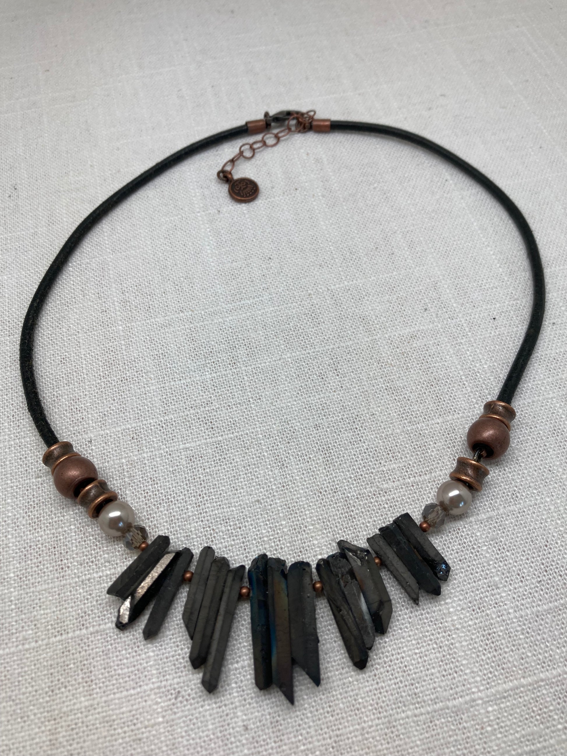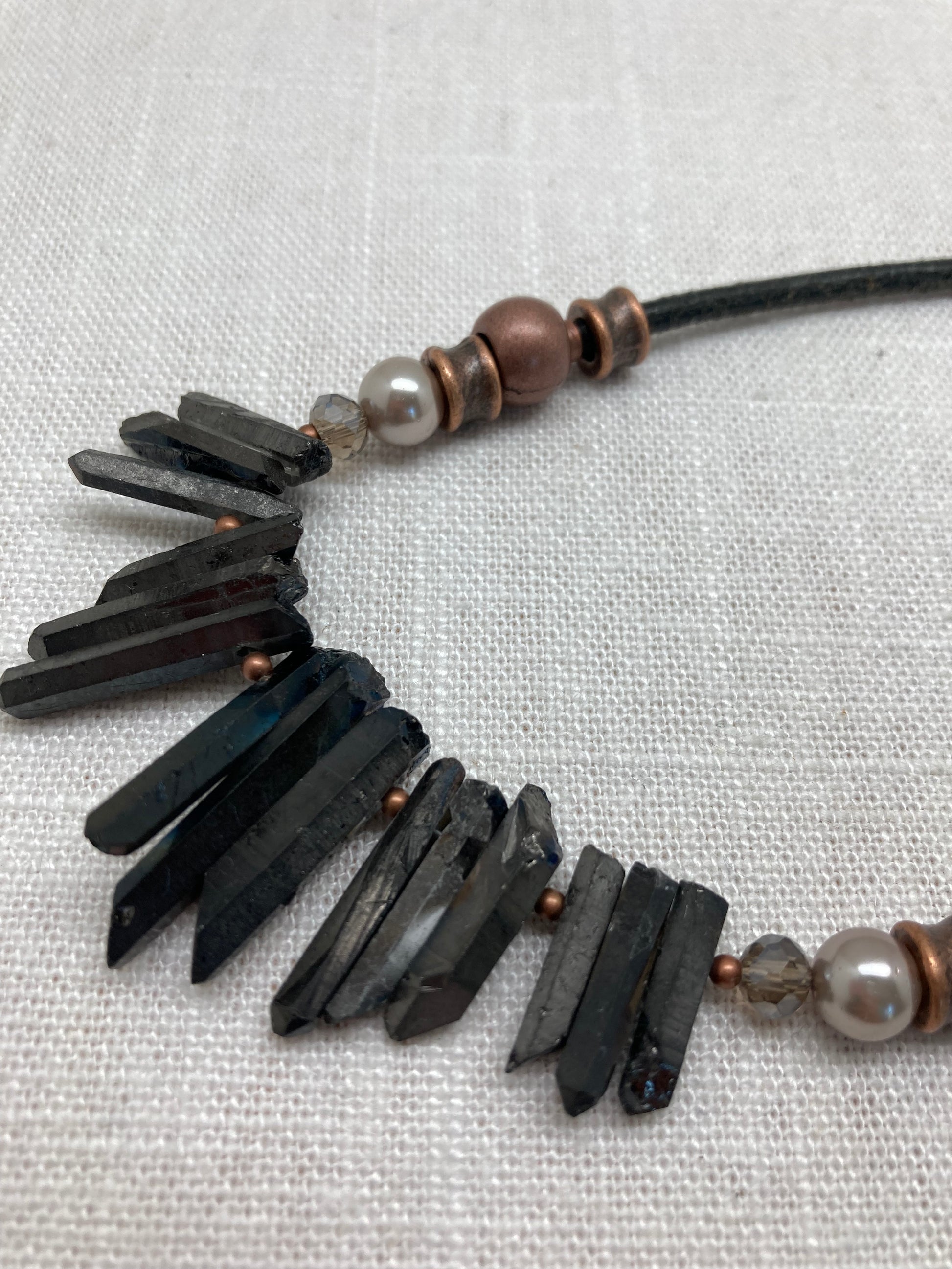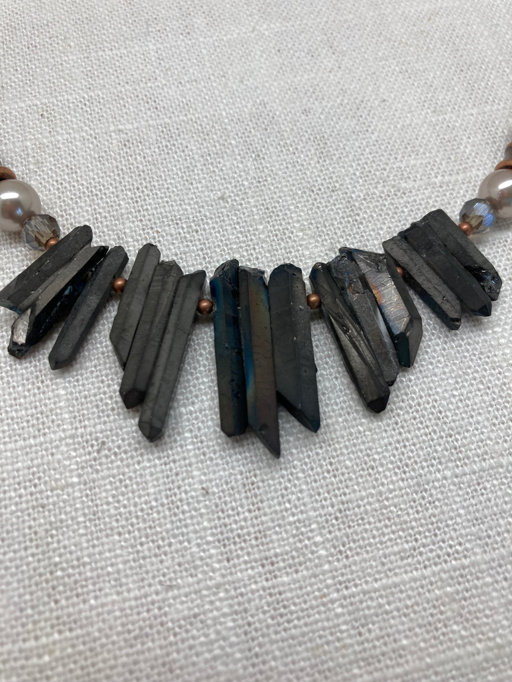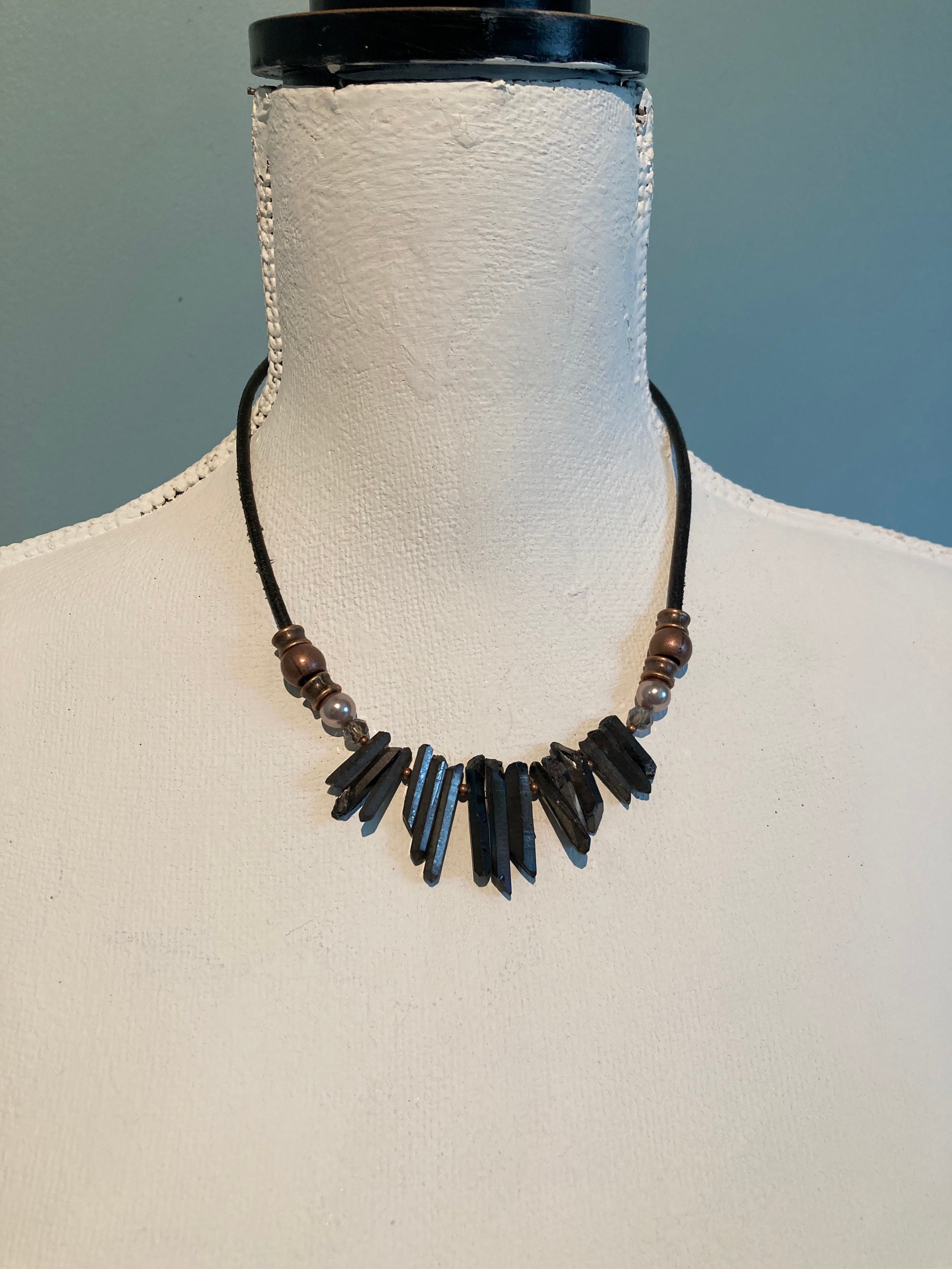 This an eye catching combination of copper and smoky quartz spears. I've also added smoky quartz beads and even a couple of mauve pearls. Rustic but a little fancy!