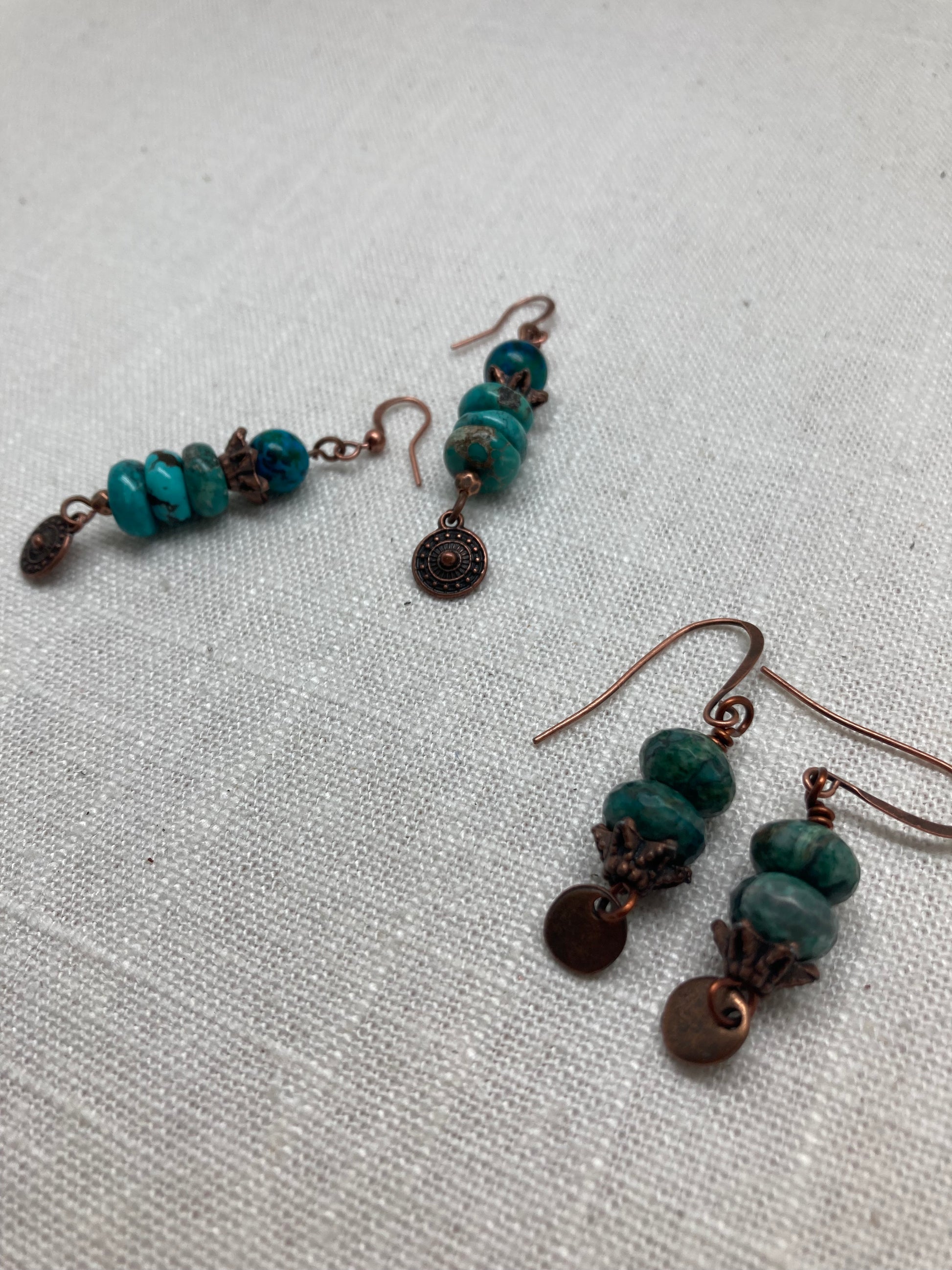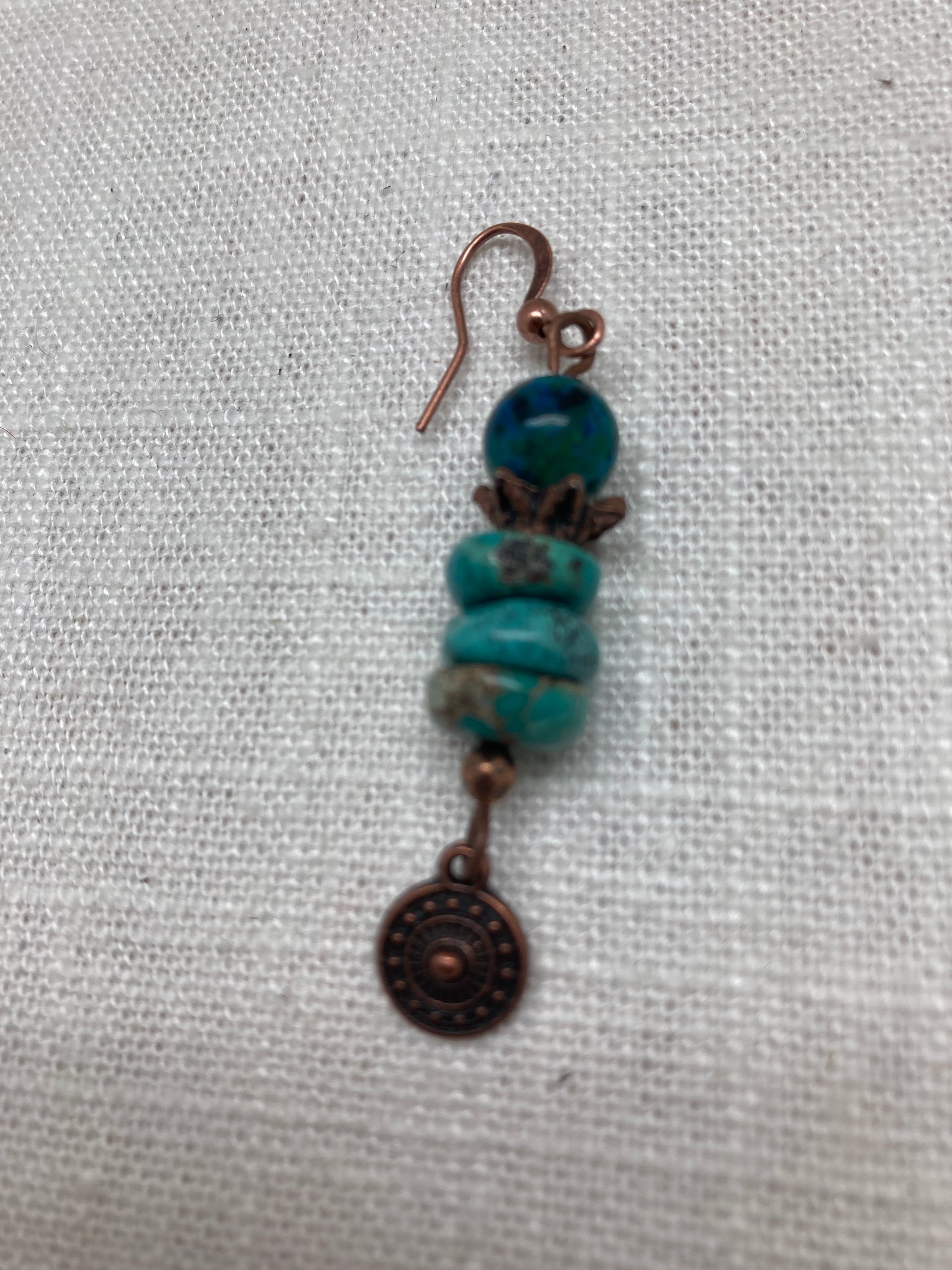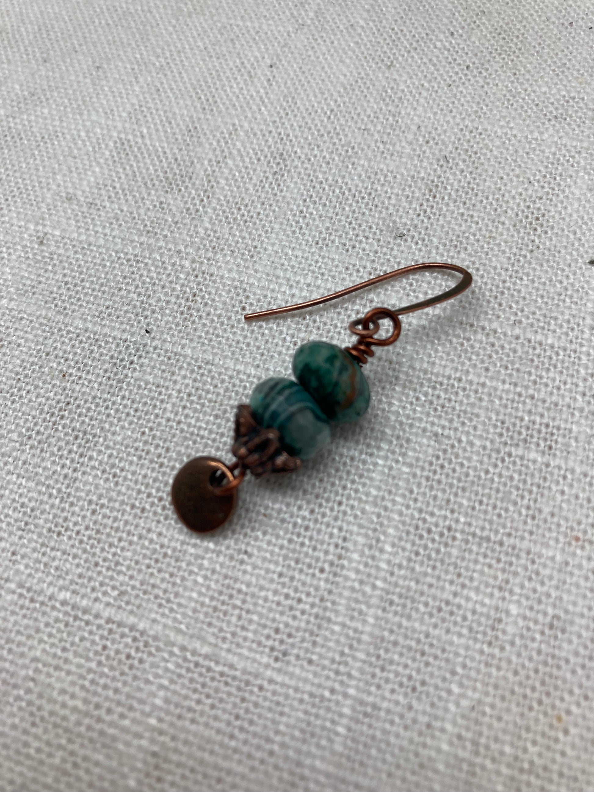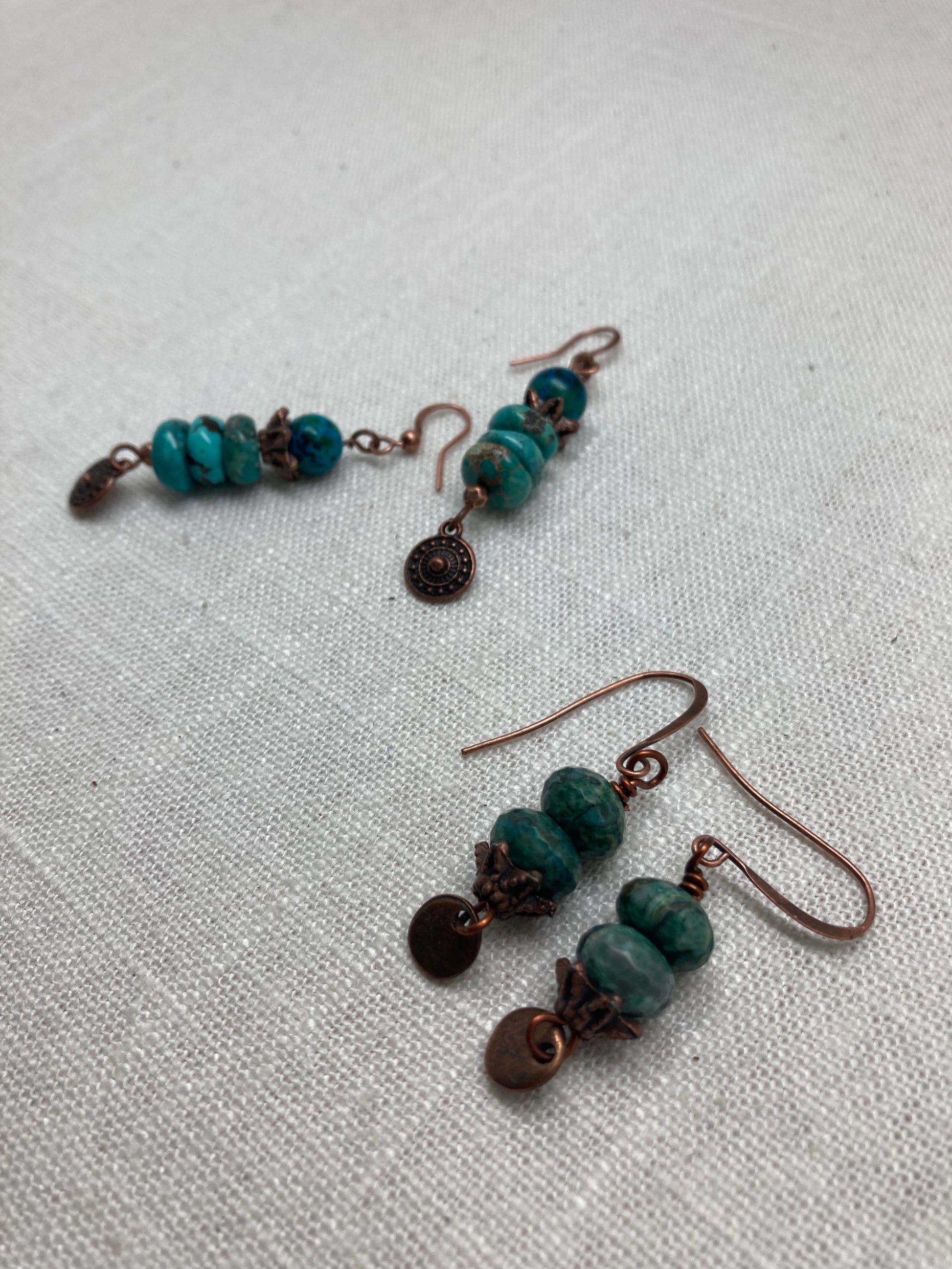 Stacked African turquoise rondelles top a tribal copper charm. These are a great casual earring that pair well with the entire copper collection.
