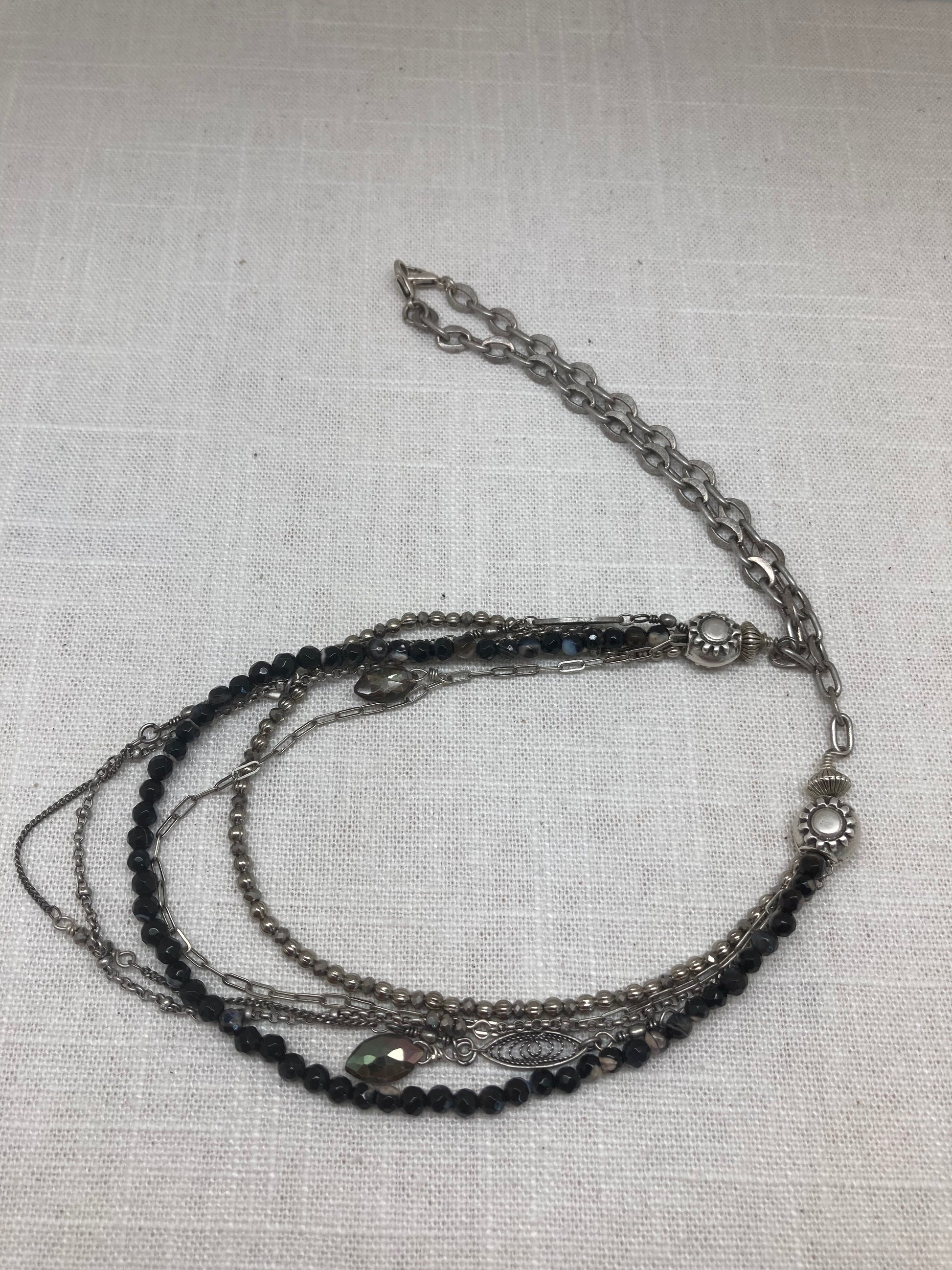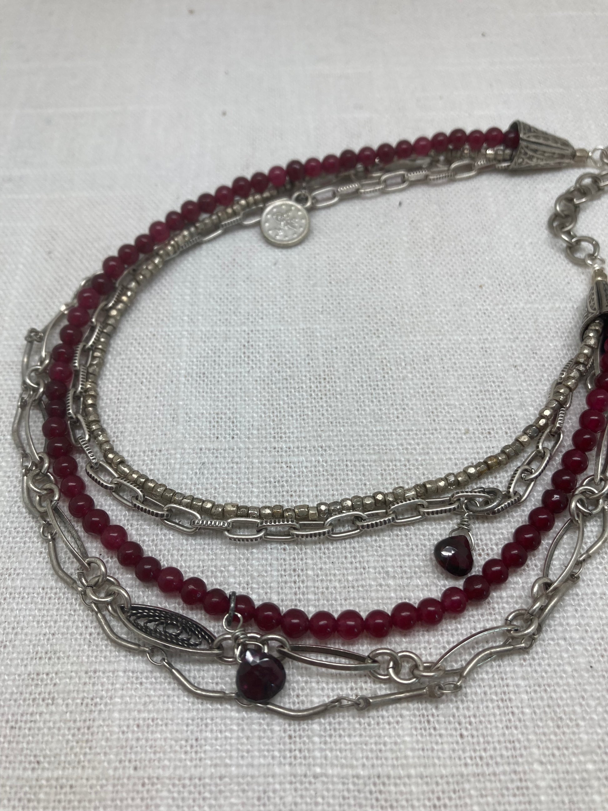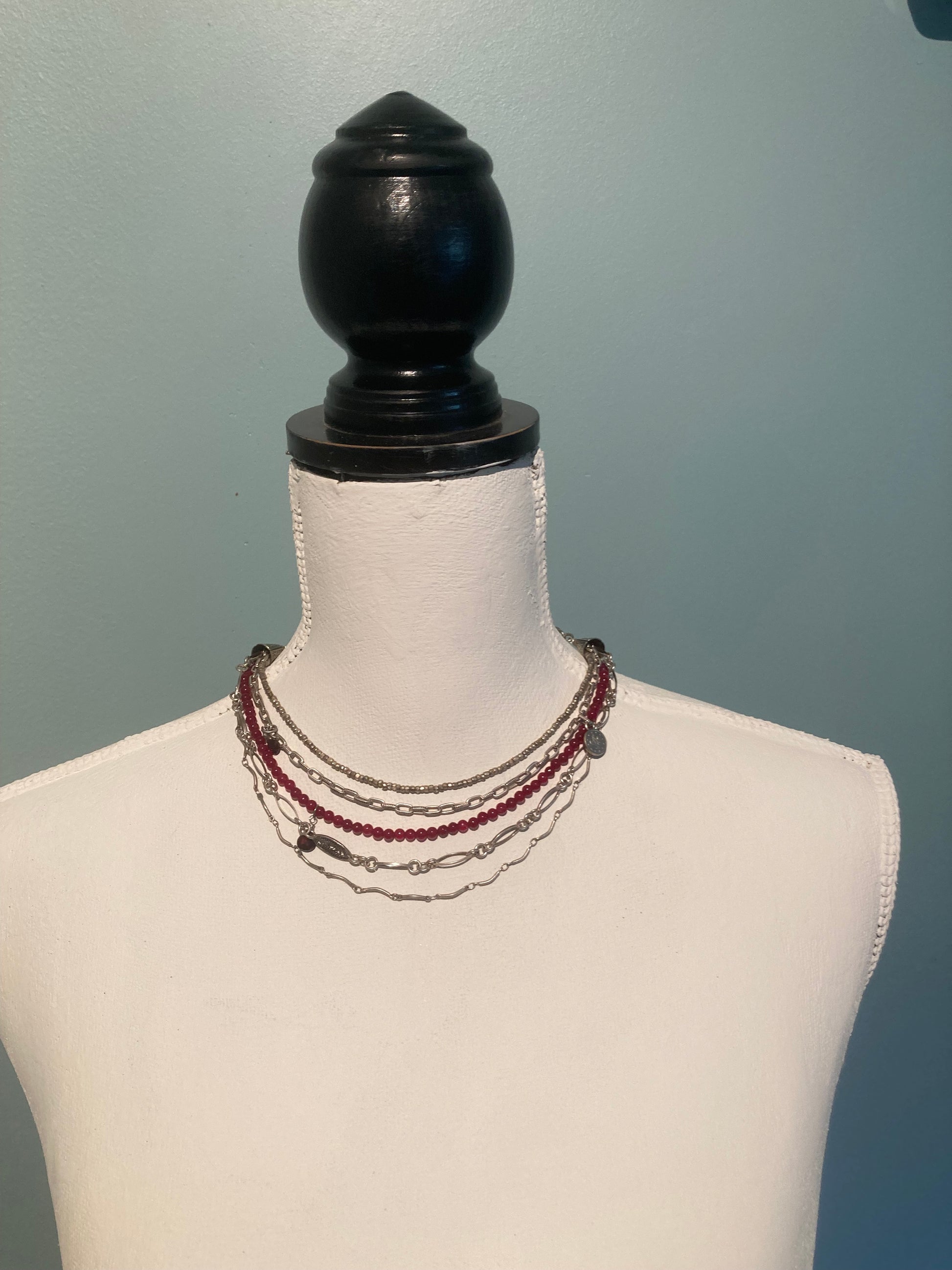 A collection of gemstone beads provide the rich color in this five strand necklace. Each necklace is unique but they are all breathtaking. Due to their adjustability, they can be modified to various lengths and worn with any neckline.