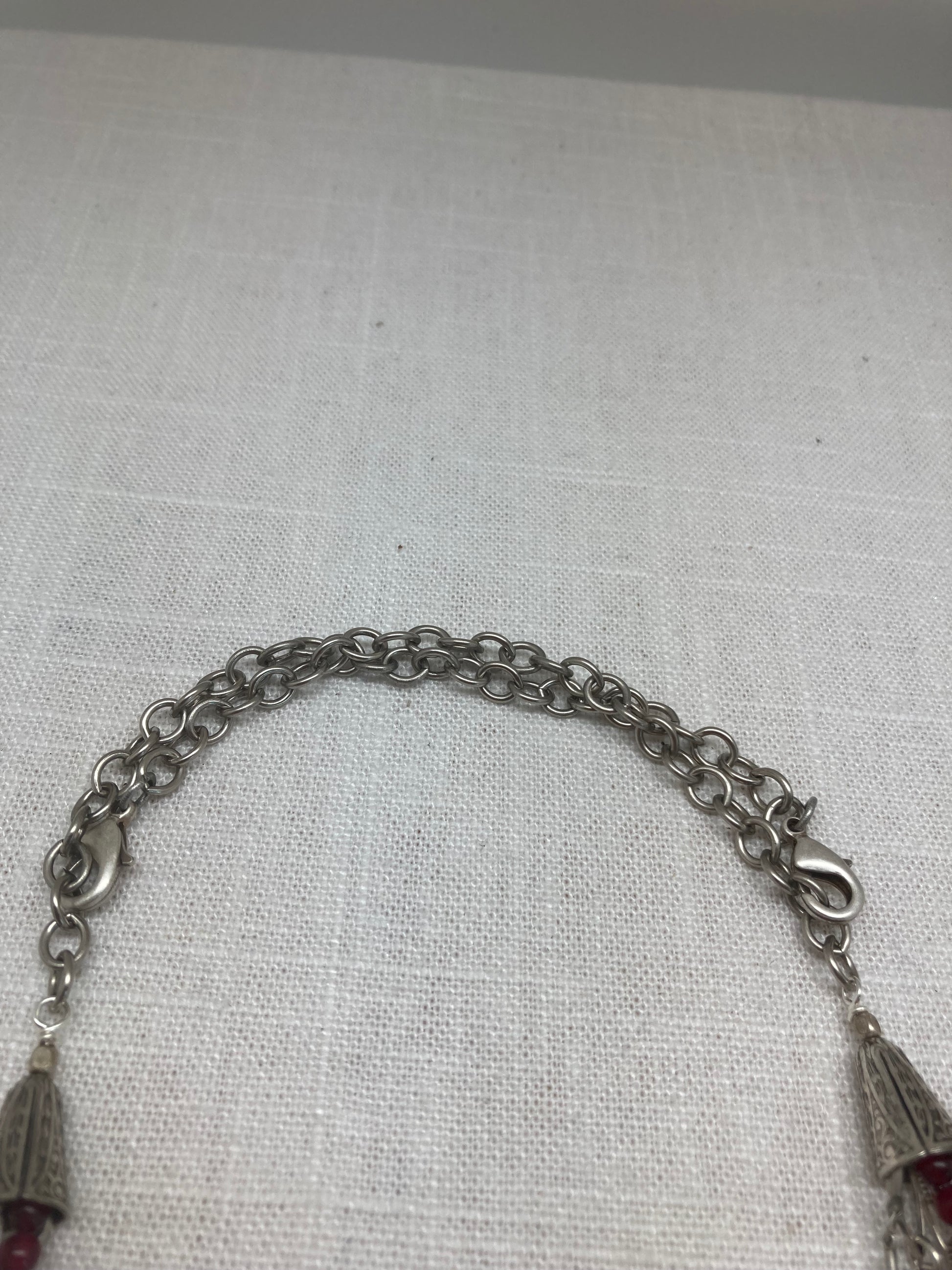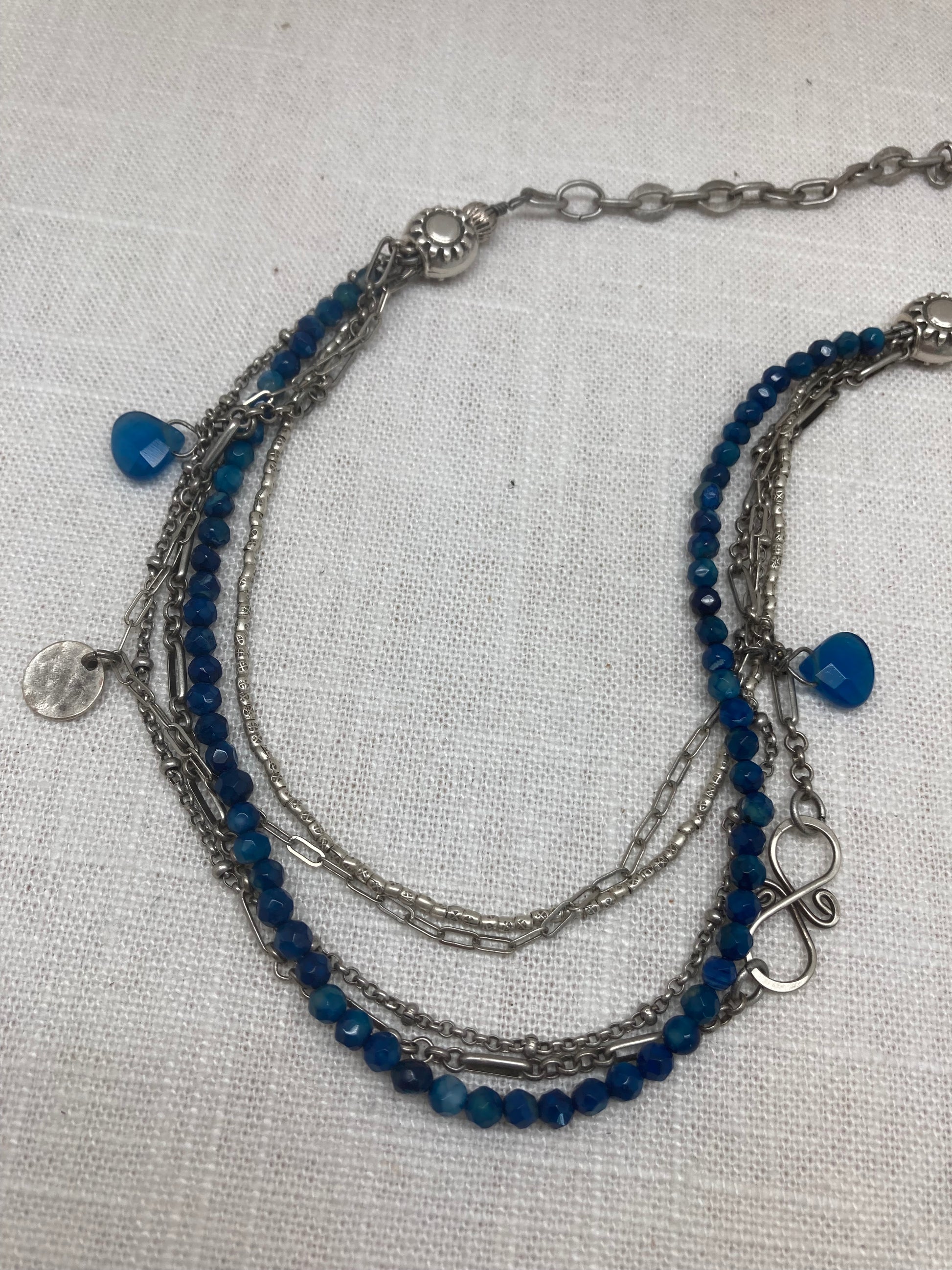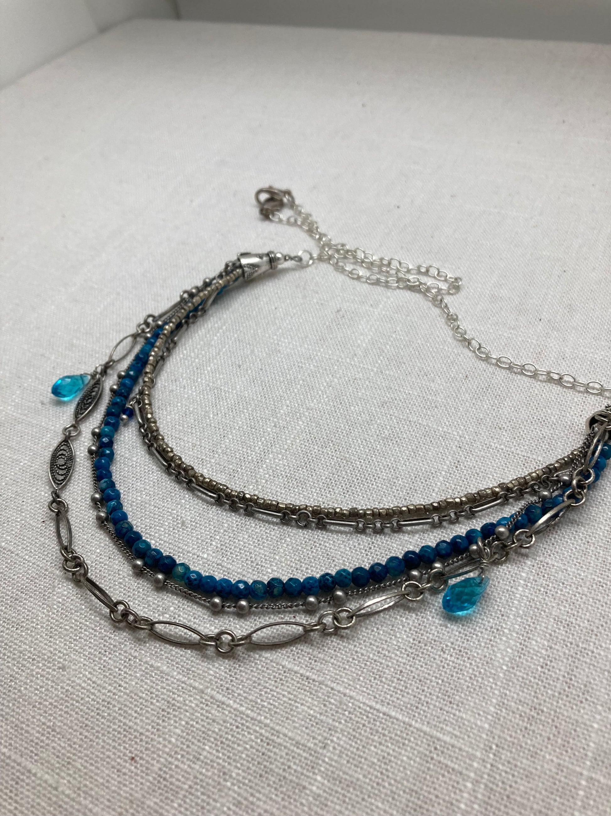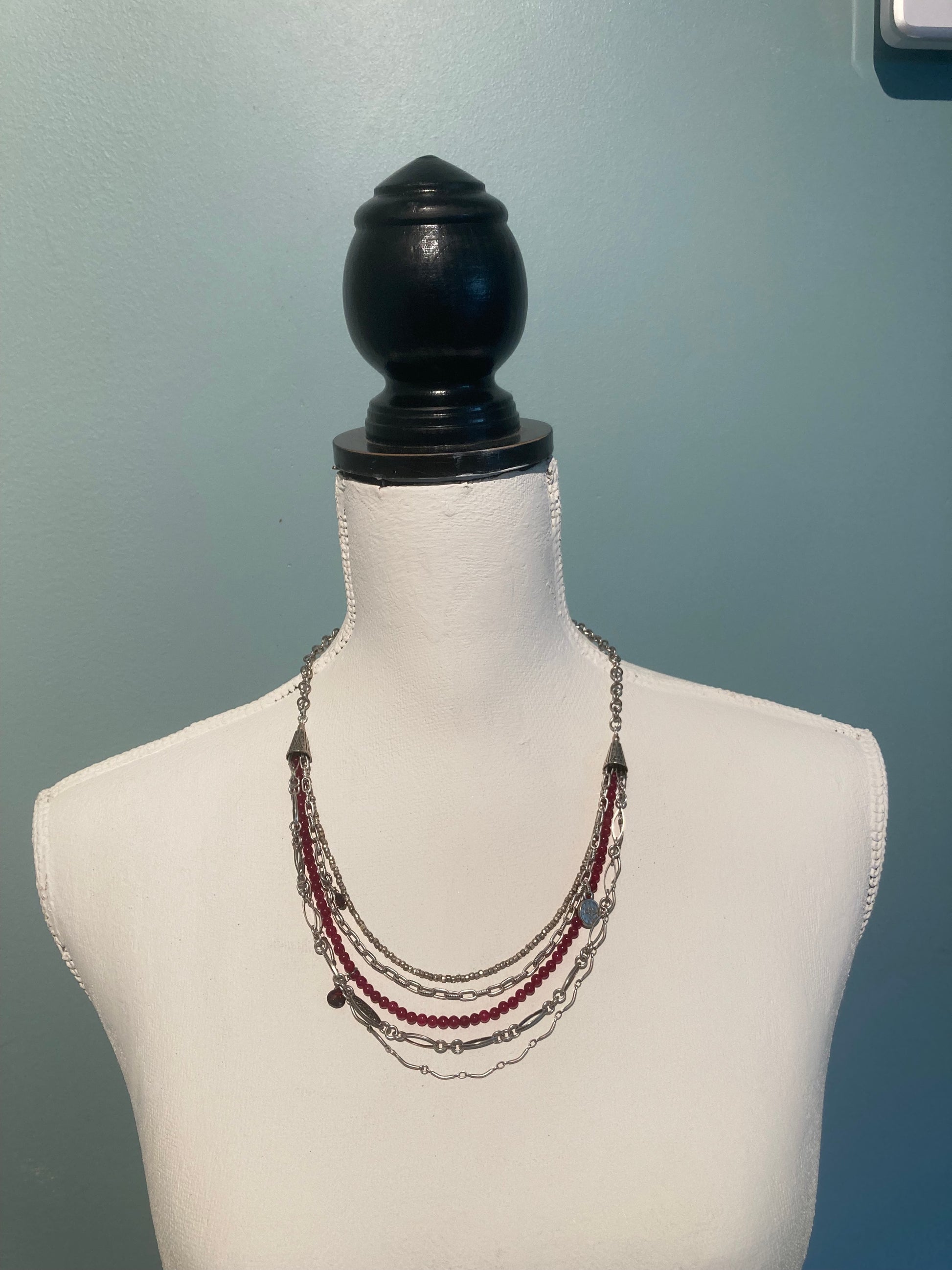 A collection of gemstone beads provide the rich color in this five strand necklace. Each necklace is unique but they are all breathtaking. Due to their adjustability, they can be modified to various lengths and worn with any neckline.