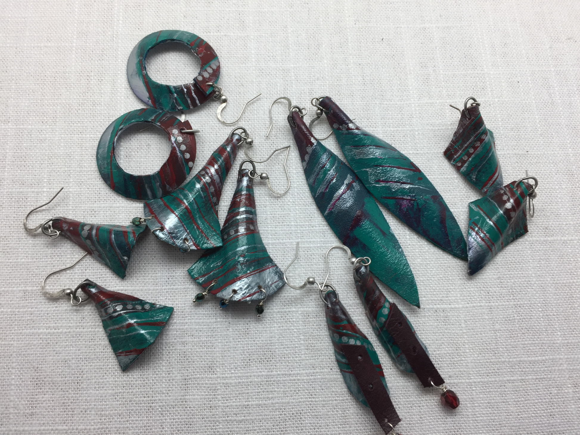 teal and silver painted leather earrings