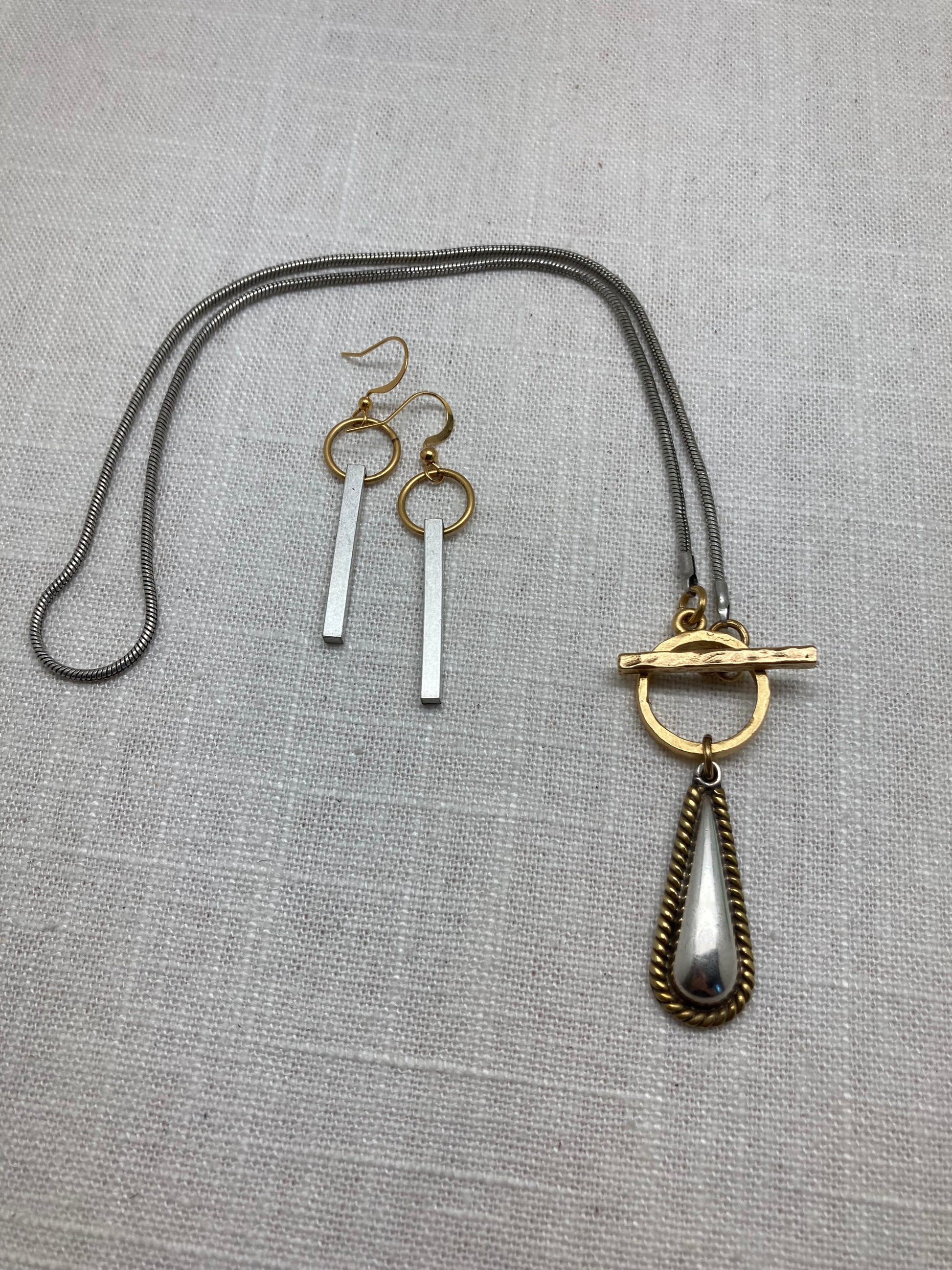 Recycled mixed metal pendant attached to a hammered antique gold toggle clasp with a contrasting antique silver snake chain.