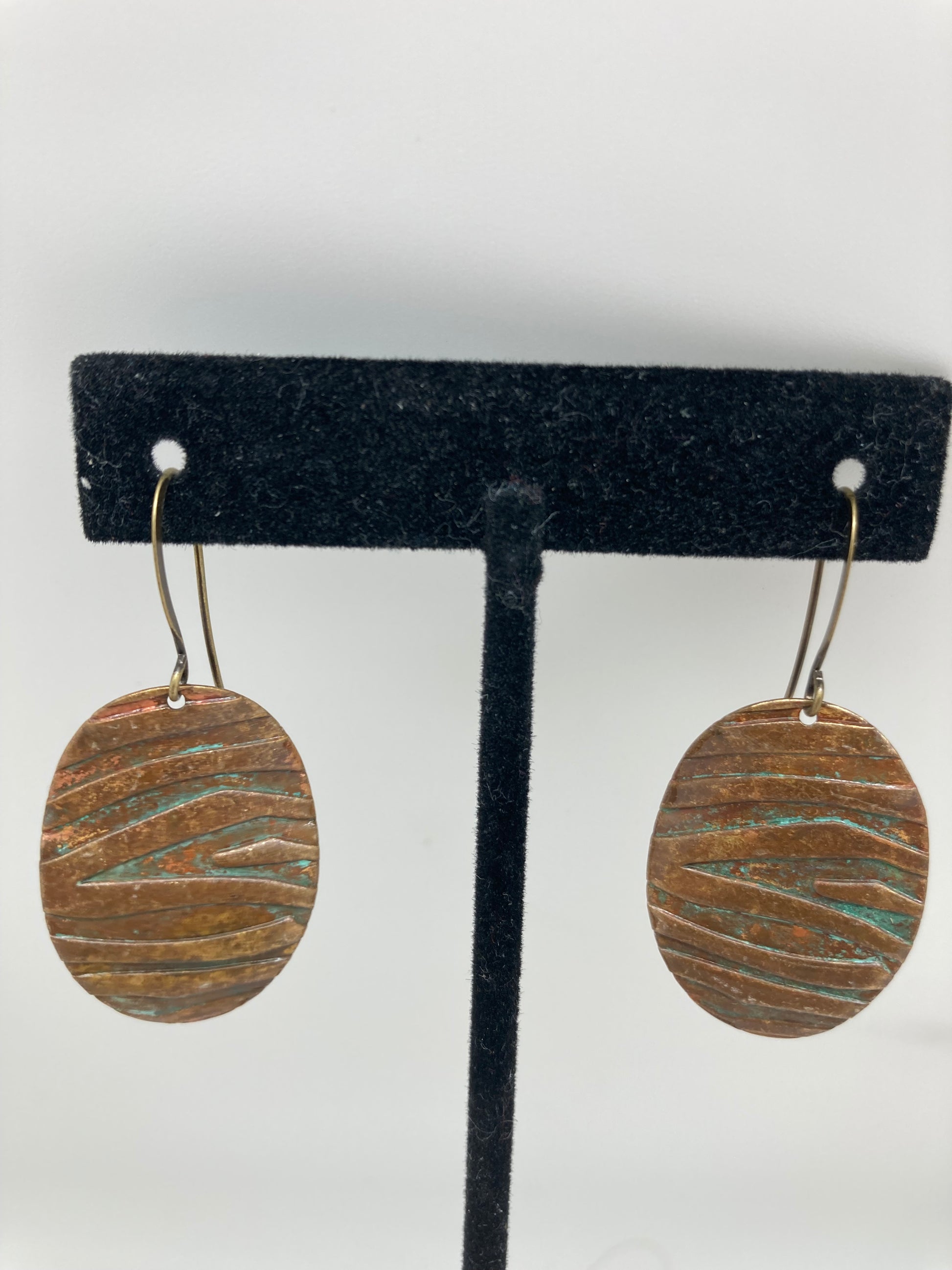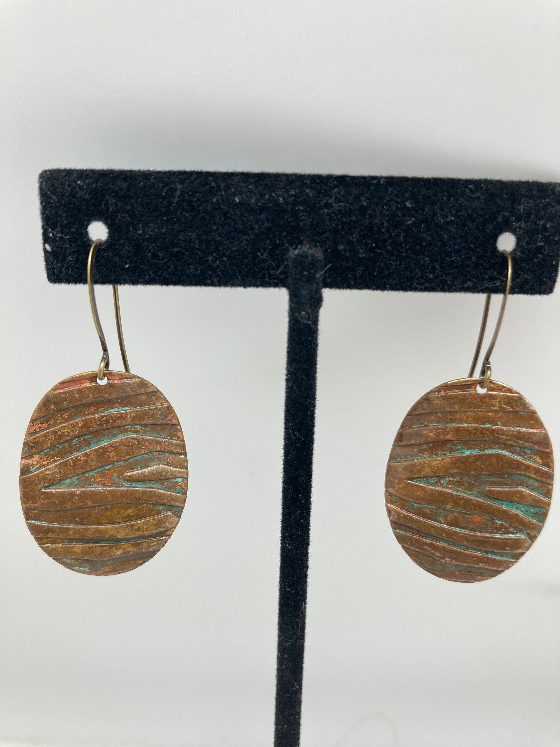 These antique brass medallions are stamped in a zebra pattern and given a subtle green patina finish.